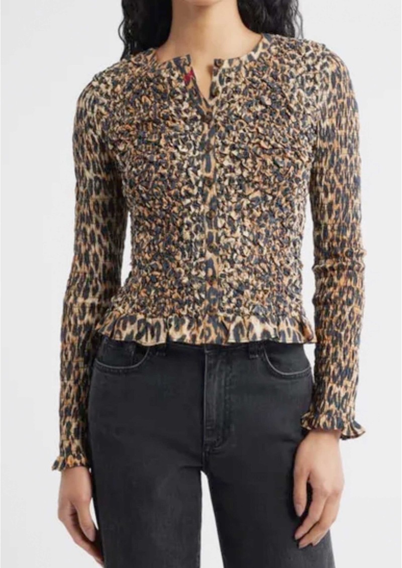 The Damson Madder Elliana Smocked Cardigan adds a playful, edgy twist to your knitwear collection. Made from 100% organic cotton, the smocked design flatters the natural shape, while the animal print adds a bold, standout touch. Featuring a button-front closure, jewel neckline, and elastic cuffs, it’s effortlessly wearable and perfect for layering over tees, camis, or dresses.