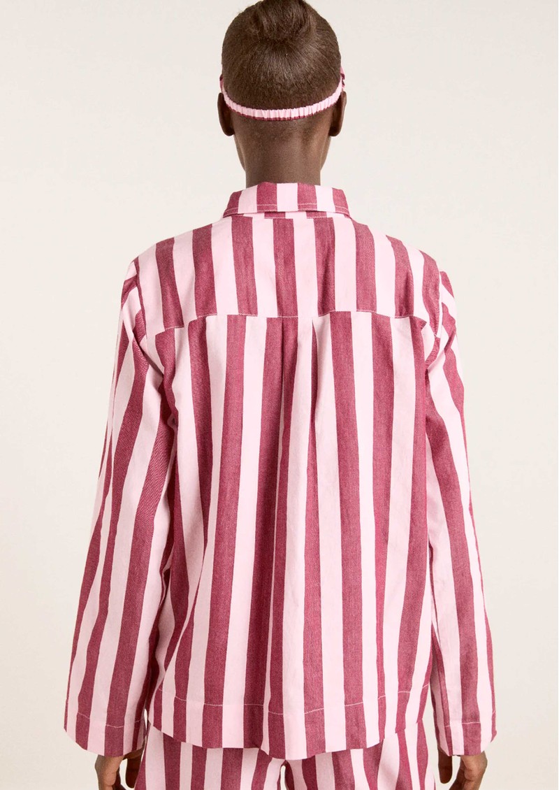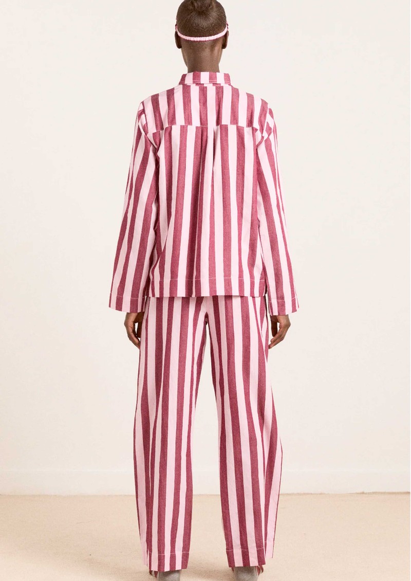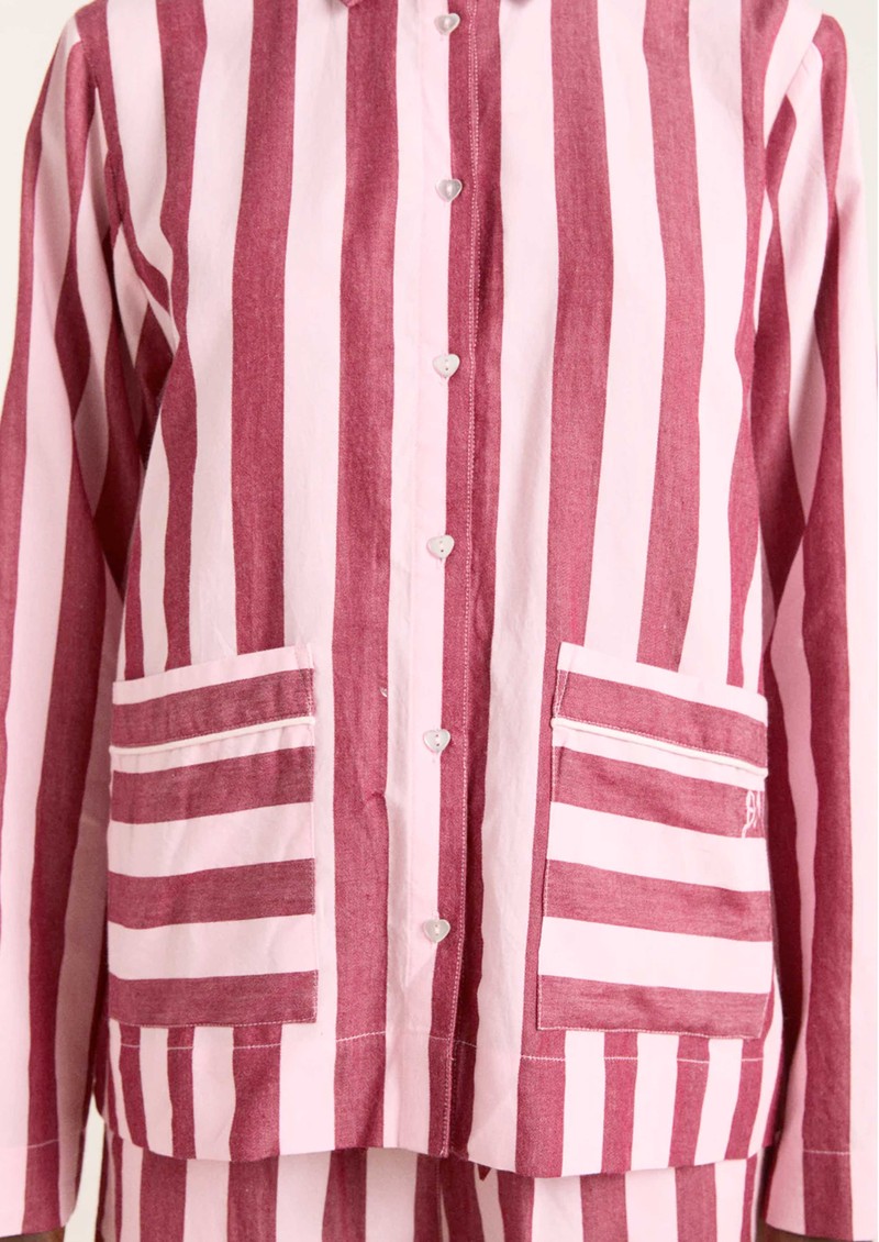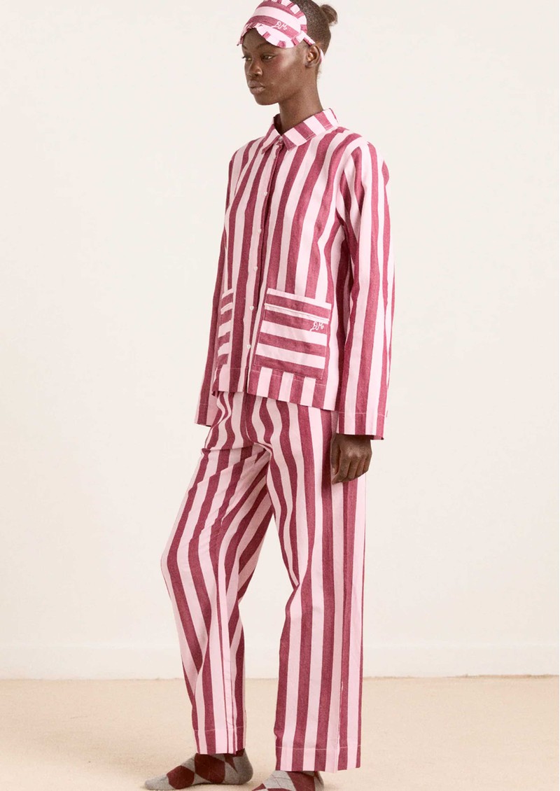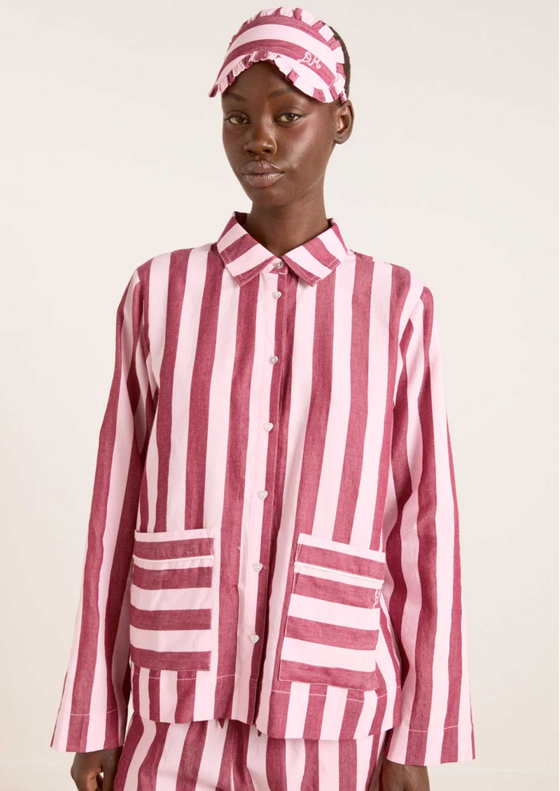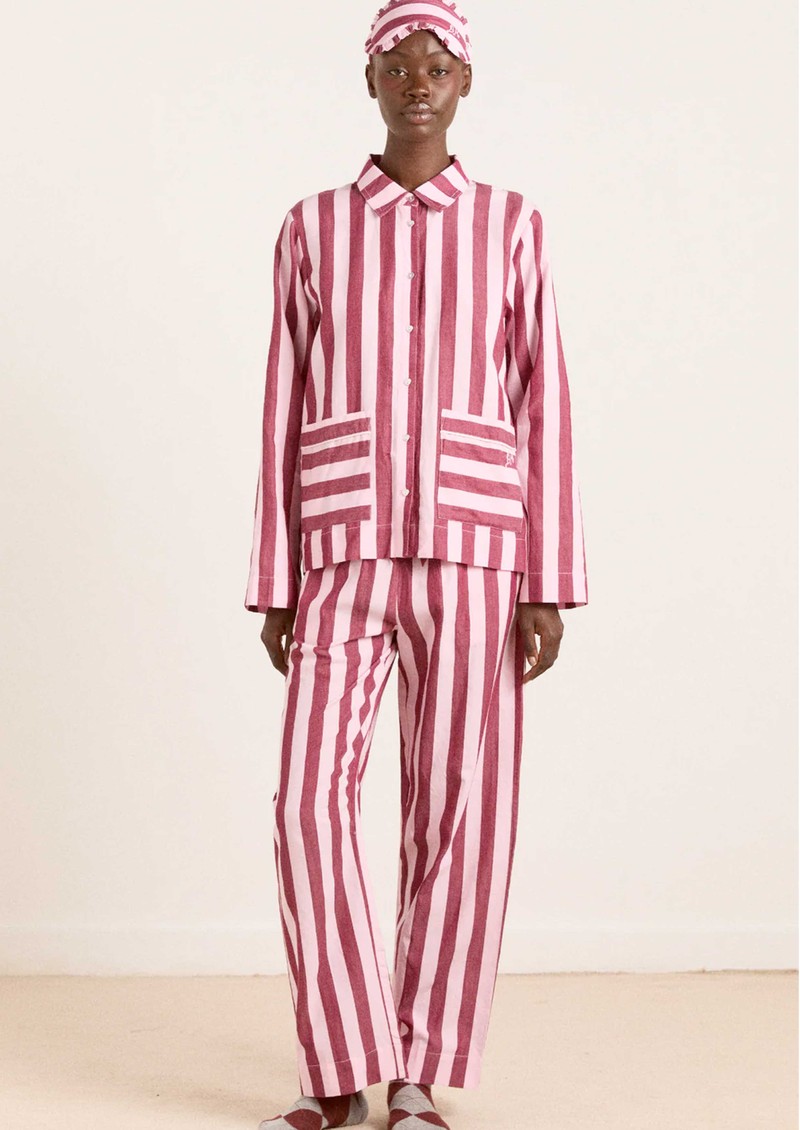 The Damson Madder Florie Pyjama Set features a timeless boxy shirt silhouette with a pointed collar and front button fastening, paired with relaxed, straight-leg trousers. Designed in a bold burgundy and pink stripe, it brings a playful twist to classic nightwear.