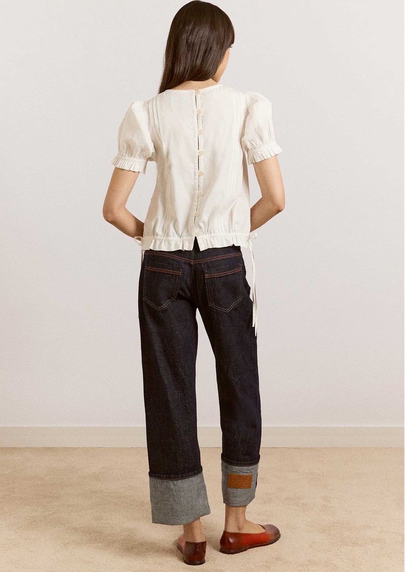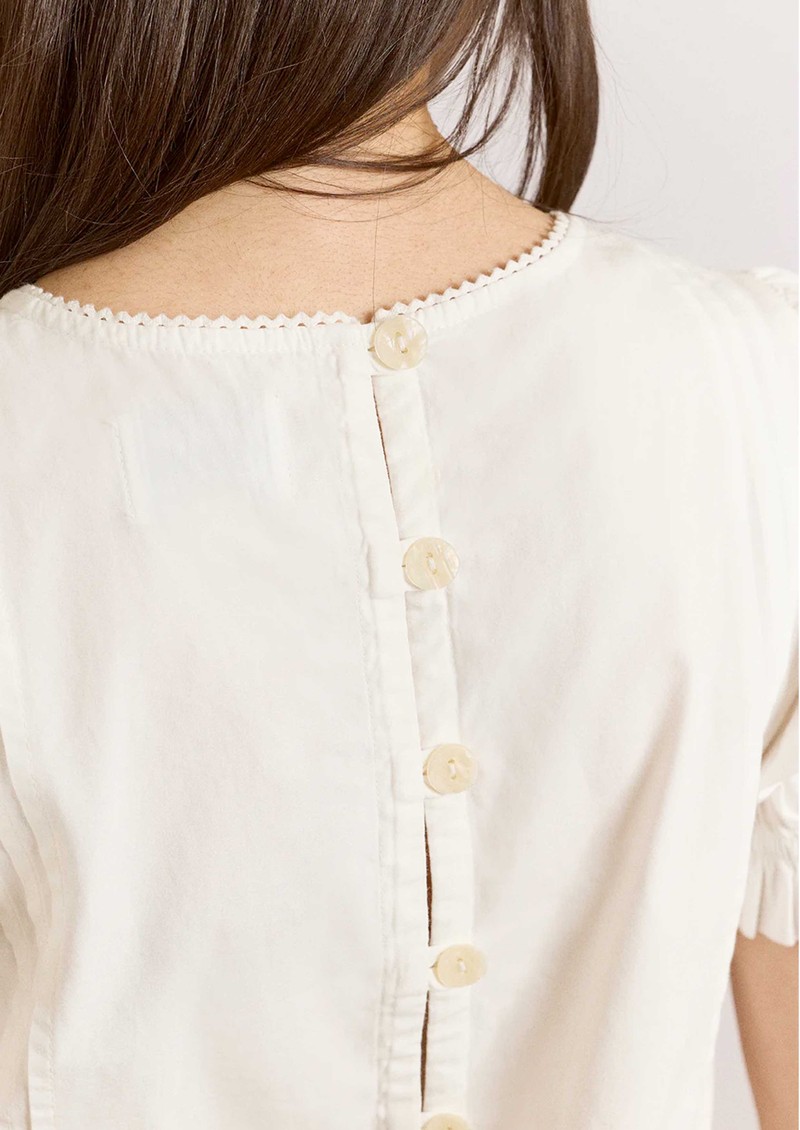Bring a romantic touch to everyday dressing with the Damson Madder Mabel Lace Insert blouse in white - a beautifully detailed piece crafted from crisp organic cotton poplin. Designed with puff sleeves, delicate filet lace panels, and intricate pintuck detailing, it’s finished with an adjustable drawcord waist and button-down back for a flattering, feminine silhouette.