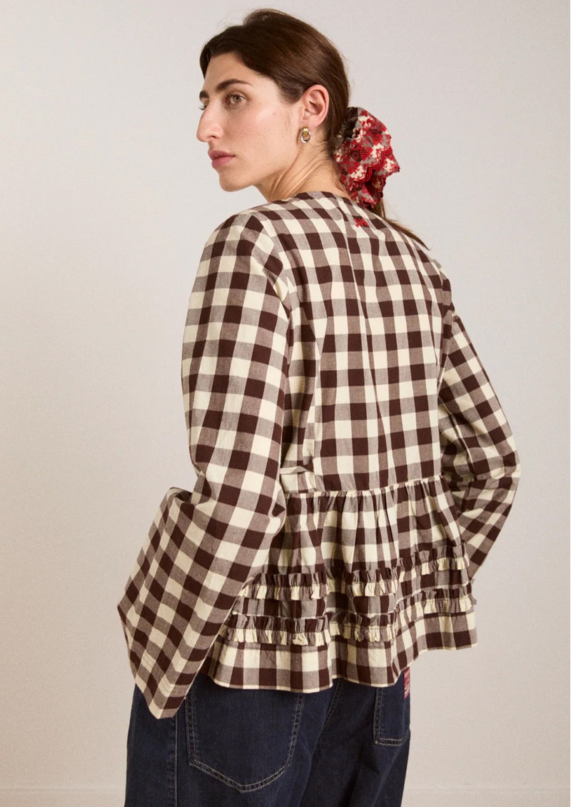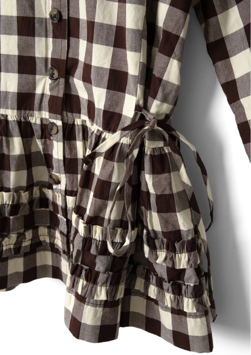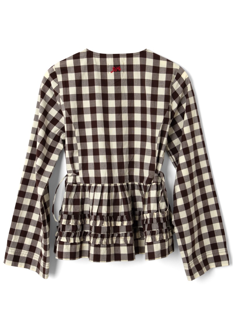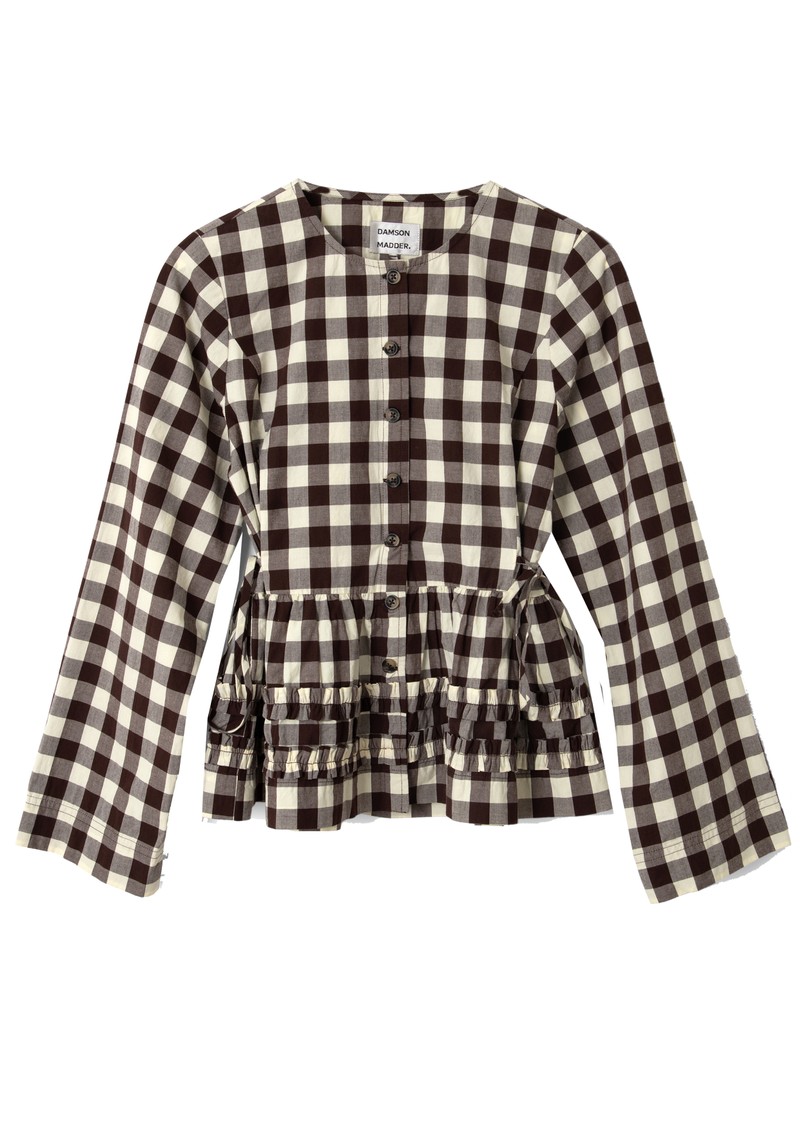 Introducing the gorgeous Madison Blouse from Damson Madder, designed in a classic brown butter gingham print. Made from 100% organic cotton, it has an adjustable tie waist and a pretty ruffled hemline. Other features include: