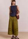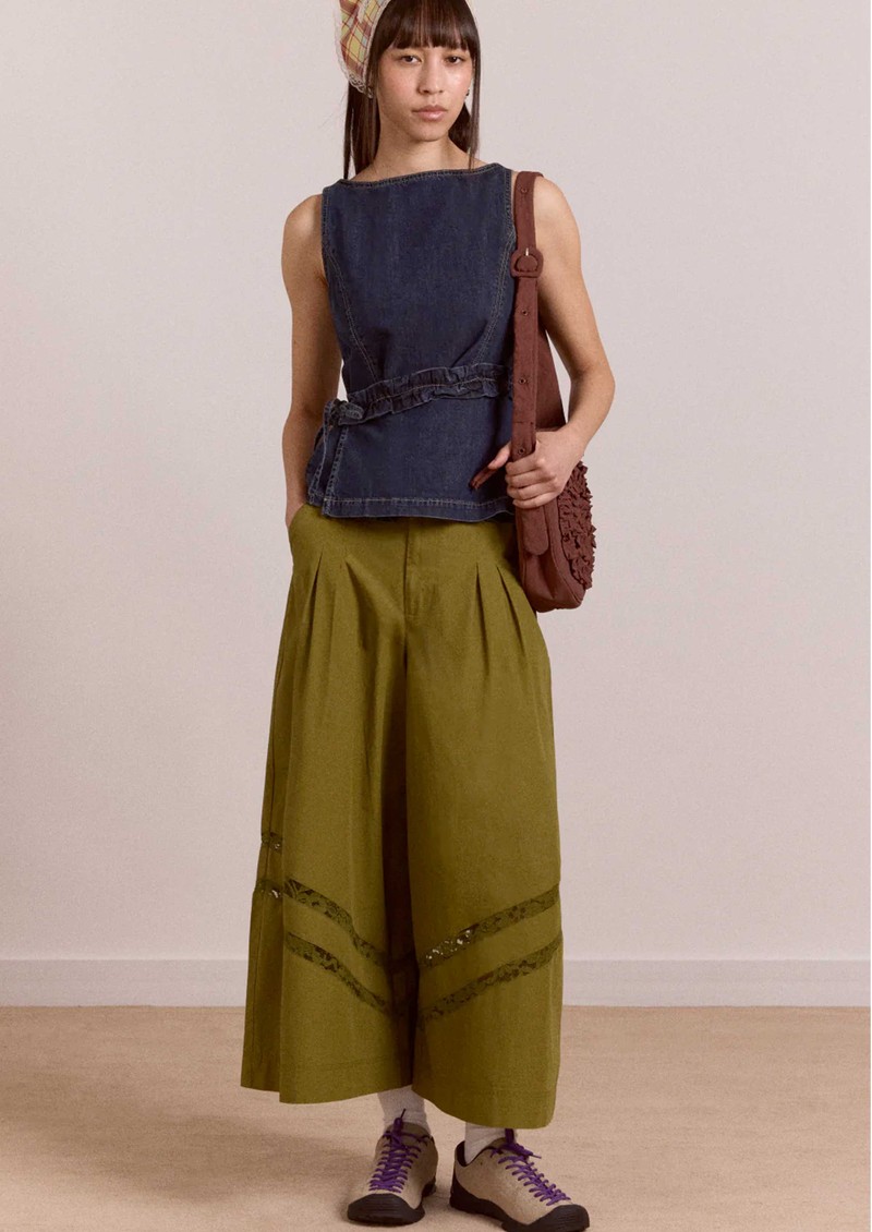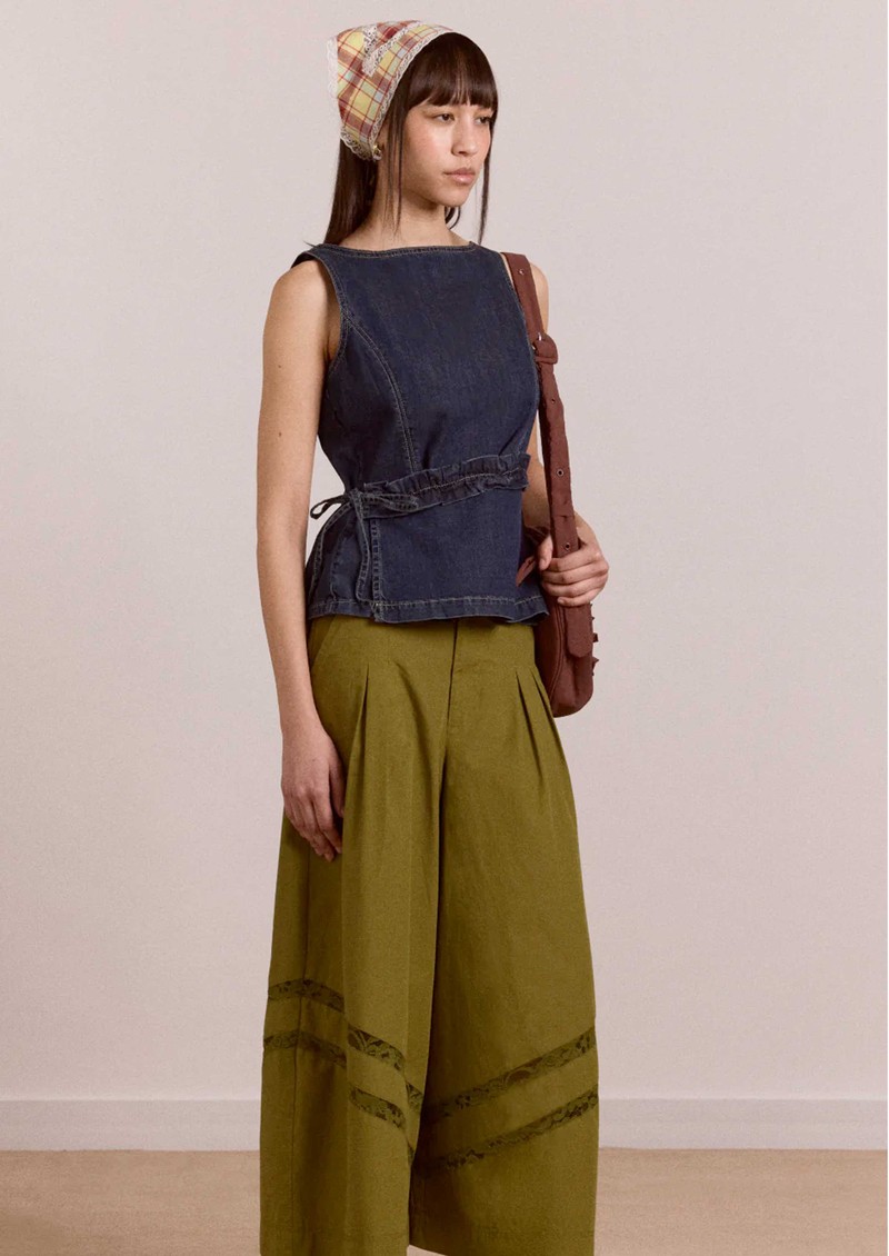 The Damson Madder Maxime Denim Top in indigo is a modern, sleeveless shell crafted from fluid organic cotton denim, designed with an asymmetrical wrap panel and a side frill tie to softly cinch the waist. Finished with ecru contrast stitching and a delicate back button fastening, it’s an elevated everyday piece with a directional edge.