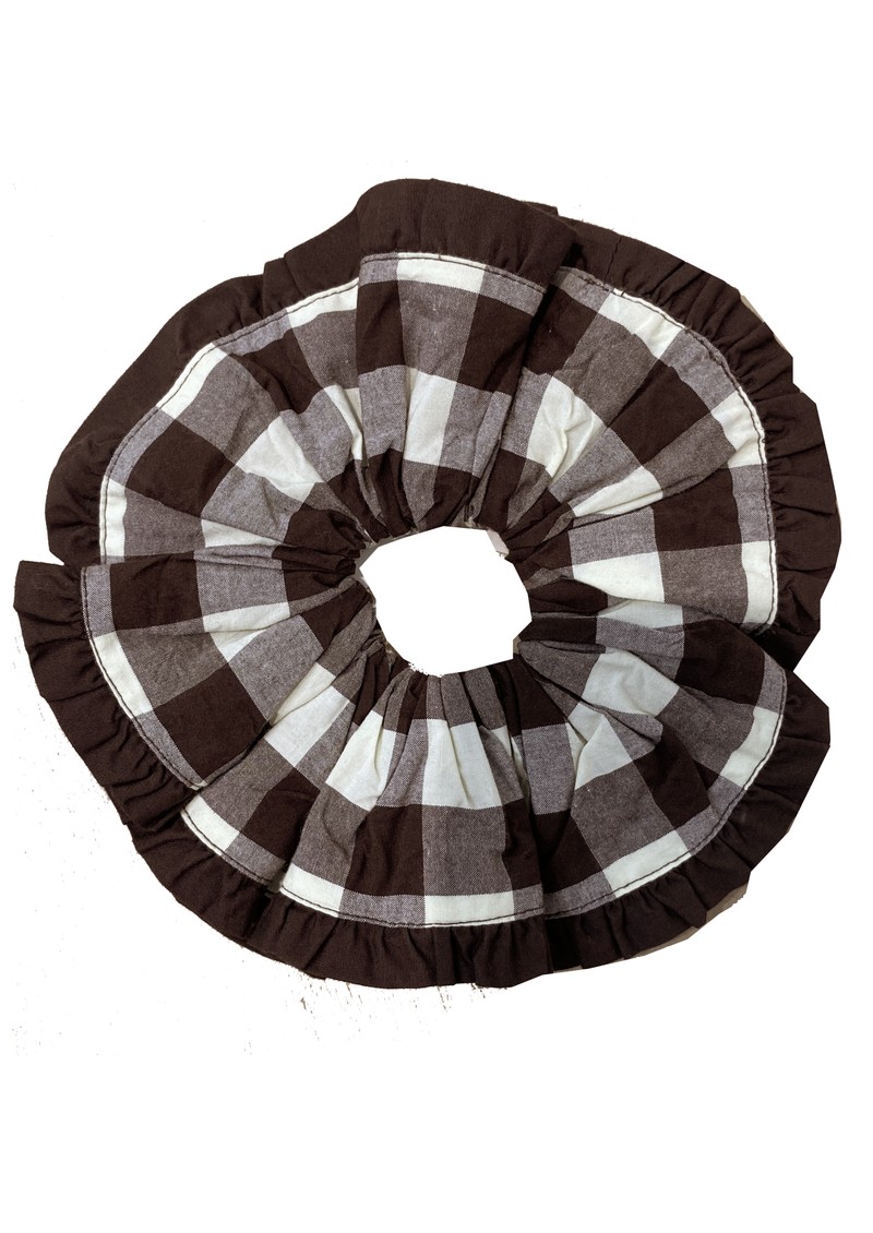Introducing the Frill Scrunchie from Damson Madder, designed in a gorgeous brown, butter gingham print. This oversized statement hair accessory will give your new season look an instant update. Designed in London, this scrunchie also features: