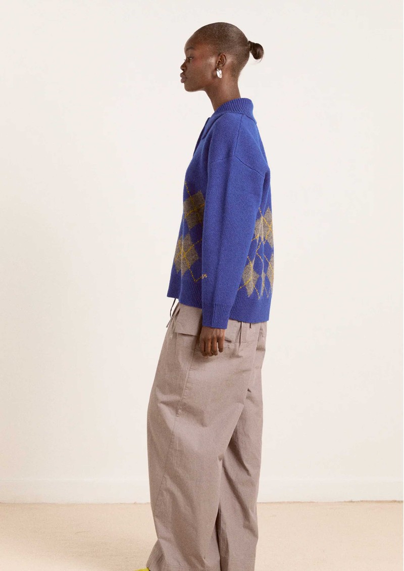 The Damson Madder Saskia Slouchy Rugby Jumper features a navy blue base accented with a grey argyle pattern for classic charm. It offers a relaxed fit with dropped shoulder seams, a pointed collar, central button closure at the neck, and ribbed edges for a cozy finish.