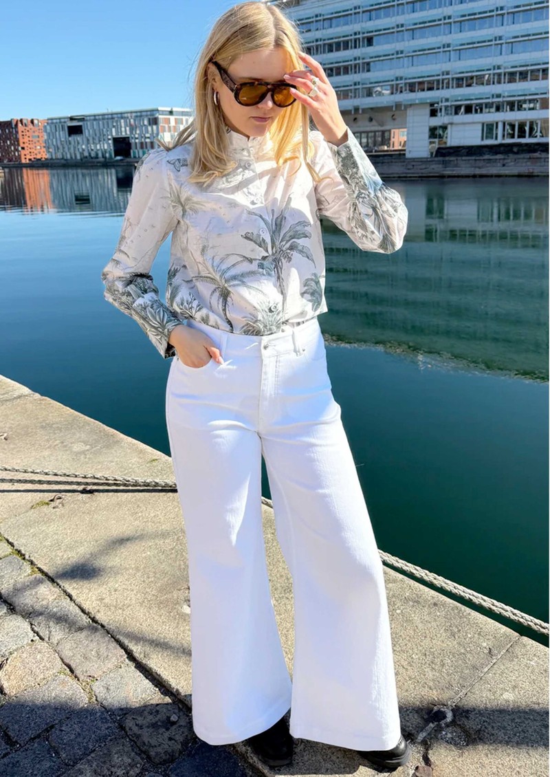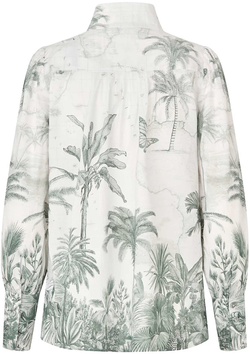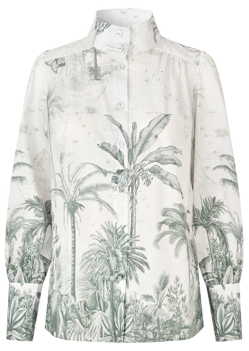 The Ameliedea dress by Dea Kudibal brings vintage elegance to life with a soft green palm print, a high stand collar, delicate tonal buttons, gently gathered shoulders and neat slim cuffs for a beautifully refined silhouette. Crafted from airy cotton voile, it feels light and breathable.