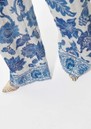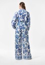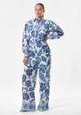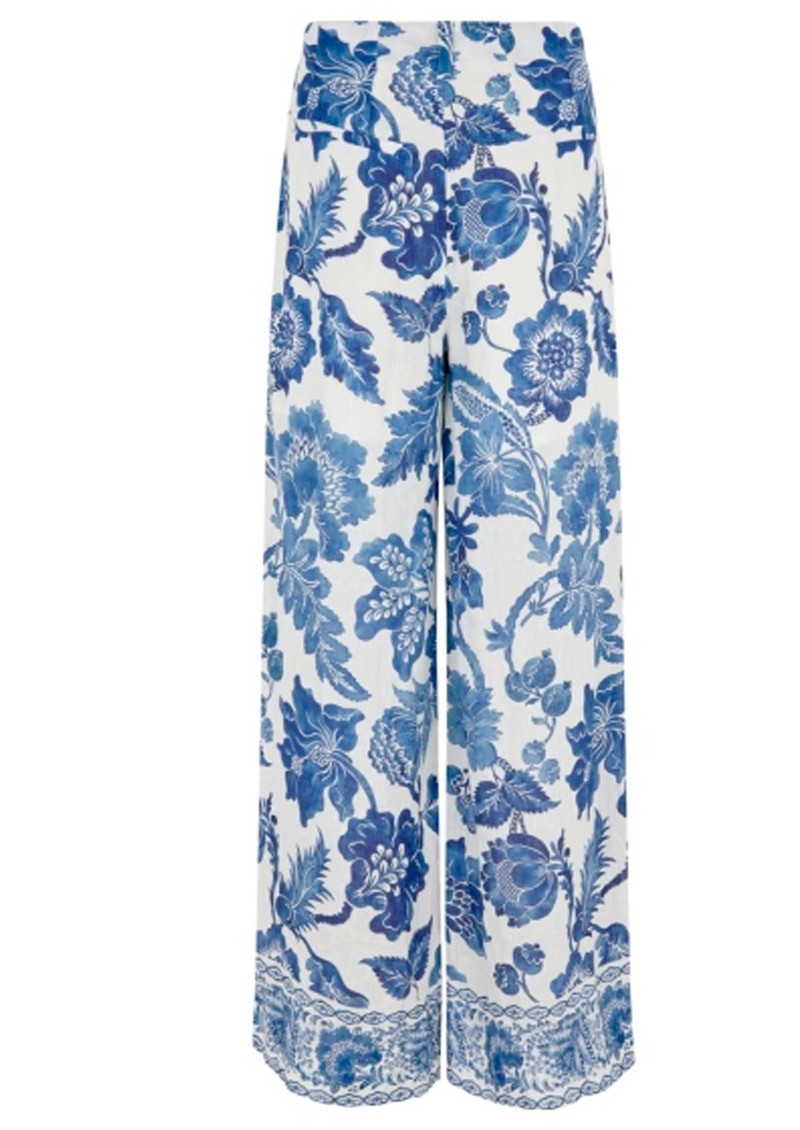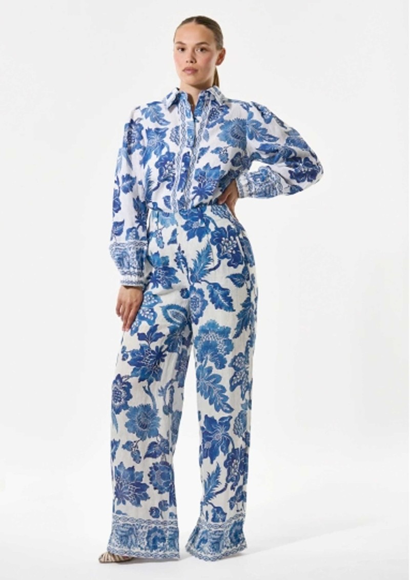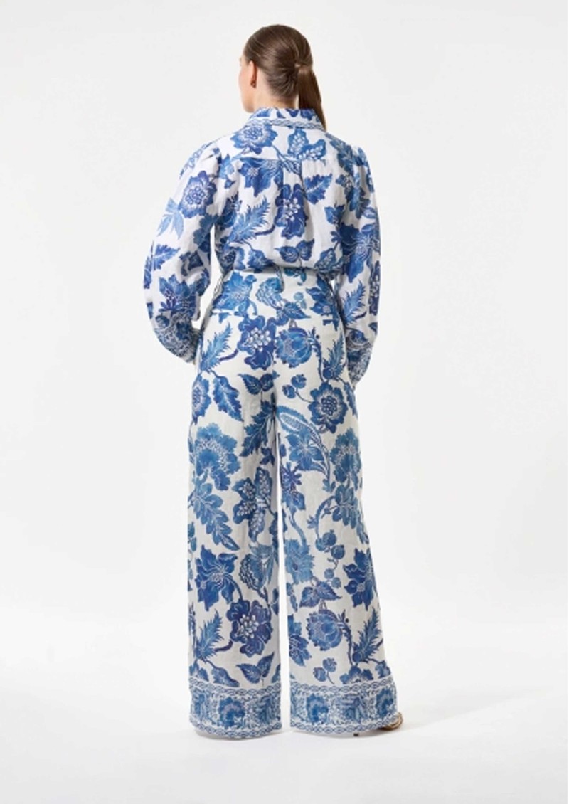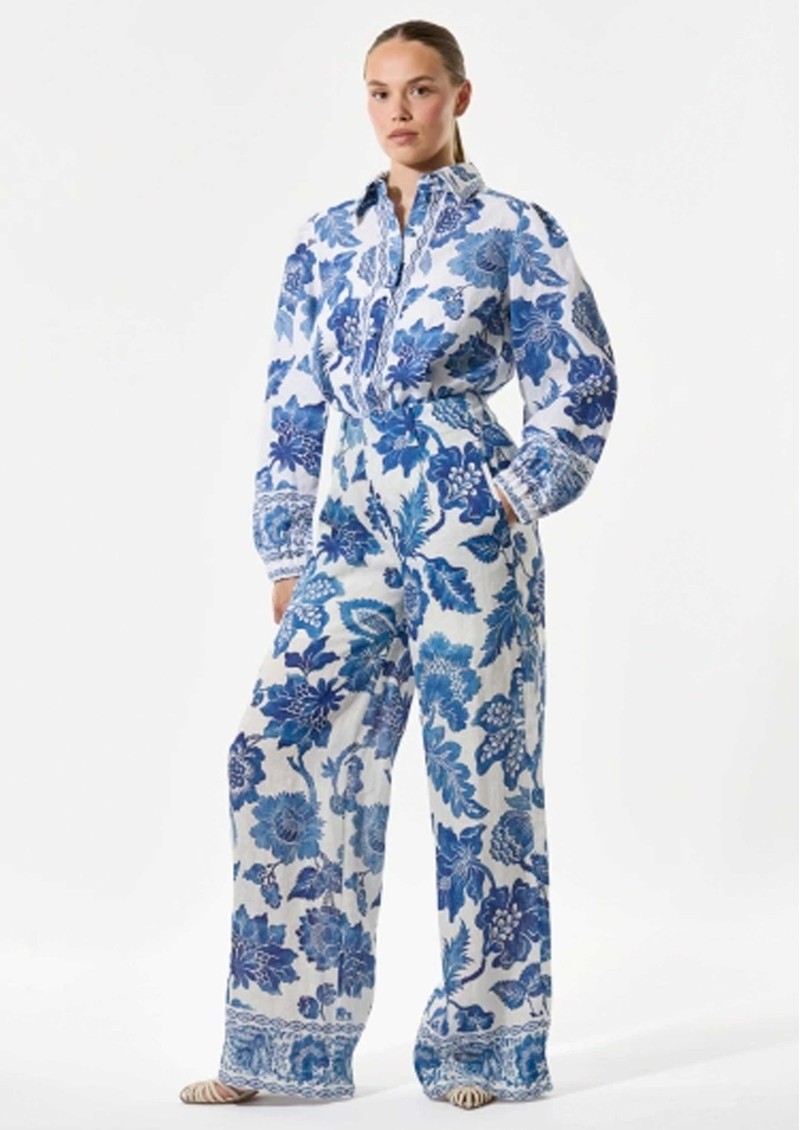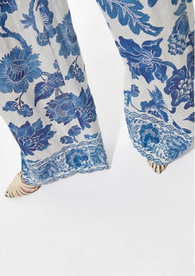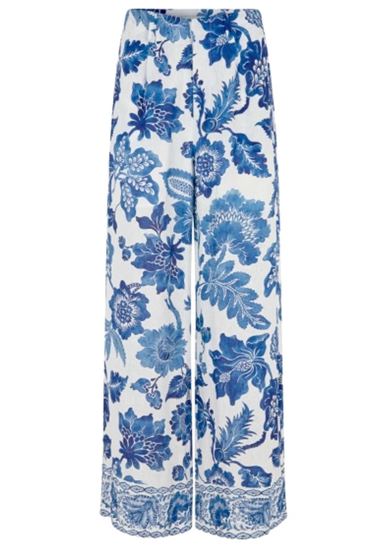 The Dea Kudibal Dabrinadea trousers in 'Blossoming' feature a high-rise, wide-leg silhouette with flattering pleat detailing, combining comfort and chic elegance. Part of the new-season Blue House collection, they are crafted from 100% linen and showcase an all-over floral print in shades of white, orange, and black, inspired by Danish ceramic artist Bjørn Wiinblad and his enchanting Blue House near Copenhagen.