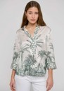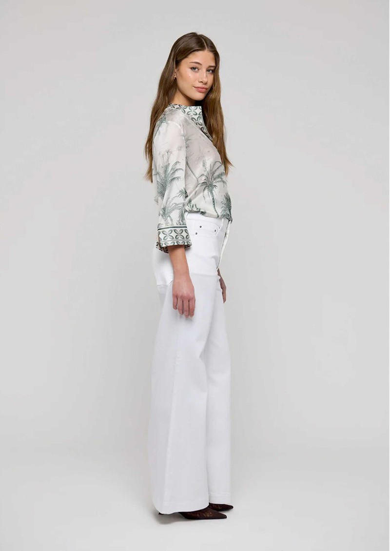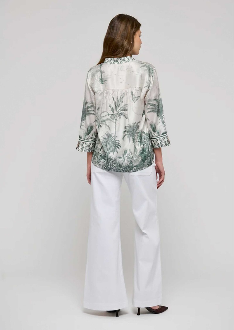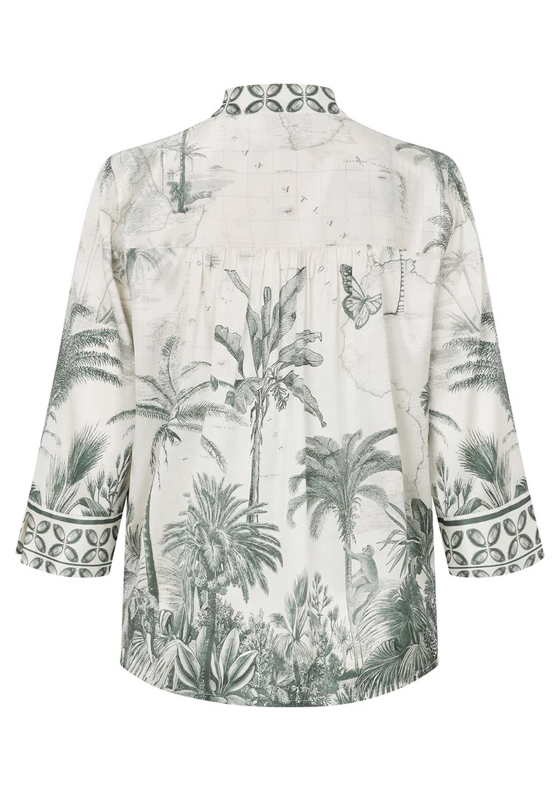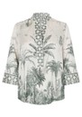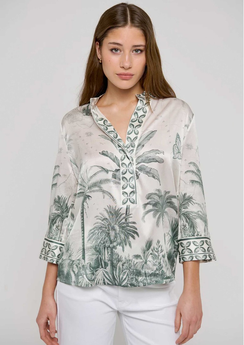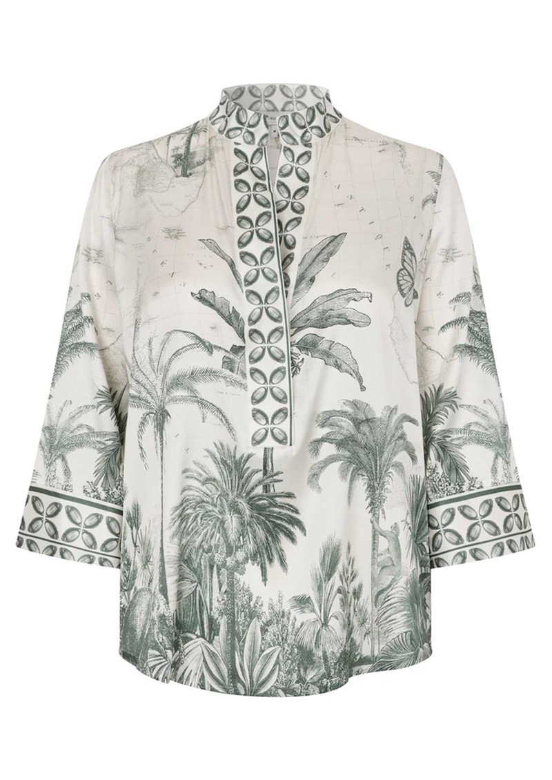 The Dea Kudibal DaintyDea Silk Blouse in Empire Army brings a refined, modern feel with a soft graphic print and an easy elegance in its relaxed silhouette. Cut in stretch silk twill, it features a small stand collar, crossover placket, and 3/4 sleeves with deep slit cuffs for a polished yet effortless finish.