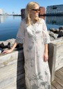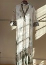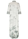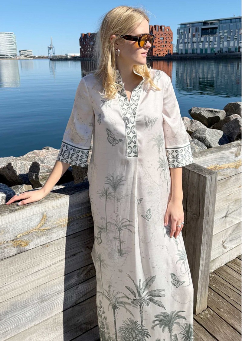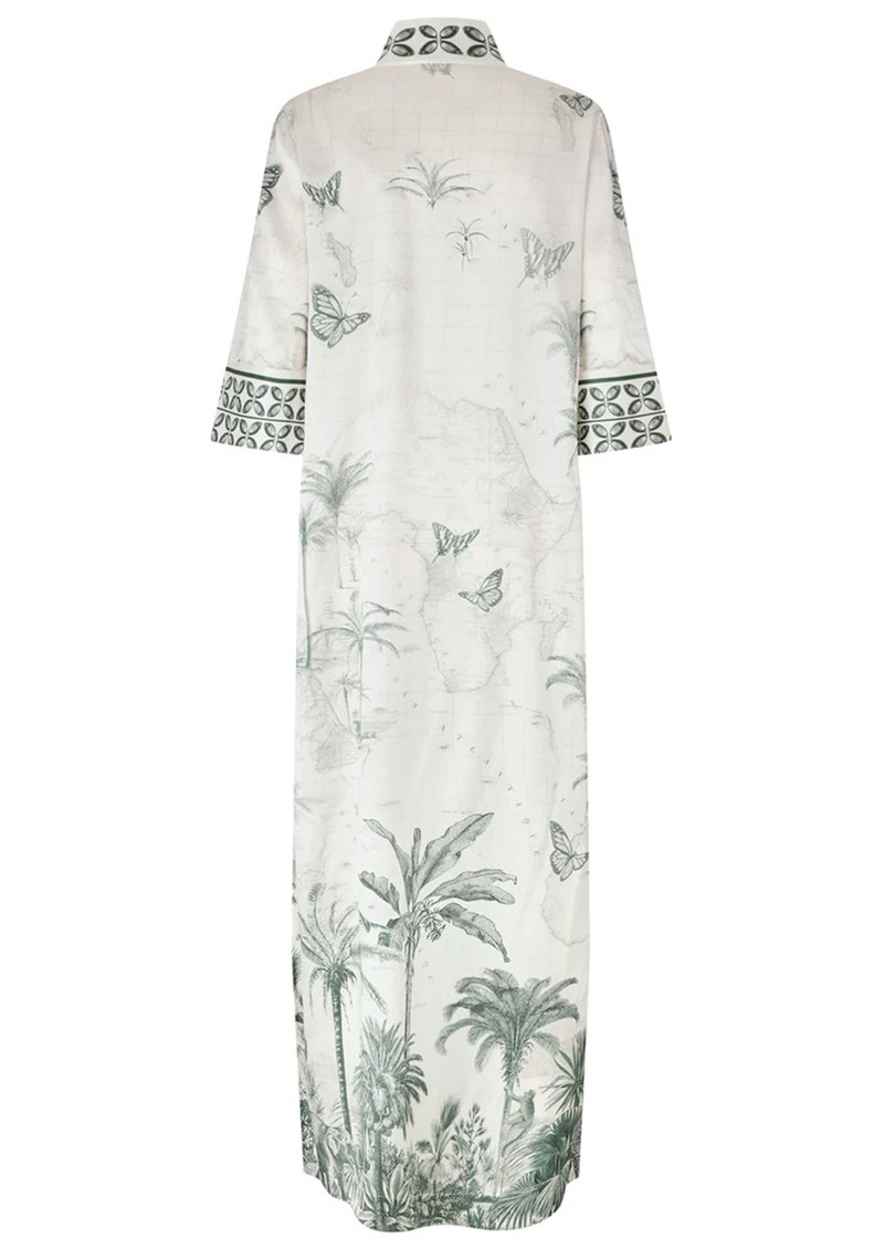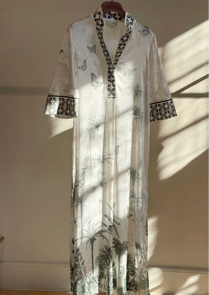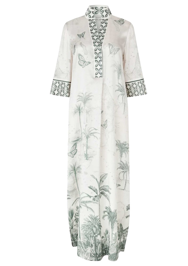 The Dea Kudibal Helga Dress in Empire Army reimagines a signature silhouette with an intricate vintage-inspired tropical print, bringing a bold yet refined energy to its flowing maxi shape. Cut in the brand’s signature stretch silk, it features a soft kaftan-style drape, high mandarin collar, crossover front detail, and wide 3/4 sleeves for an effortlessly elegant finish.