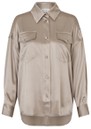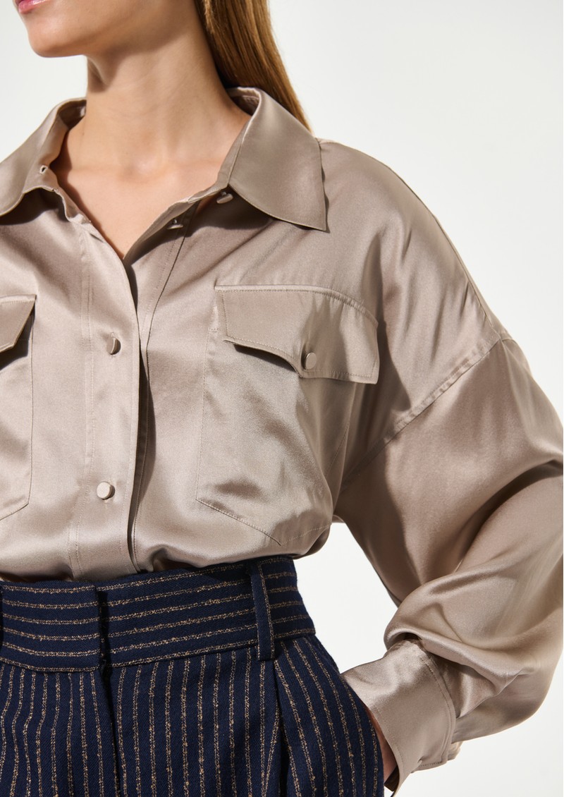 The KammaDea shirt by Dea Kudibal is a stunning piece crafted from fluid stretch silk twill in a timeless neutral hue. Featuring a classic collar, dropped shoulders, chest flap pockets, full-length sleeves with wide cuffs, it offers effortless elegance with a relaxed silhouette.