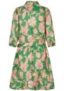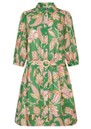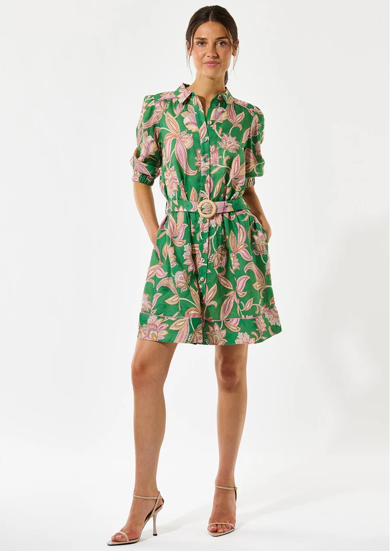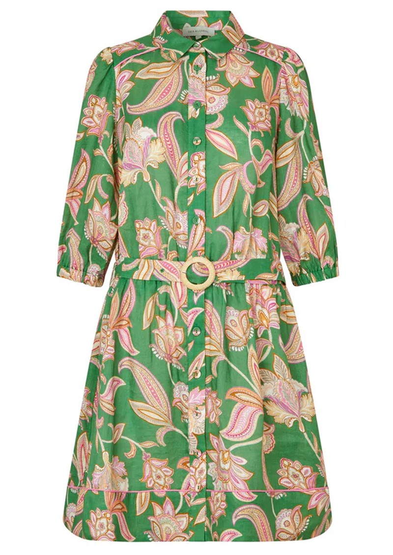 The Dea Kudibal Marydea Dress in Paisley Green is a chic and effortless summer staple. Crafted from lightweight linen, this shirt dress features a bold green paisley print, a classic pointed collar, button closure, and finishes just above the knee. A self-fabric belt with a raffia buckle adds retro charm, while contrast piping at the hem and shoulders elevates the luxurious detailing.