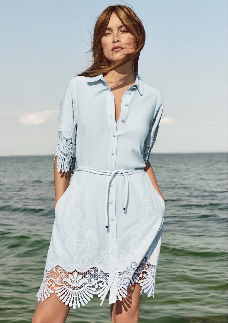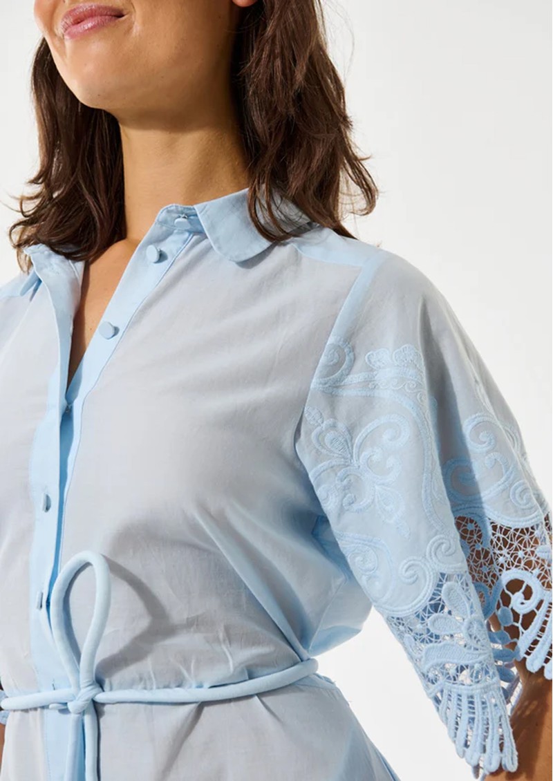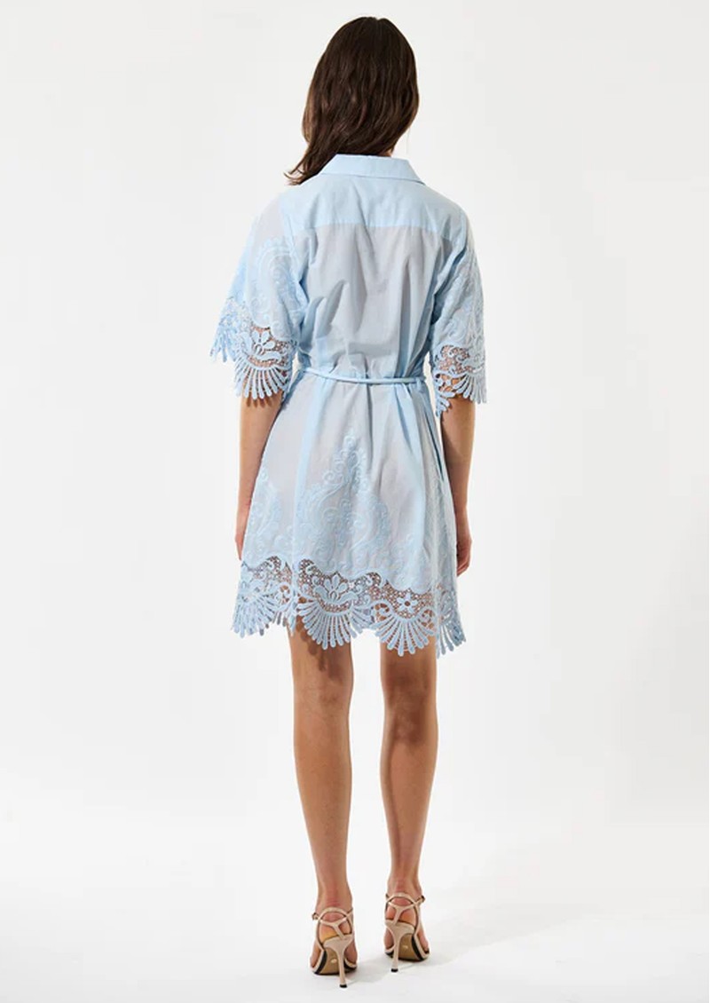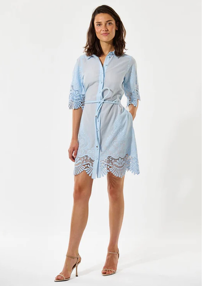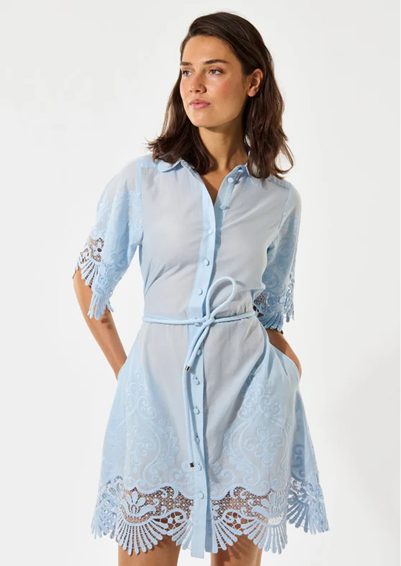 The Dea Kudibal Maryella Dress in Skyway is a charming summer statement piece, crafted from 100% cotton with delicate embroidered detailing. Trimmed with scalloped lace at the hem and cuffs, it features a front button fastening, a self-fabric cord belt to cinch the waist, and finishes above the knee for a flattering silhouette.