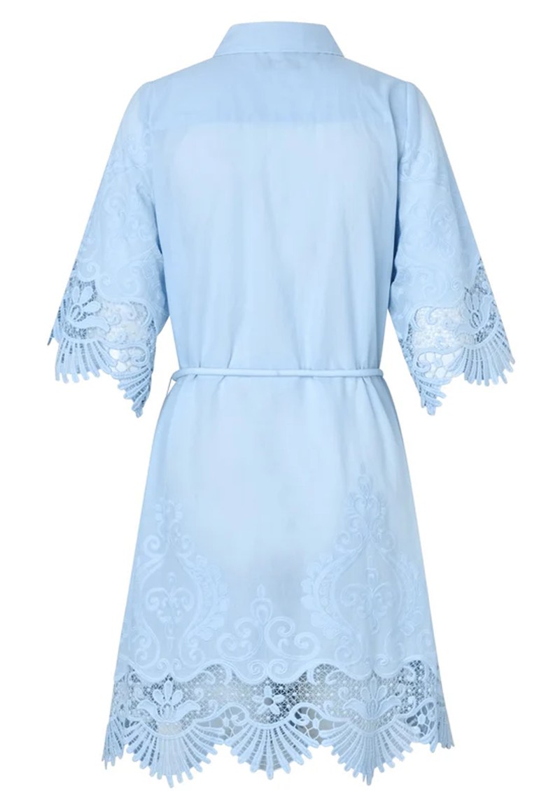- Scalloped lace trims at hem and cuffs