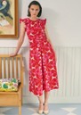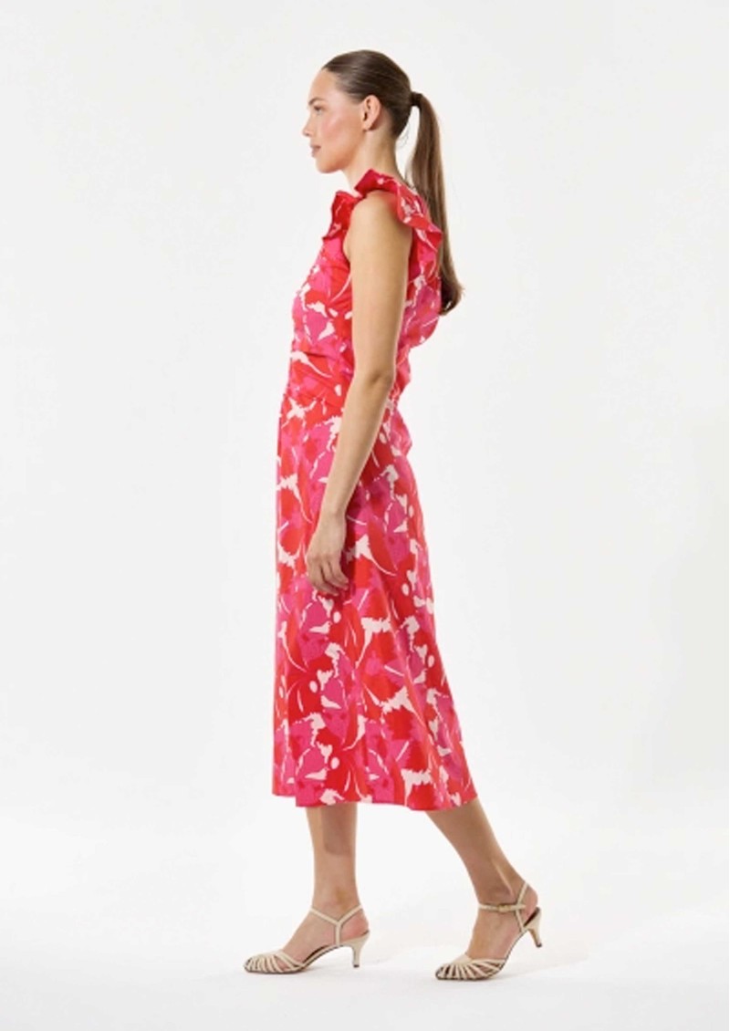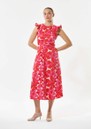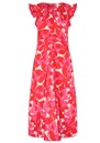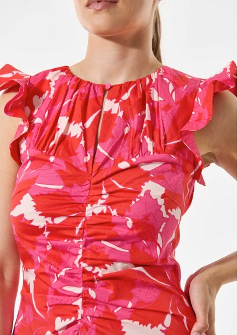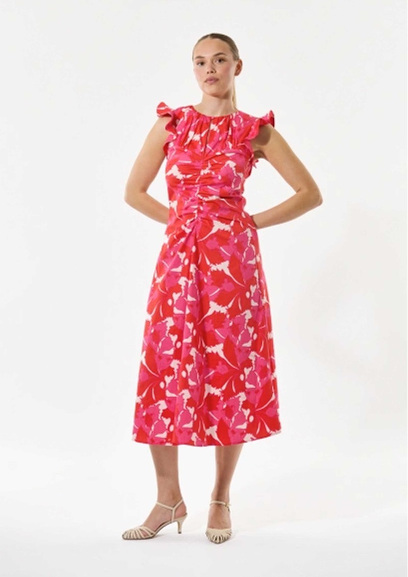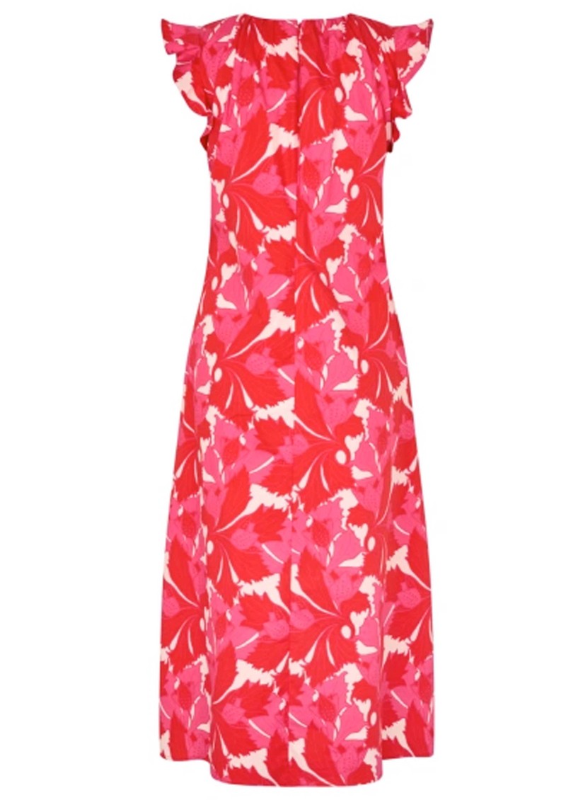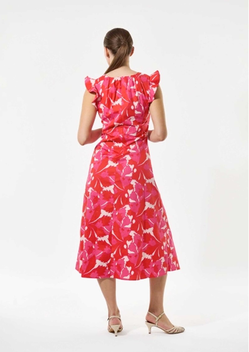 The Dea Kudibal Ofeliadea dress is a softly flowing midi silhouette, designed with a rounded neckline, flutter cap sleeves, and gentle centre gathering that enhances the waist. Finished in an all-over warm pink and red abstract print, it offers an elegant balance of comfort and statement style for day or evening wear.