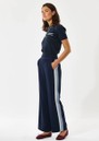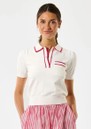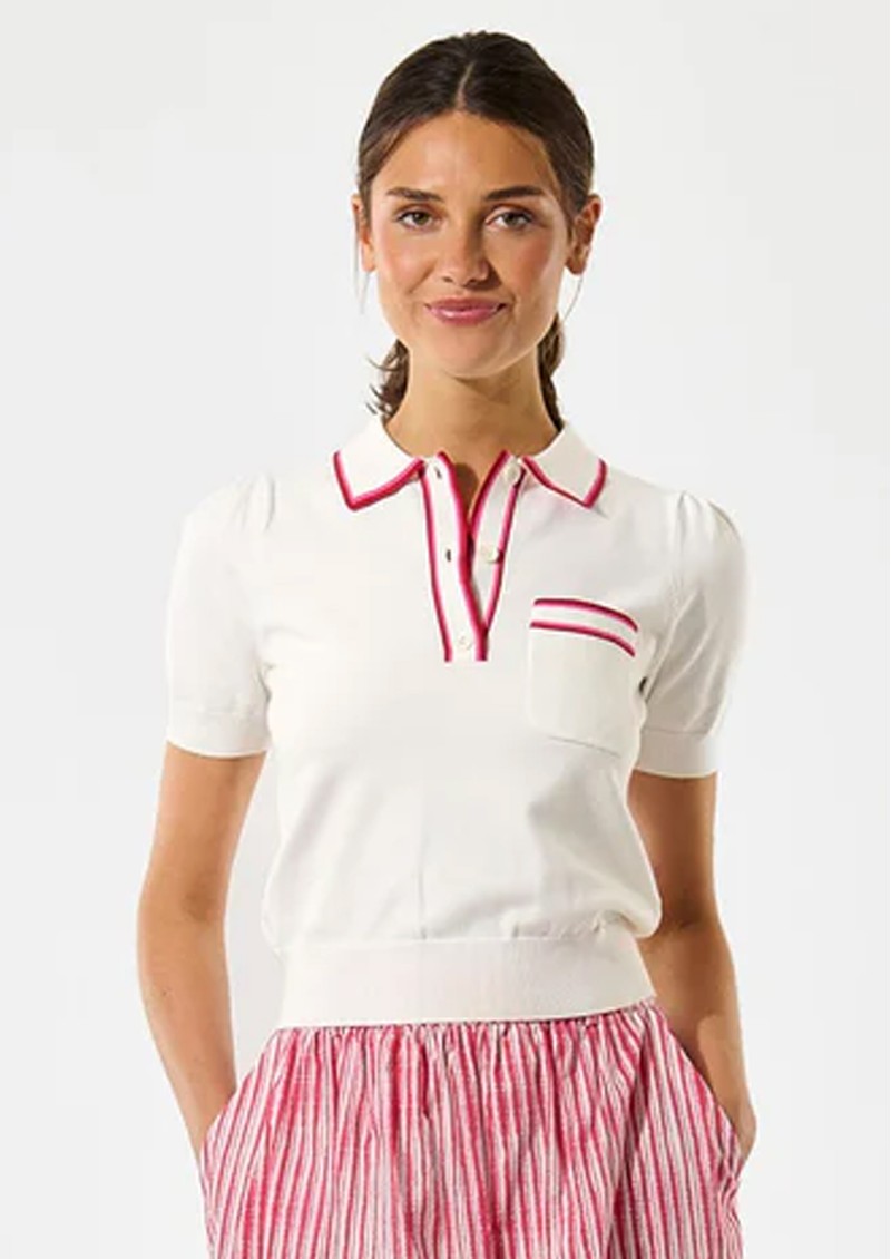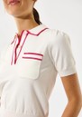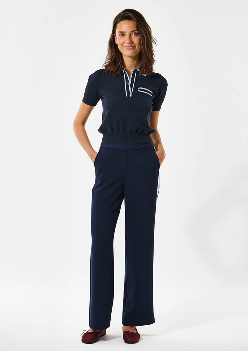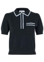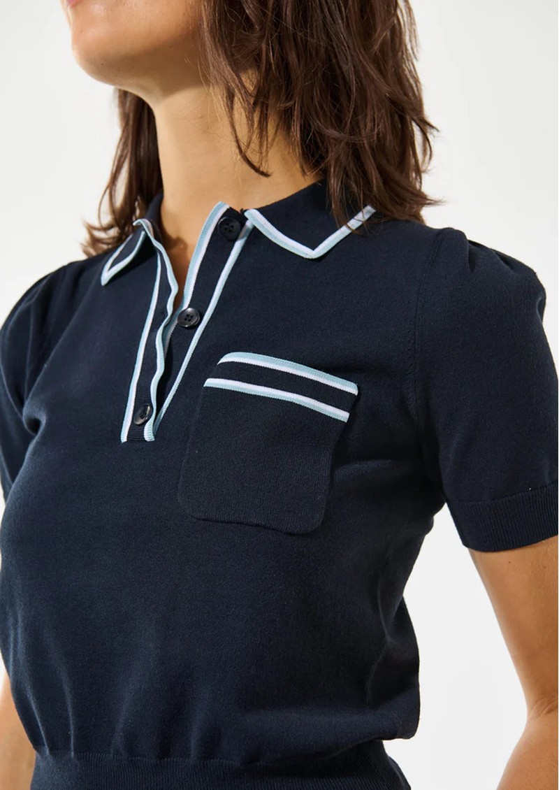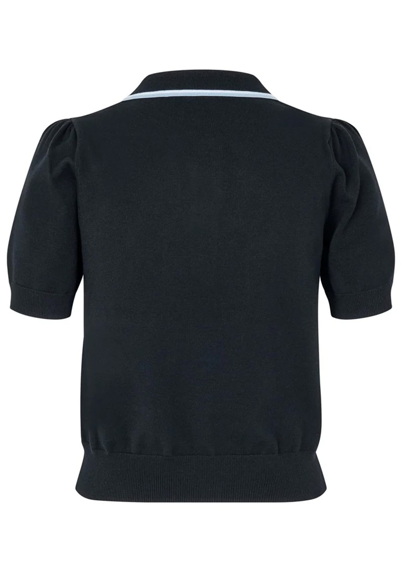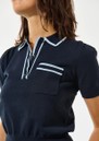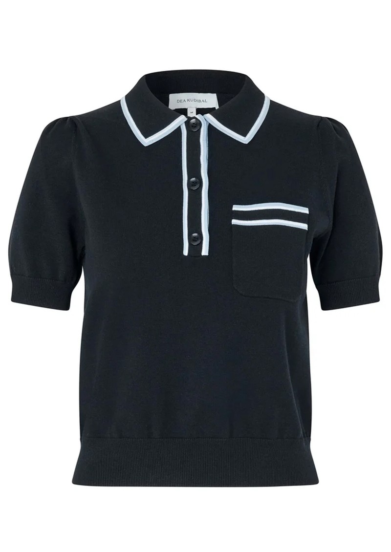 The Dea Kudibal Palomadea Polo in Ink offers a sleek, modern take on sporty-chic style. Made from a soft viscose blend, this slim-fit knitted top hugs the body, featuring ribbed hems at the waist and cuffs. Light blue contrast stripes detail the collar, button placket, and chest pocket, adding a fresh, contemporary touch.