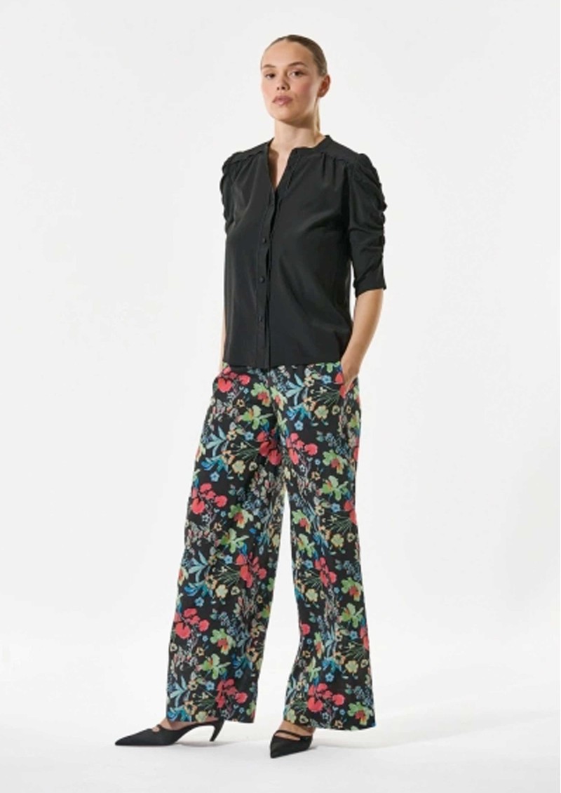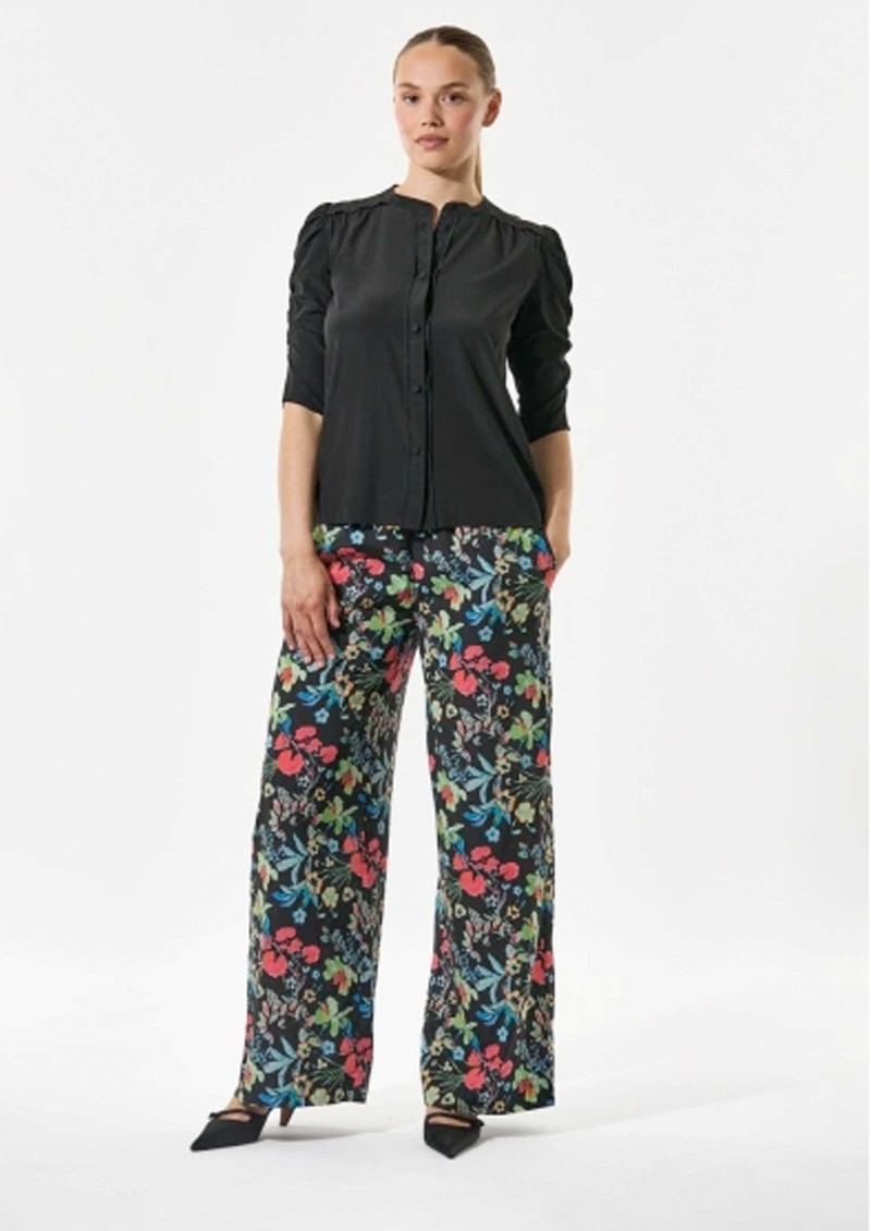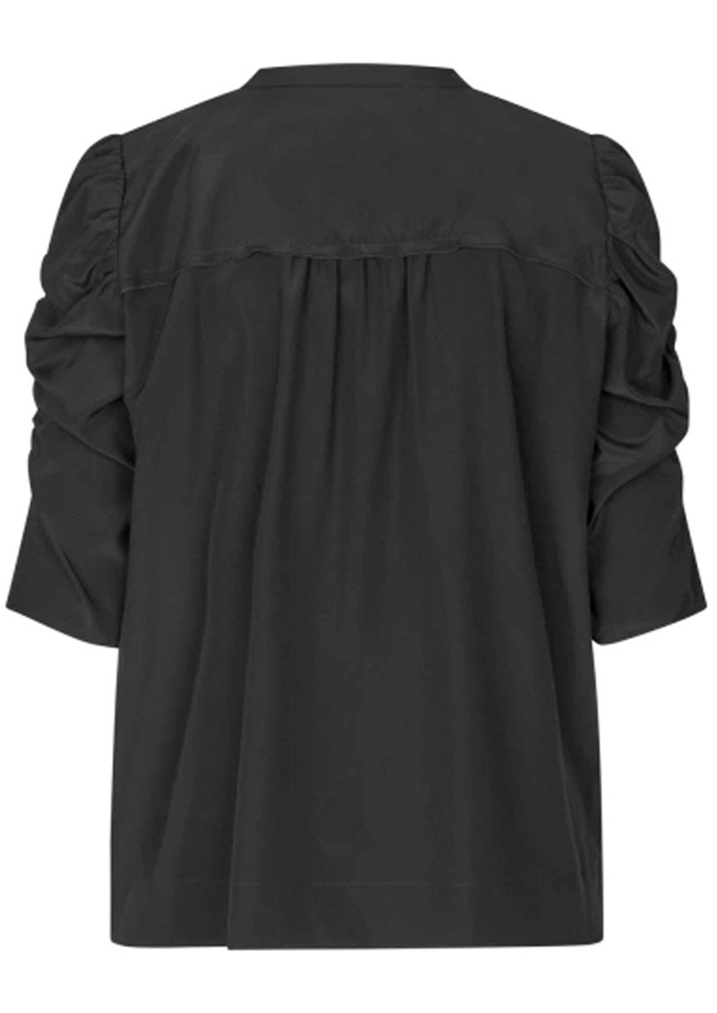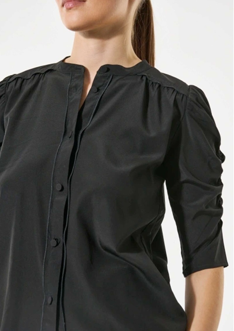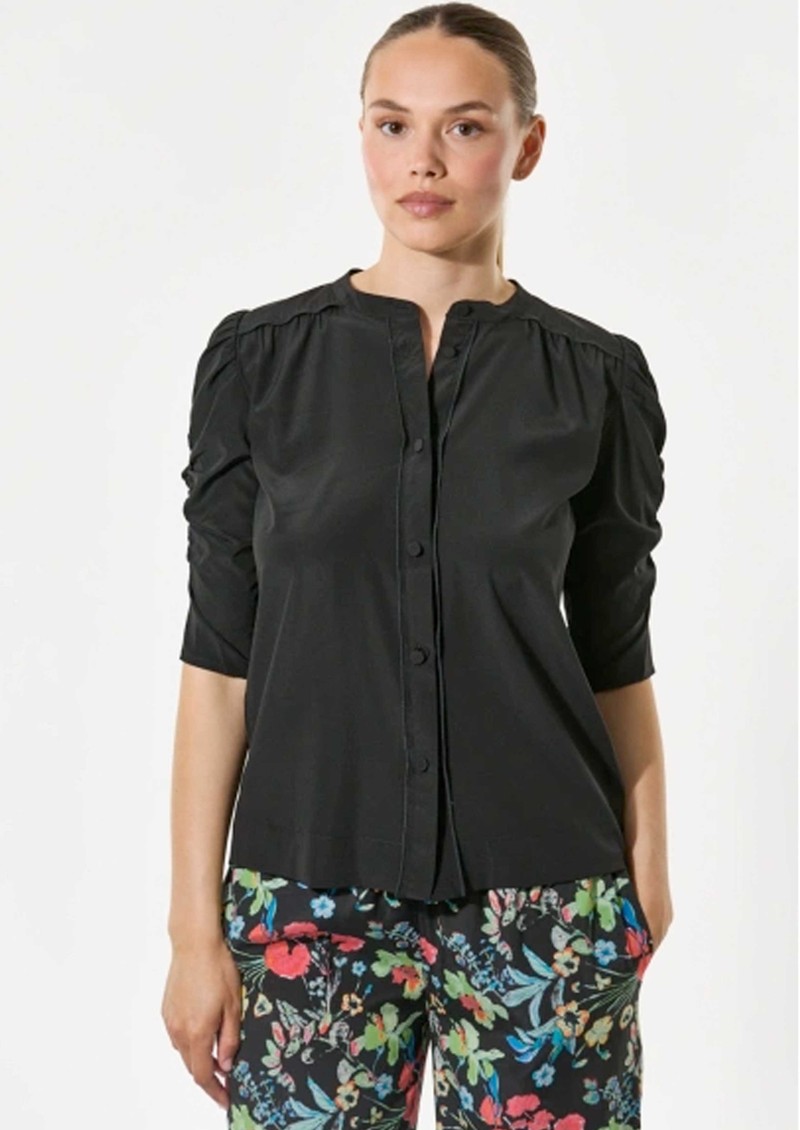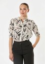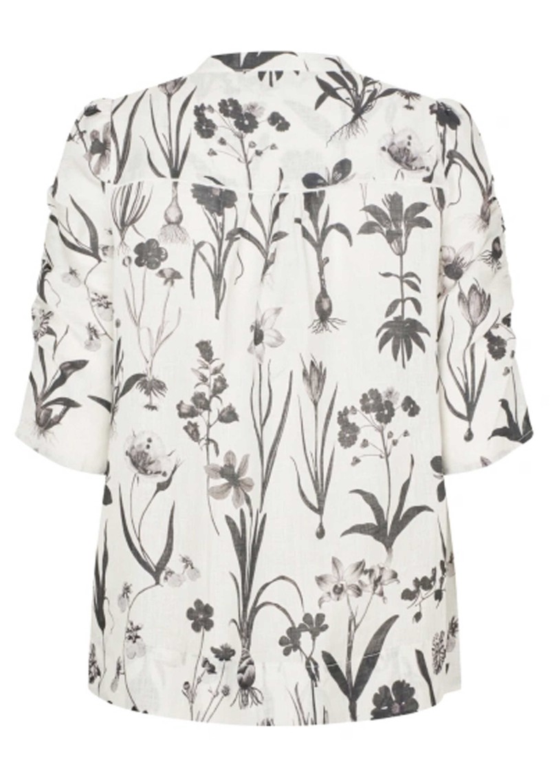 The Dea Kudibal Rafaeladea in ‘Flower Seeds’ showcases a crisp white base adorned with a striking black floral print. This short-sleeved shirt features elbow-length sleeves with subtle gathering, a central button closure, and a timeless boxy silhouette for effortless, modern elegance.