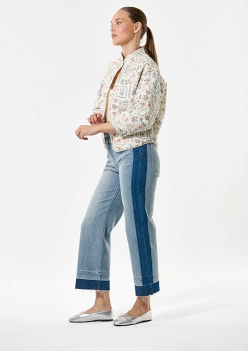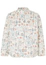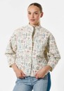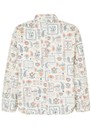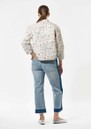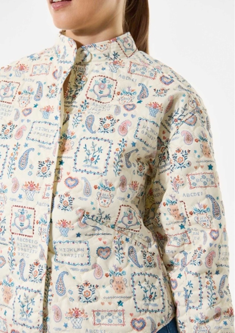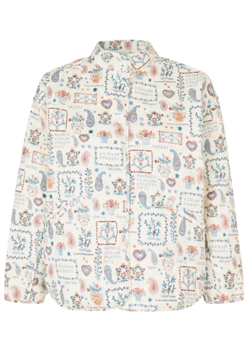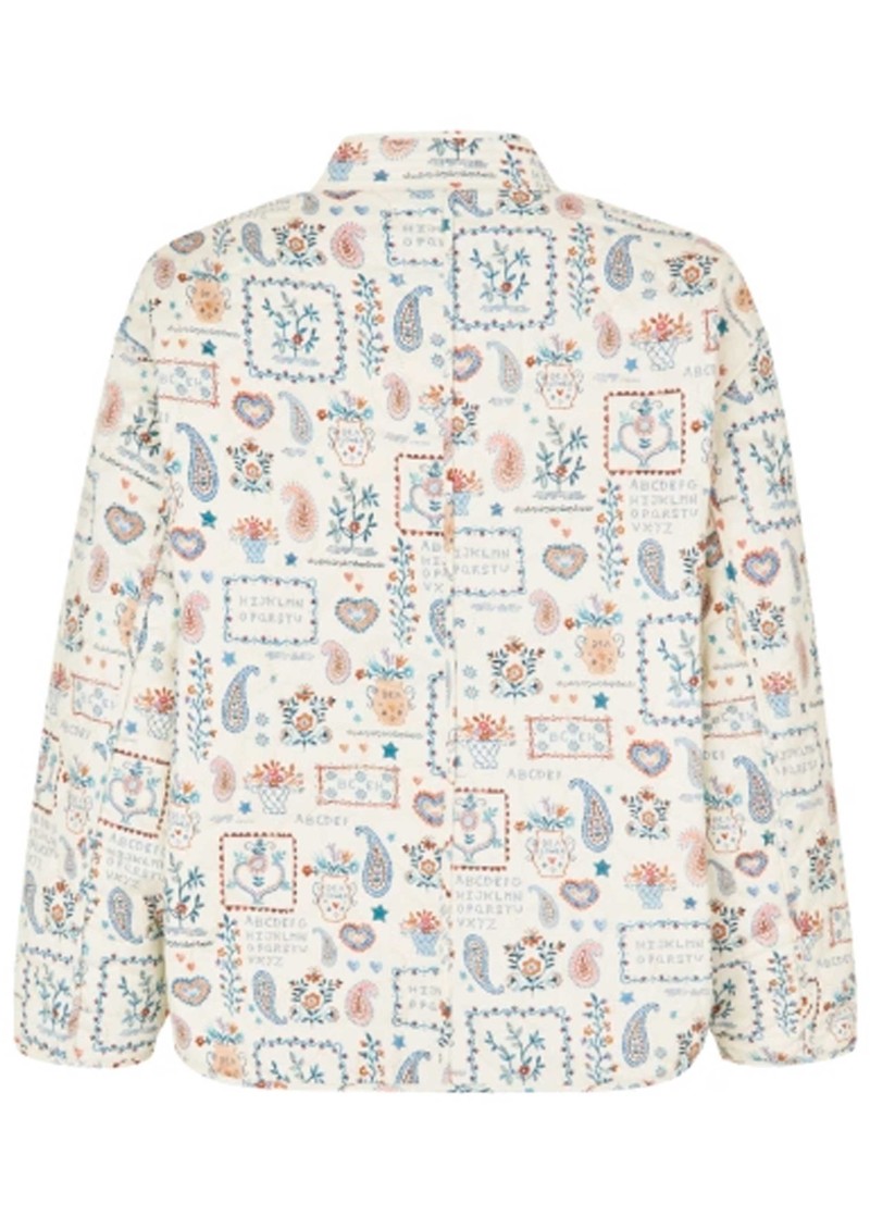 The Dea Kudibal Reiadea Quilted jacket features a regular, boxy fit with a short stand collar, central button closure, and long sleeves with subtle cuff detailing, creating a polished yet relaxed silhouette. Part of the new-season Blue House collection, it showcases an intricate all-over print, delicate embroidery accents, and a lightweight structure inspired by Danish ceramic artist Bjørn Wiinblad and his enchanting Blue House near Copenhagen.