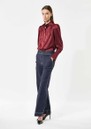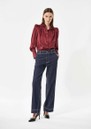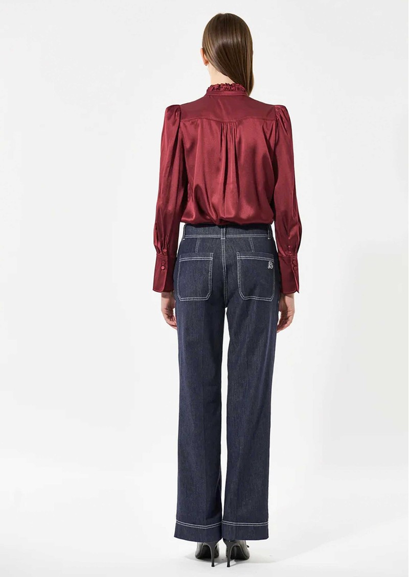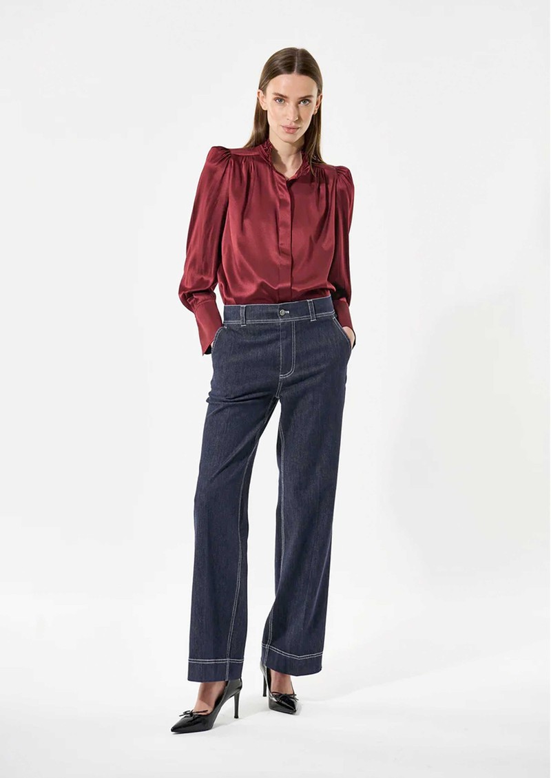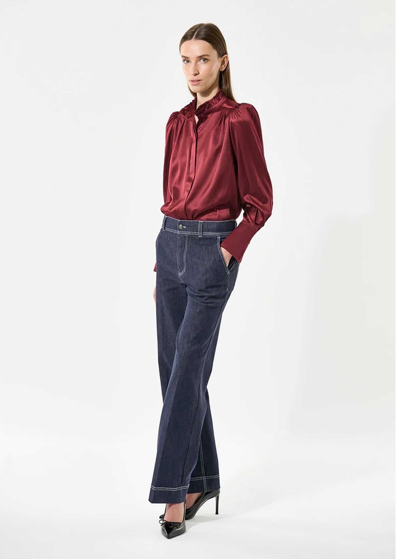 Introducing the Dea Kudibal Robertadea Silk Blouse in Bourgogne, a rich merlot hue that brings depth and elegance to any wardrobe. Crafted from Dea Kudibal’s signature stretch silk twill, it features a softly ruffled high neckline, refined pintuck detailing at the shoulders, and gracefully draped full-length sleeves for a polished, feminine finish.