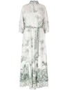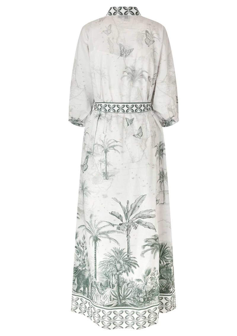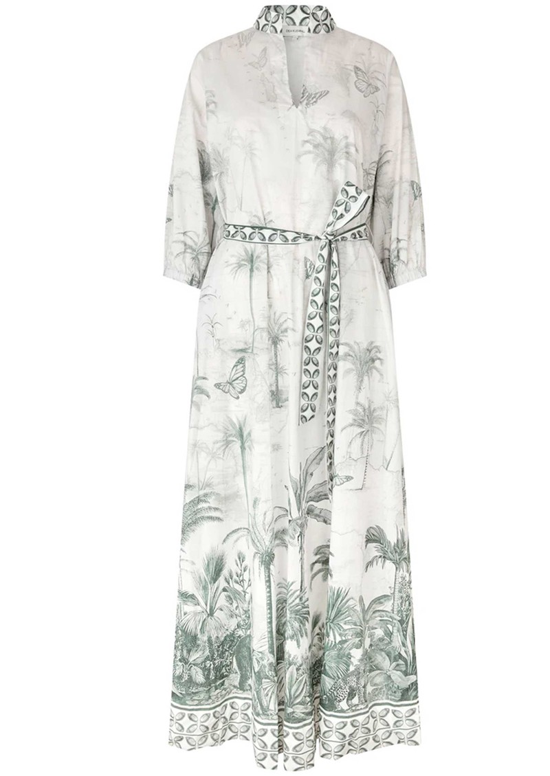 The Dea Kudibal SalmaDea Dress in Empire Army features a painterly, vintage-inspired floral placement print that brings a bold yet romantic feel to its full-length silhouette. Crafted in lightweight cotton voile, it’s designed with an easy, airy drape, cinched waist with a self-tie belt, and a refined stand collar for a polished finish.