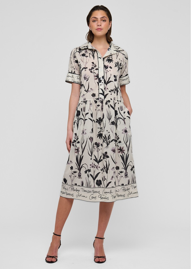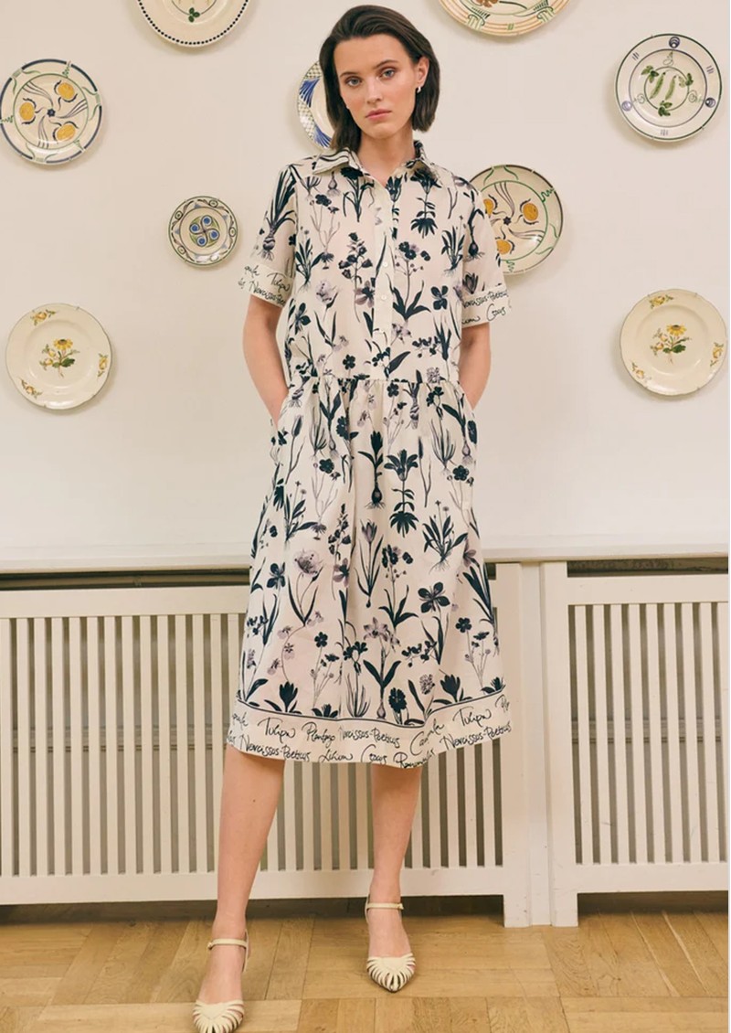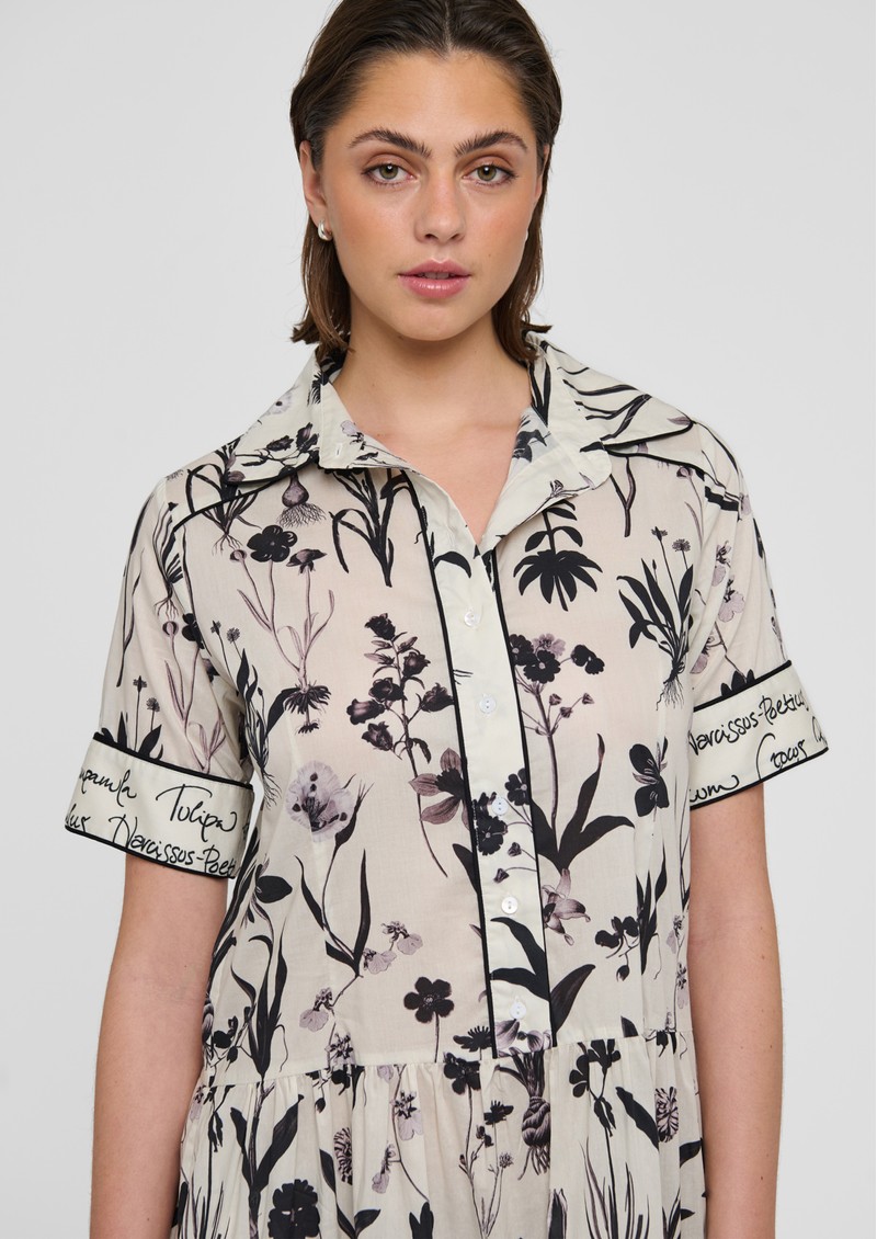 Introducing Tammydea from Dea Kudibal, a stunning short sleeve printed dress, designed in Botanical print. This cotton dress features a black and white floral print, a dropped waistline and contrasting text panels. Other features include: