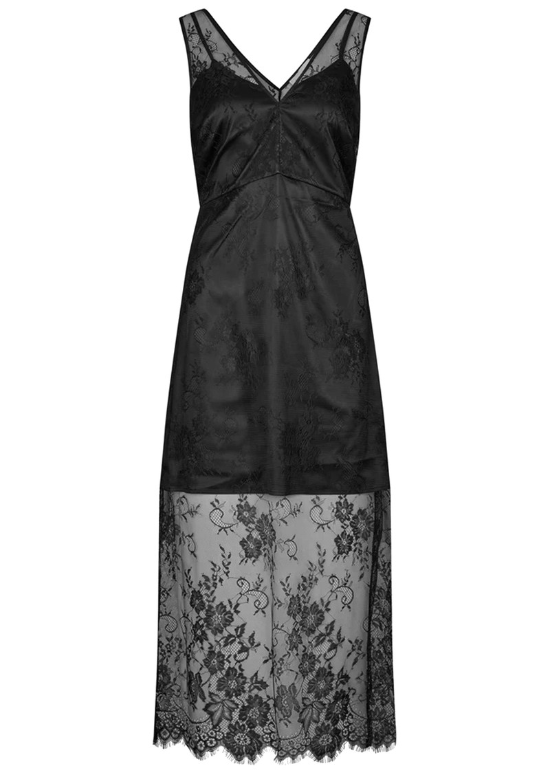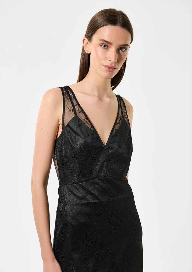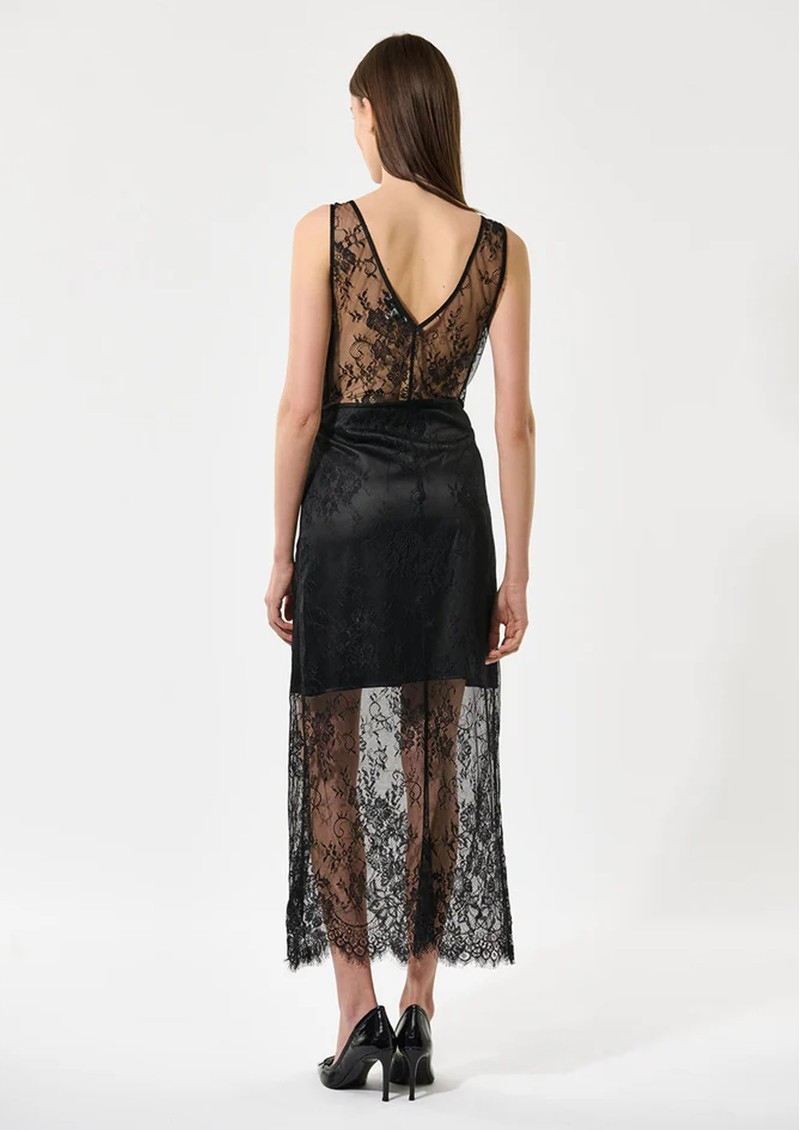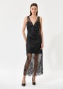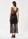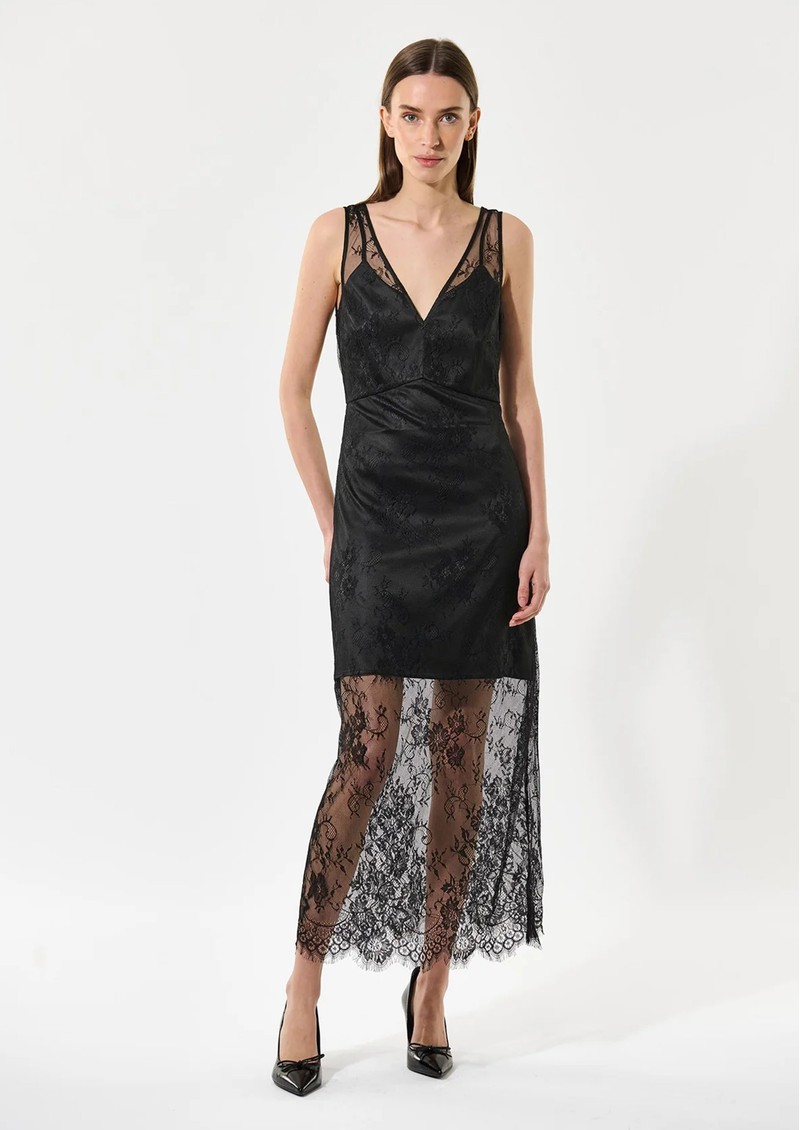 The Dea Kudibal Tebadea Dress in Black is the epitome of feminine party wear. This slim-fit, ankle-length dress features delicate black lace that skims the body before flaring gently, with a scalloped hem for a refined finish and a black slip included for coverage. It is designed with a flattering V-neckline for an elegant silhouette.