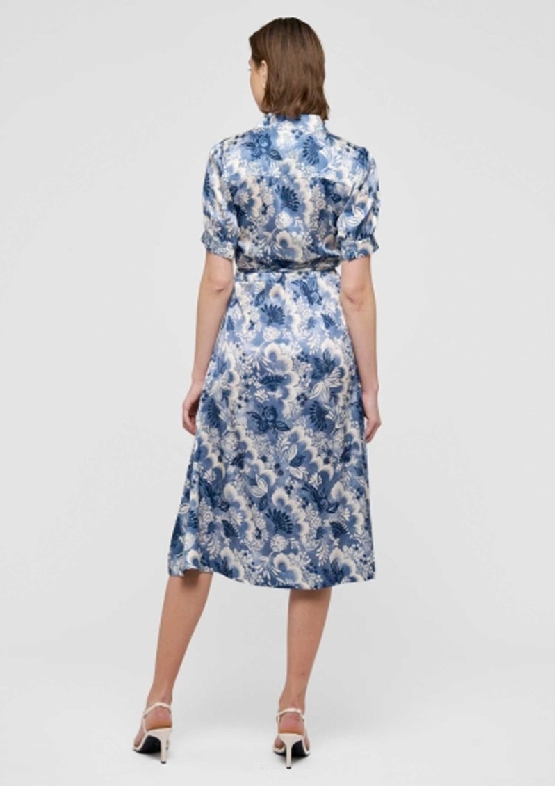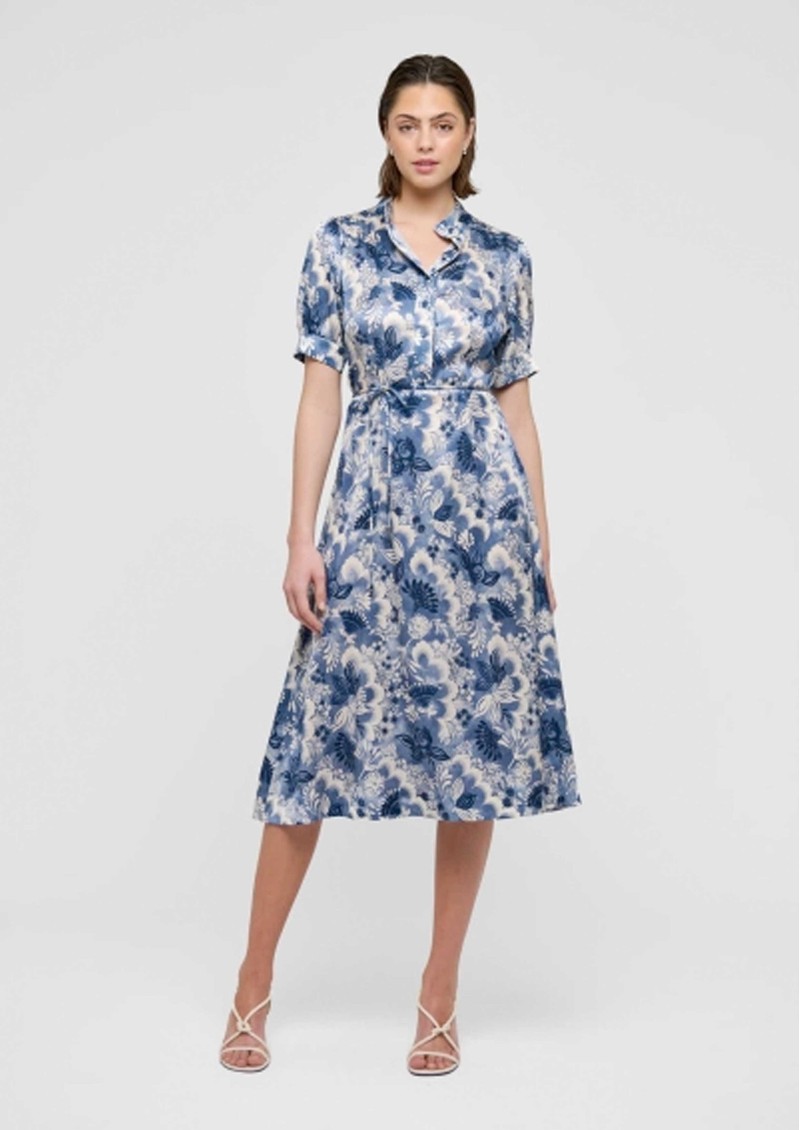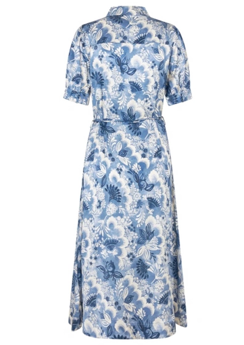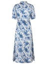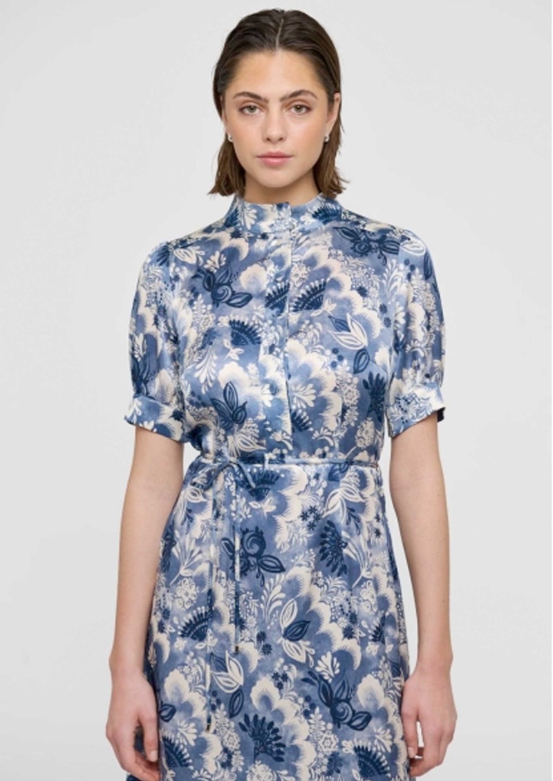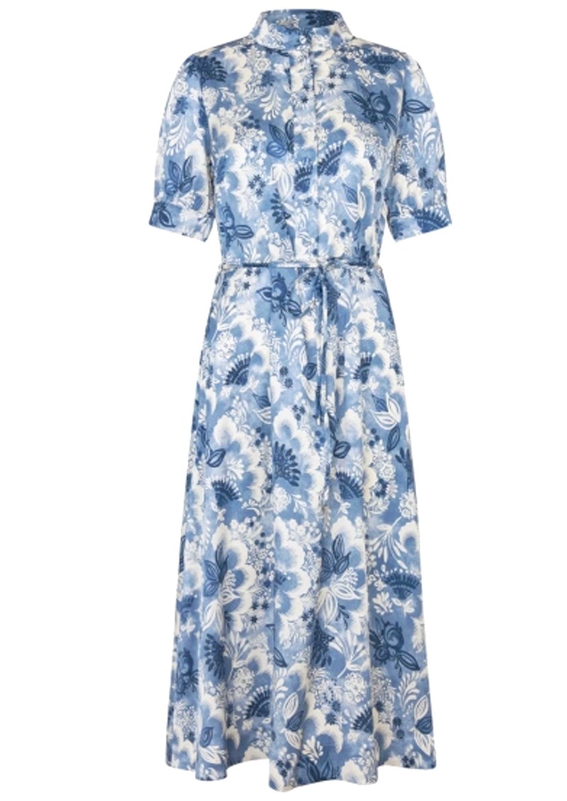 The Dea Kudibal Toradea dress in Eden Space is crafted from the brand’s signature silk stretch fabrication, offering a knee-length shirt-style silhouette with a short stand collar, short sleeves, and a central button-through front, finished with a slim waist tie for a flattering fit. Detailed with an all-over blue floral print, it captures a timeless vintage tea-dress feel with modern comfort.
