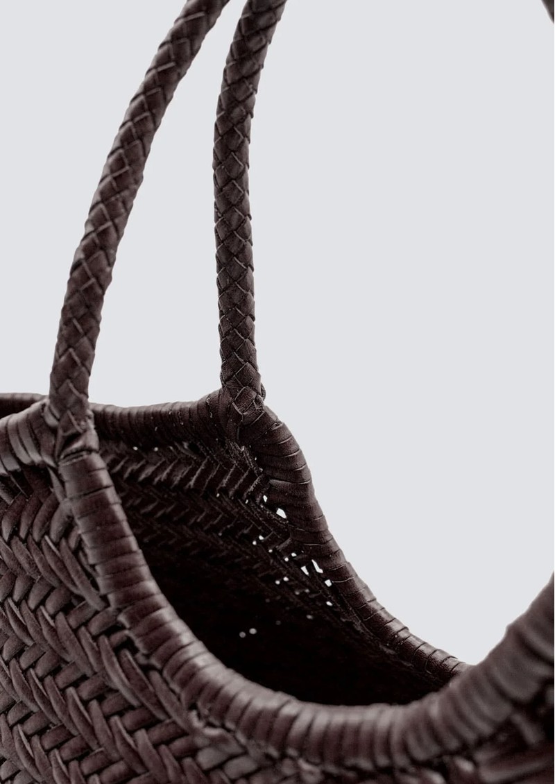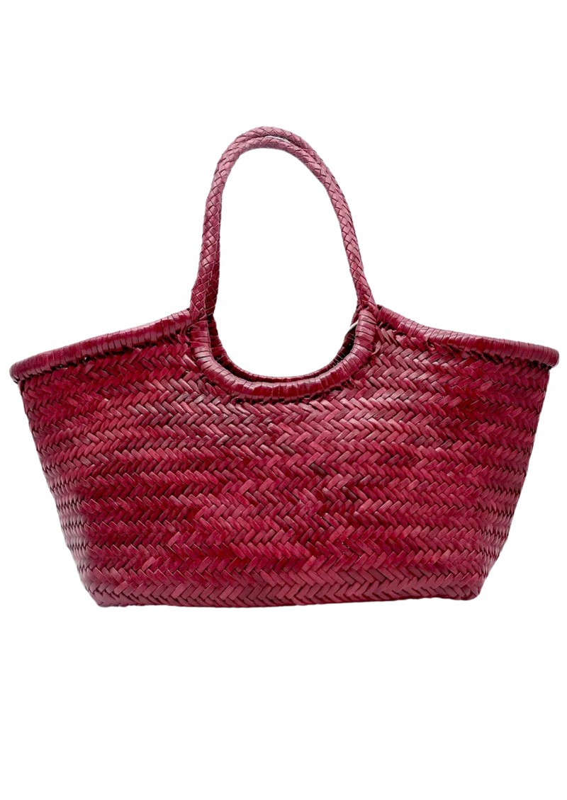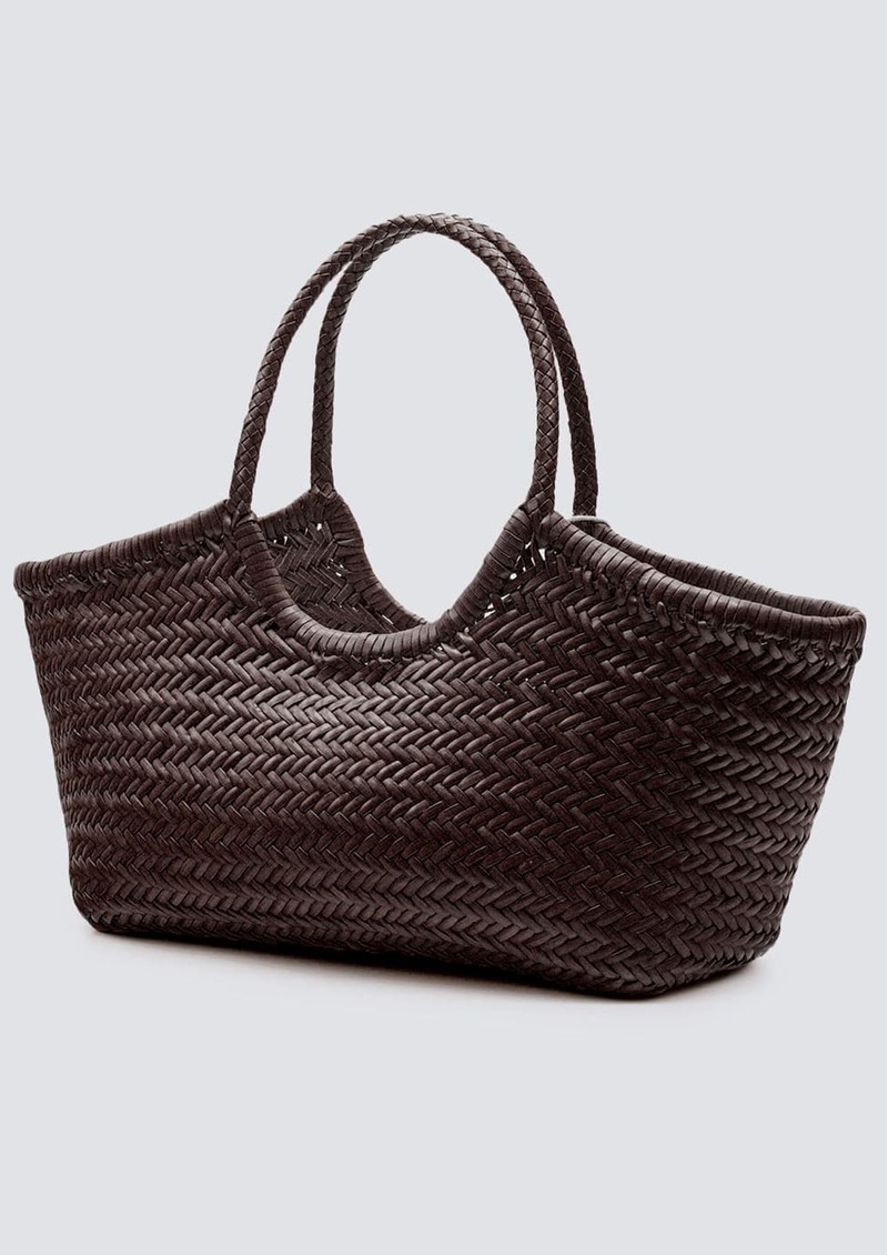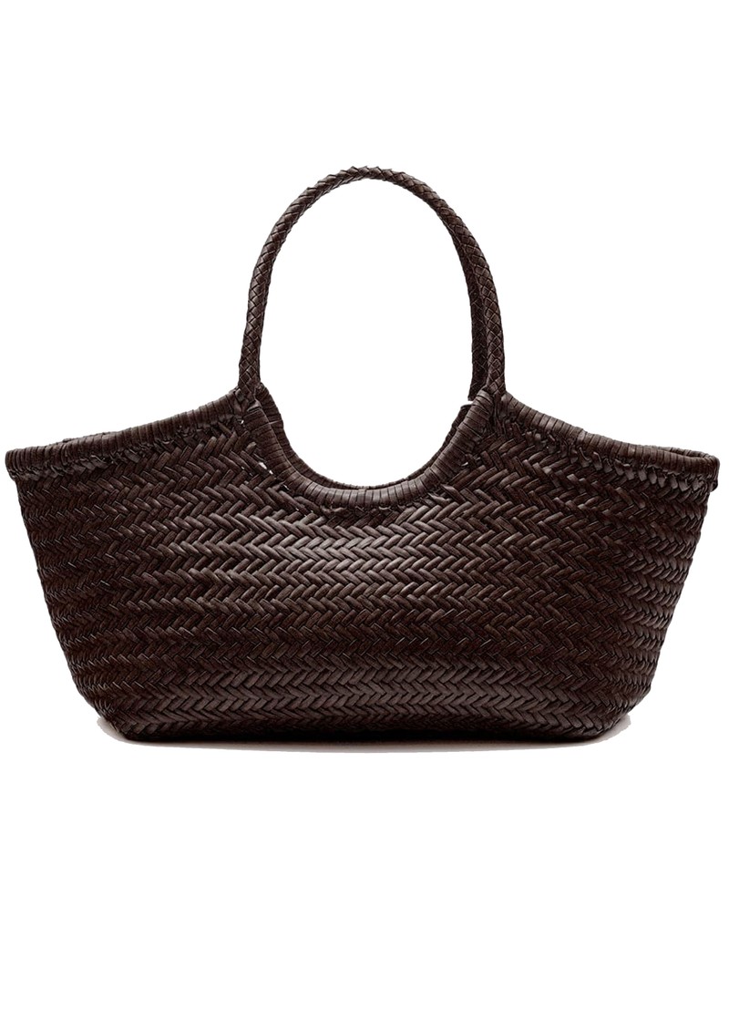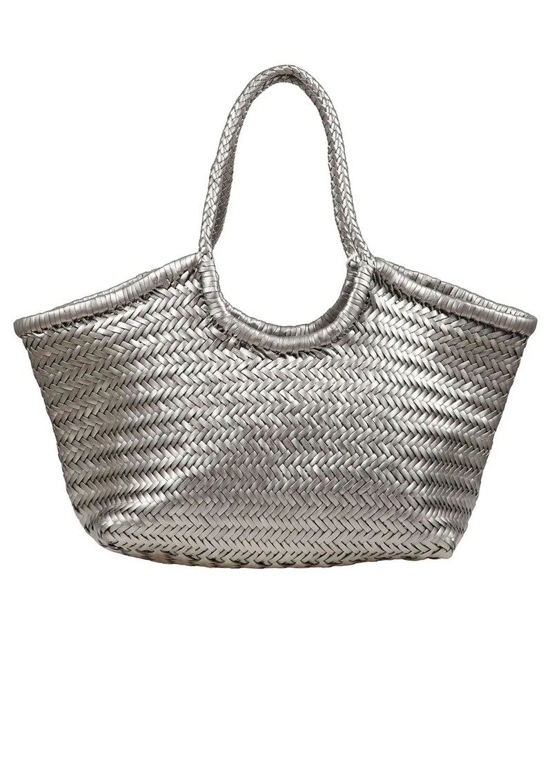Discover the Dragon Diffusion Nantucket Woven Tote Bag in covert foil - a luminous twist on classic craftsmanship. Expertly handwoven by skilled leather artisans from buffalo leather, its intricate weave echoes the charm of traditional wicker baskets, while a hand-stitched antiqued St. Christopher medal inside marks each bag with Dragon Diffusion’s signature seal of authenticity.