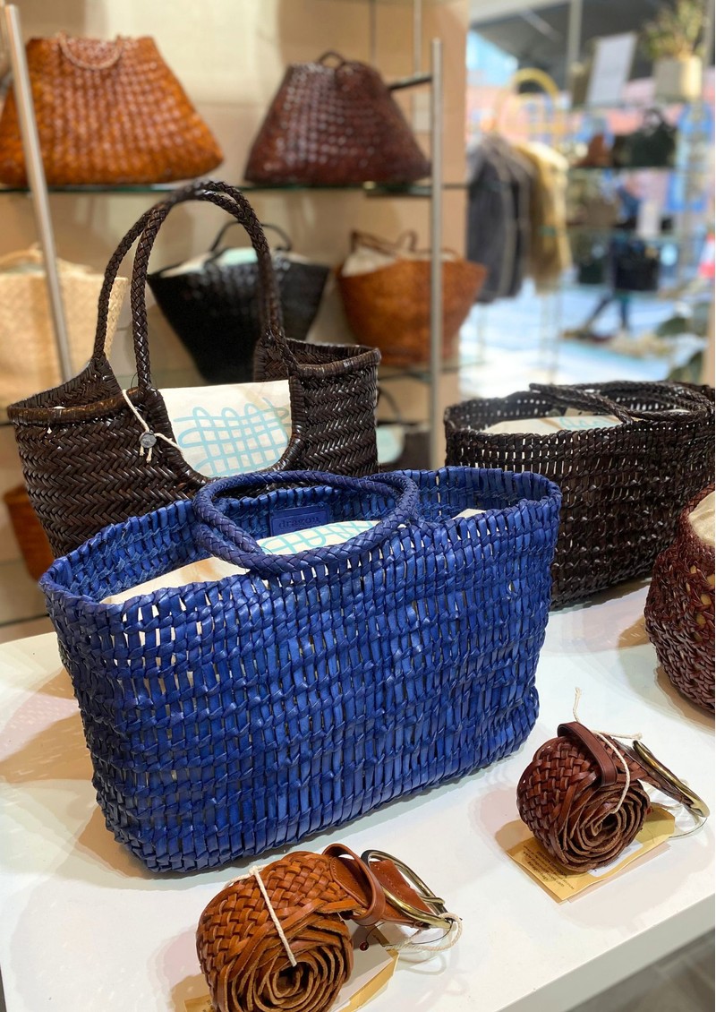 Meet the Dragon Diffusion Terrafino Woven Leather Bag. A sophisticated reinterpretation of traditional craftsmanship. Meticulously handwoven from buffalo calf leather, its rich, earthy tones and intricate basket-style pattern radiate timeless elegance. We love the hand-stitched antiqued St. Christopher medal inside each bag to guarantee every bag is a true Dragon Diffusion original.