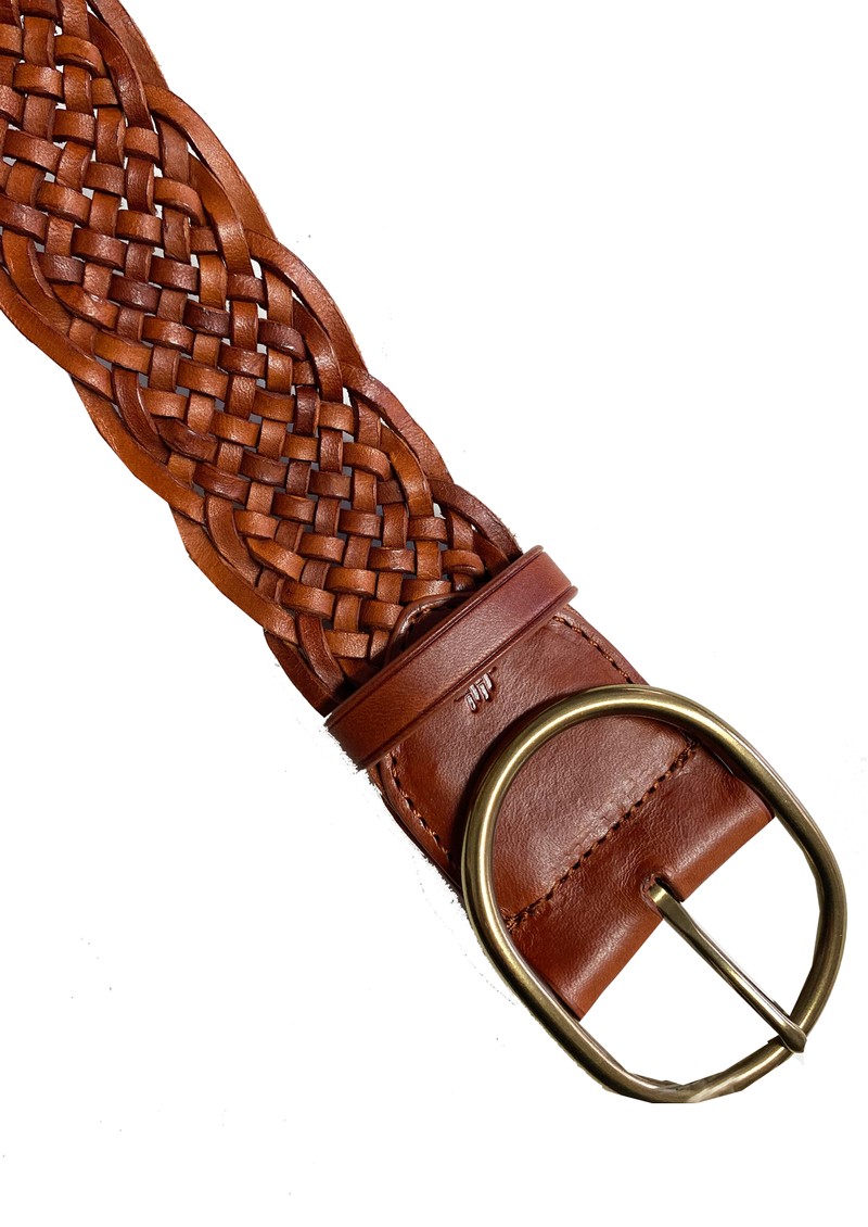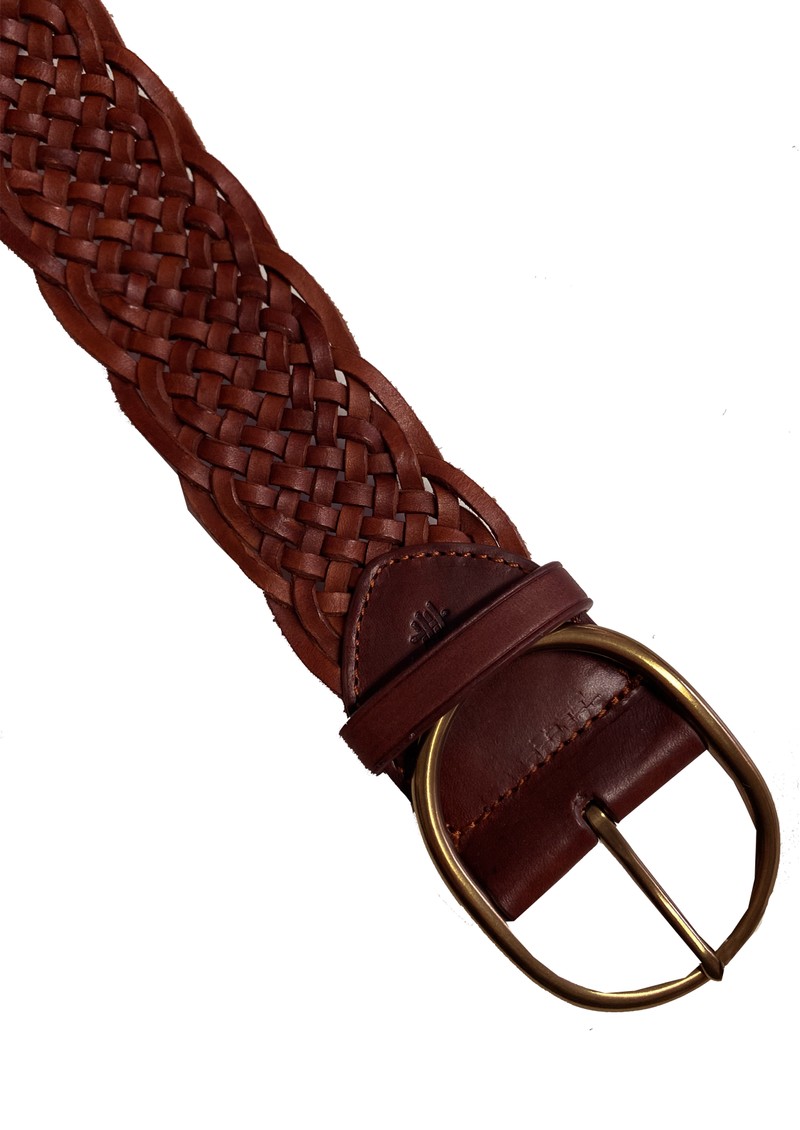 Introducing beautifully handcrafted leather belts from Dragon Diffusion. This Woven Oval design is crafted in their best selling Bruciato leather, a rich dark brown hue. Featuring a gold tone oval shape buckle, this womens belt also features: