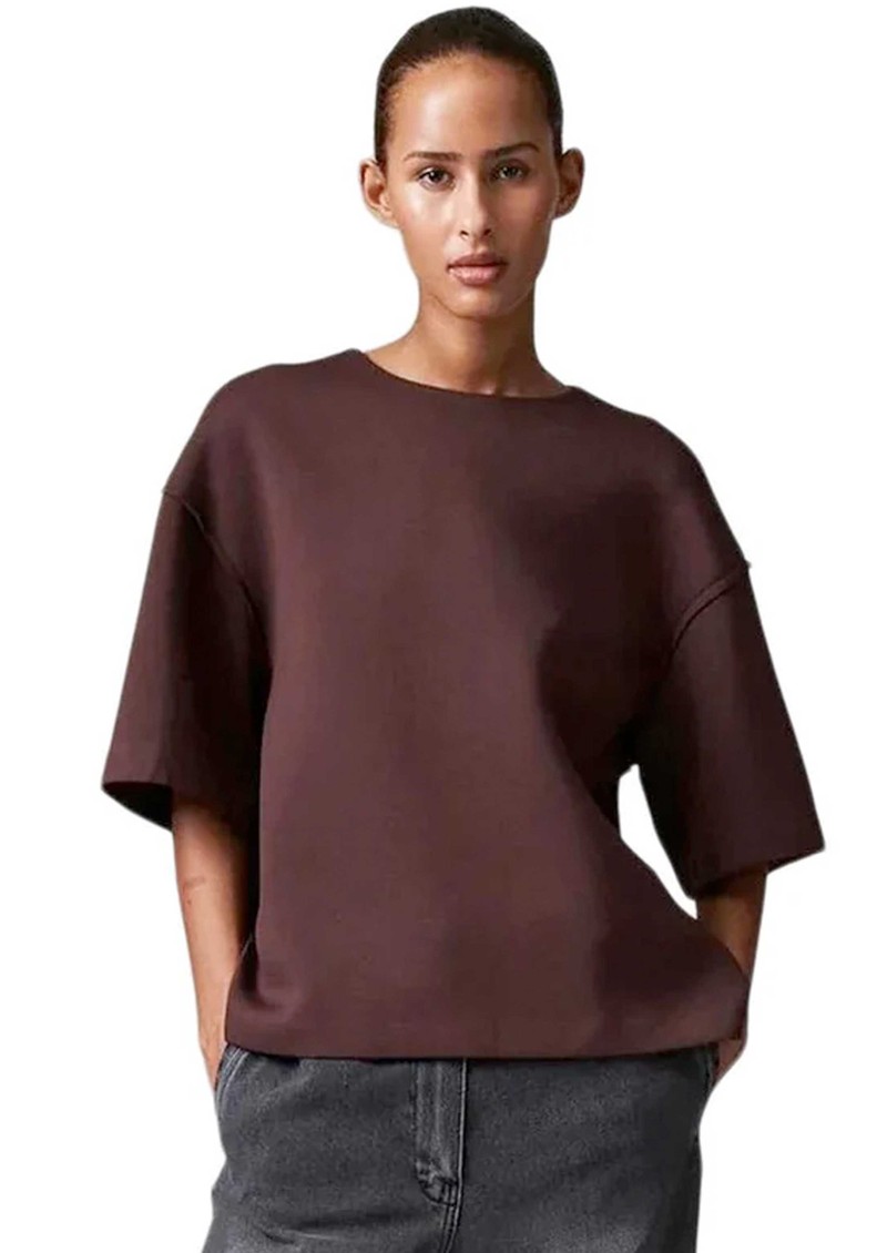 Add effortless sophistication to your wardrobe with the Day Birger Et Mikkelsen Amalie Scuba Top. Featuring a relaxed, loose fit, rounded neckline, dropped shoulder seams, and wide elbow-length sleeves, this top is designed with minimal seams for a sleek, modern look in a rich chocolate plum hue.