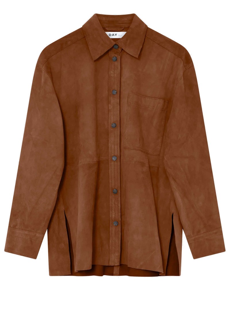 The Day Birger et Mikkelsen Birger Andreas Shirt in Caramel Café is a luxurious suede button-up featuring a pointed collar, central snap button closure, and a front patch pocket. With side slits, an unlined interior, and an oversized fit, it combines effortless style with a relaxed, contemporary silhouette.