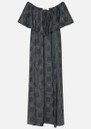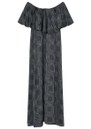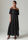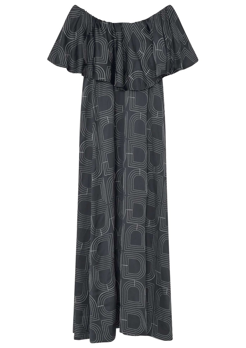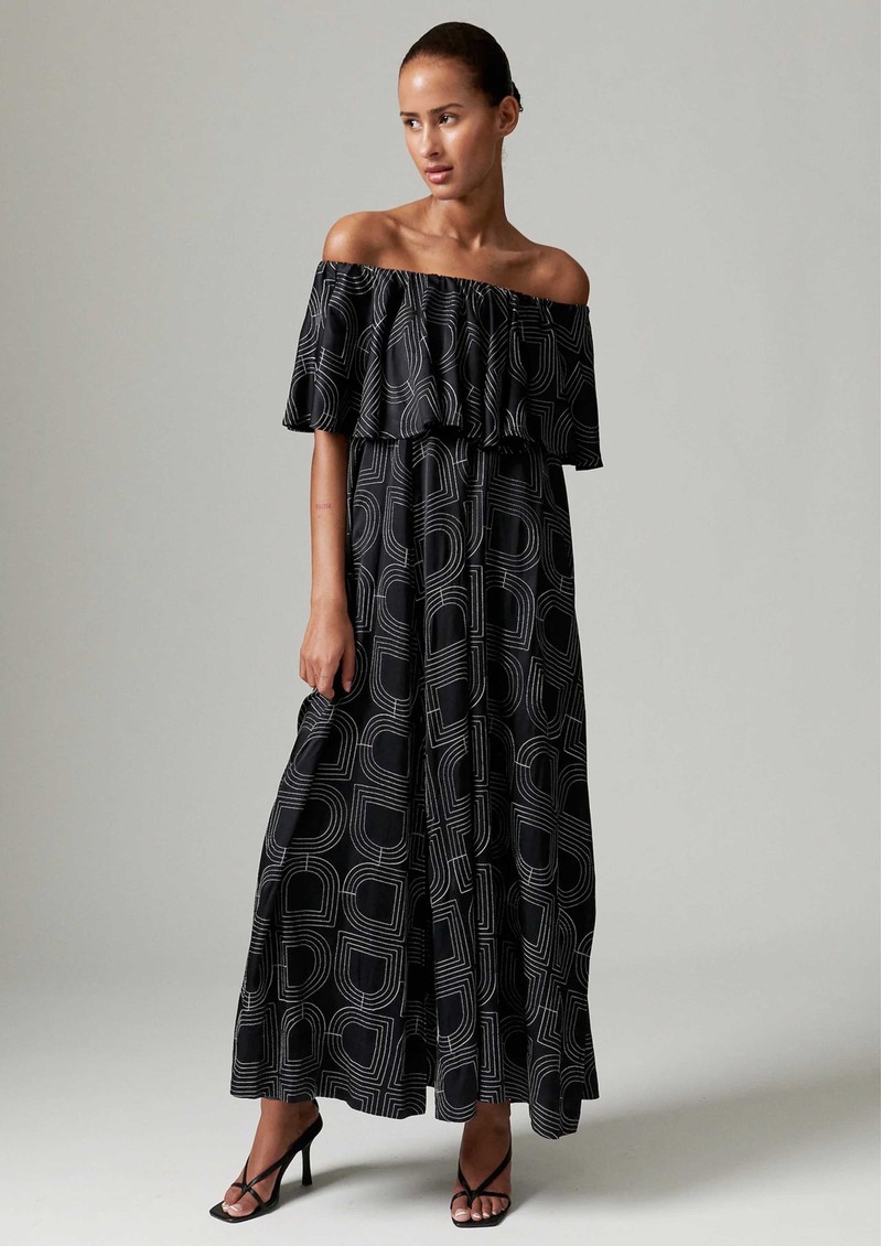 The Day Birger et Mikkelsen Chrissi Dress in black is a loose, ankle-length design featuring an elasticated off-the-shoulder yoke, billowy sleeves, and subtle gathering at the waist for a flattering, effortless silhouette, with embroidered detailing throughout adding texture and depth.