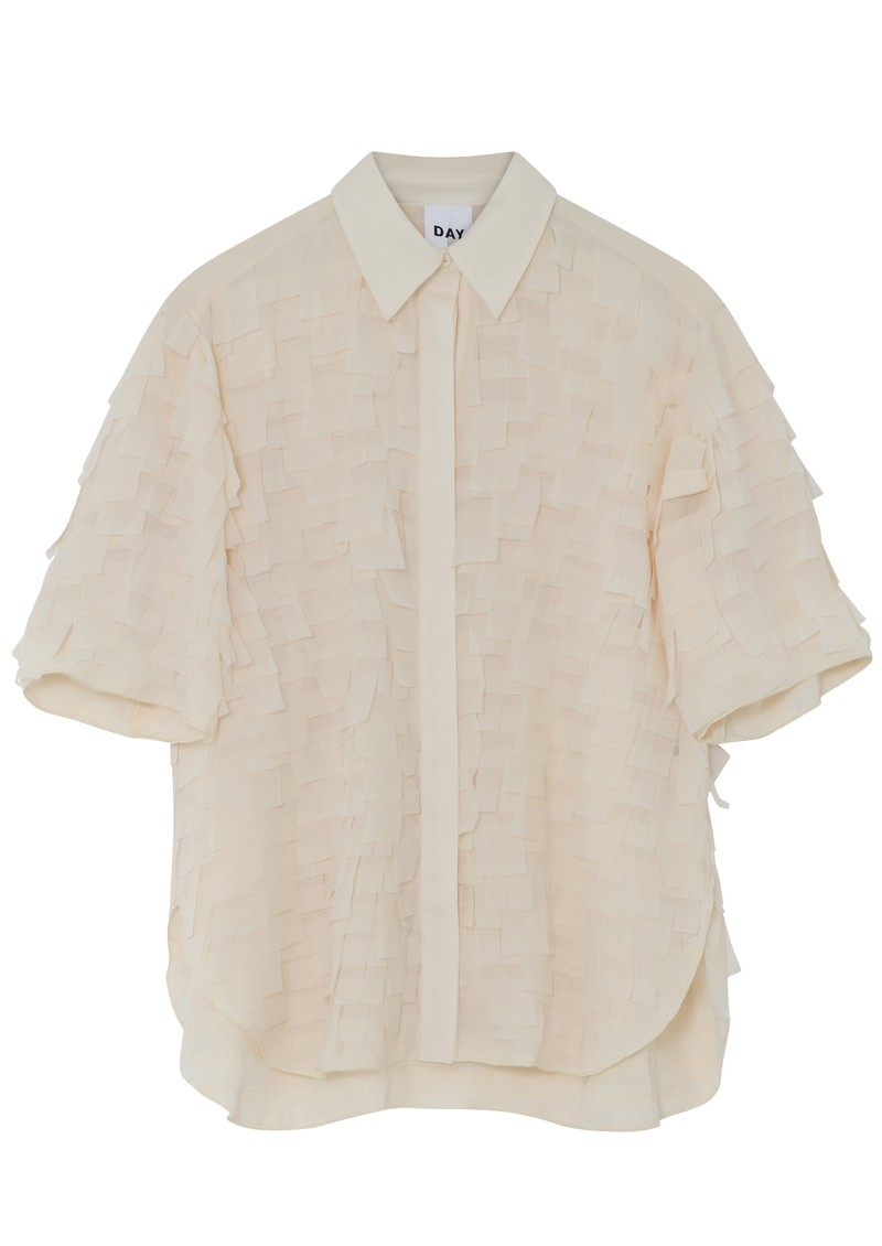 Introducing the Day Birger Et Mikkelsen Figo shirt in jet stream. This lightweight shirt features delicate chiffon squares throughout giving the shirt subtle movement and flair. This shirt also features a classic pointed collar, short sleeves central button closure and scalloped hemline. Other key features include:
