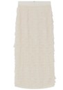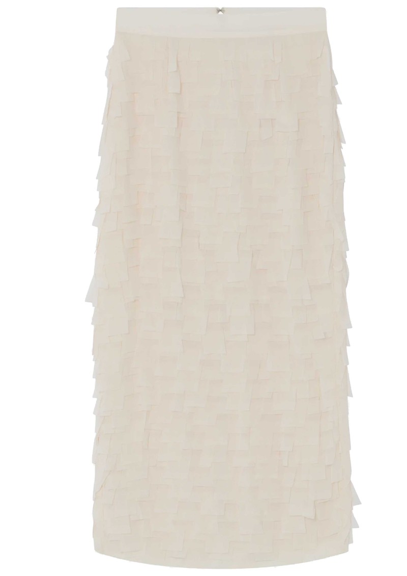 The Day Birger et Mikkelsen Flow Skirt in Jet Stream is a fitted, ankle-length design with a back zip and slit, adorned with square fabric fringe that creates a captivating sense of movement. Its sleek silhouette is balanced by the playful texture of the fringe, making it a standout piece.