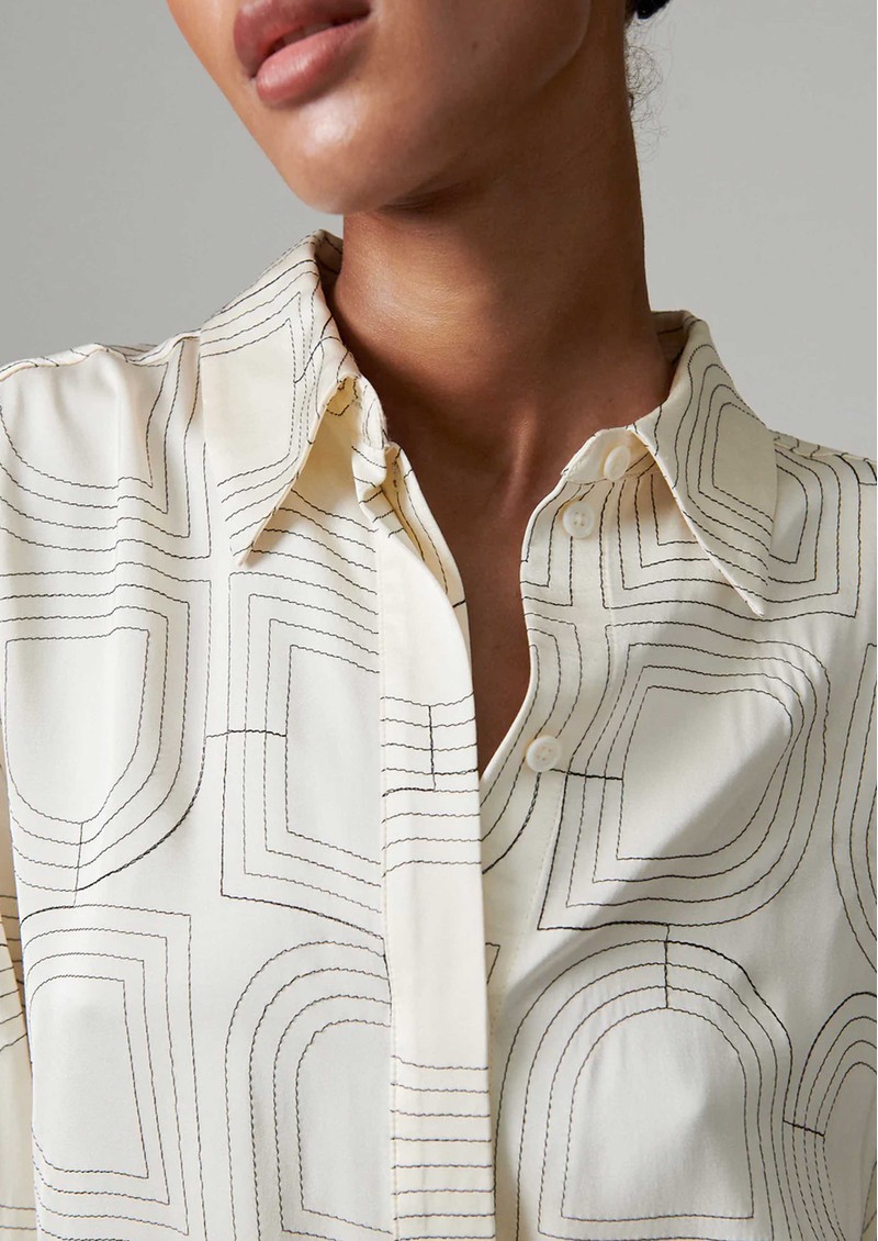 The Day Birger et Mikkelsen Plyma Shirt in Jet Stream is a fluid, loose-fitting button-up top with embroidered detailing, buttoned cuffs, and a dipped, curved hem. A playful centre tie adds a touch of charm, while the soft, lightweight fabric gives it effortless movement and versatility.