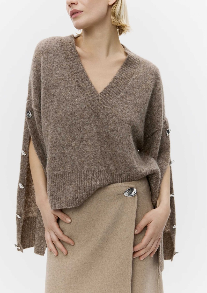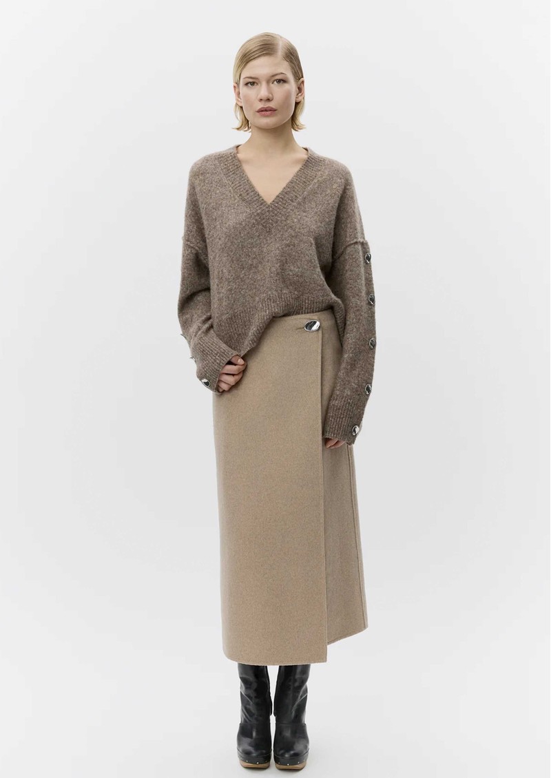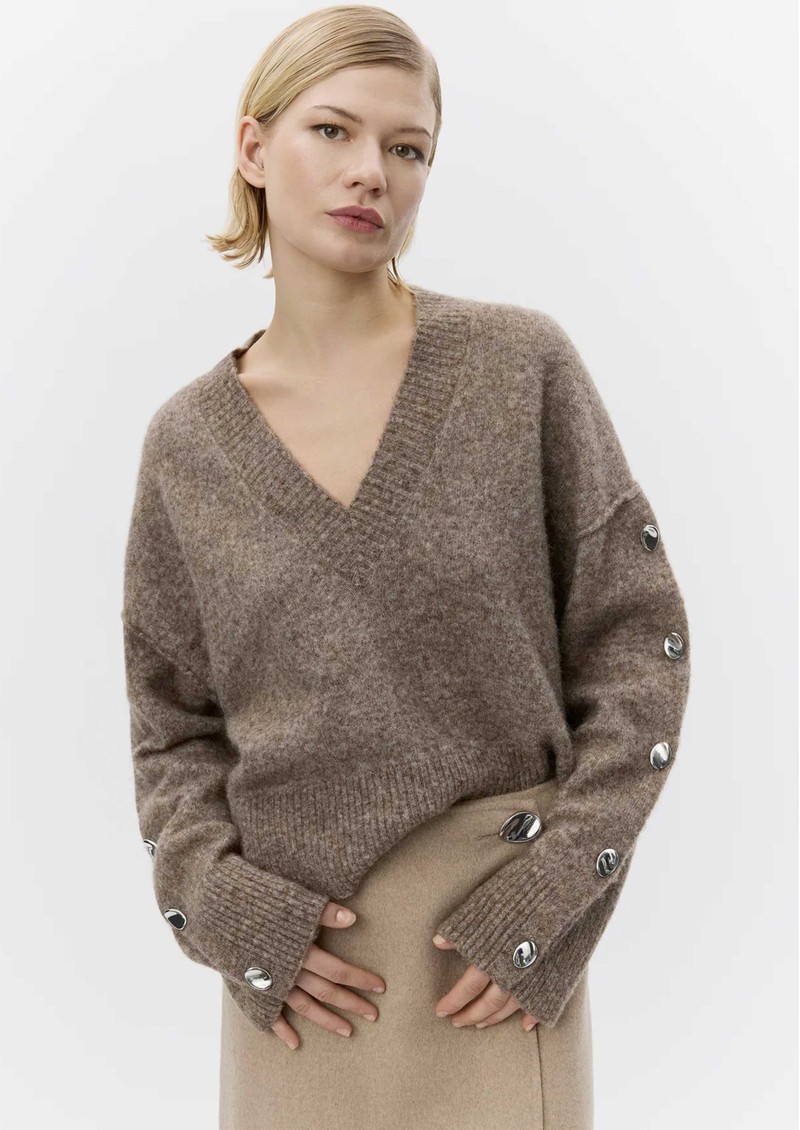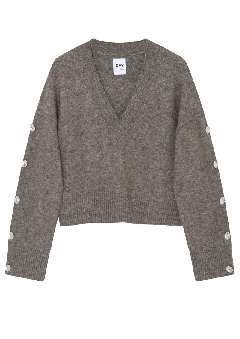 The Day Birger et Mikkelsen Solange jumper in Hazelnut Melange is a cosy V-neck knit with playful bauble buttons along the sleeves. Designed with an oversized fit and finished with ribbed edges, it combines comfort and style in a luxurious alpaca-blend fabric.