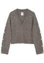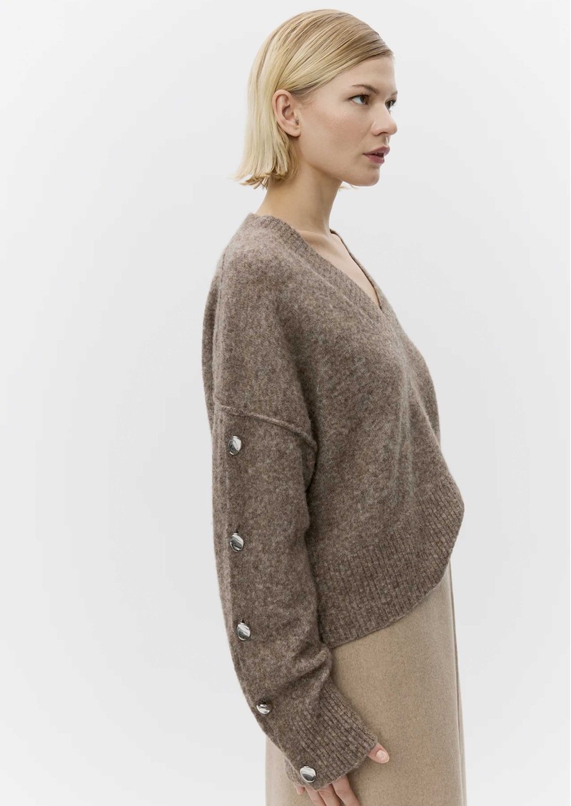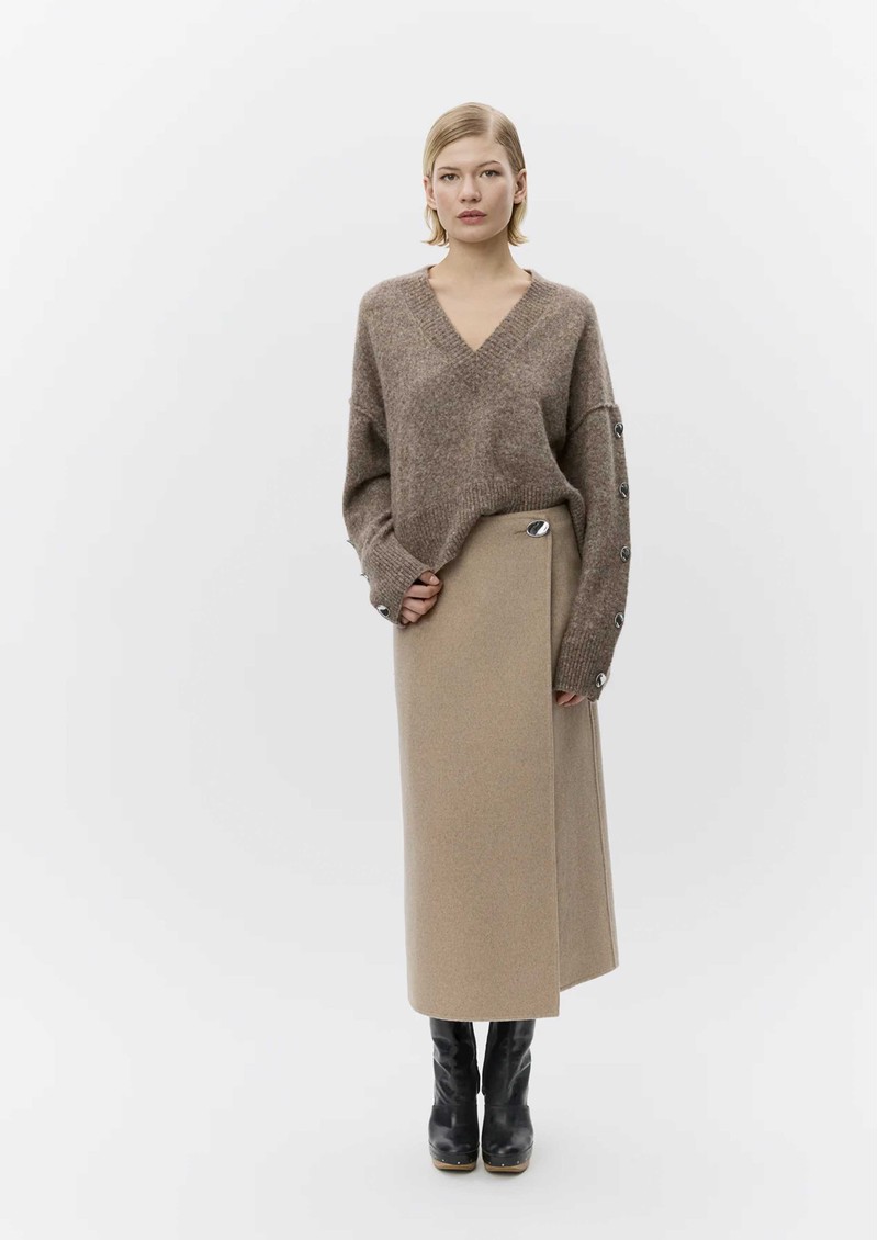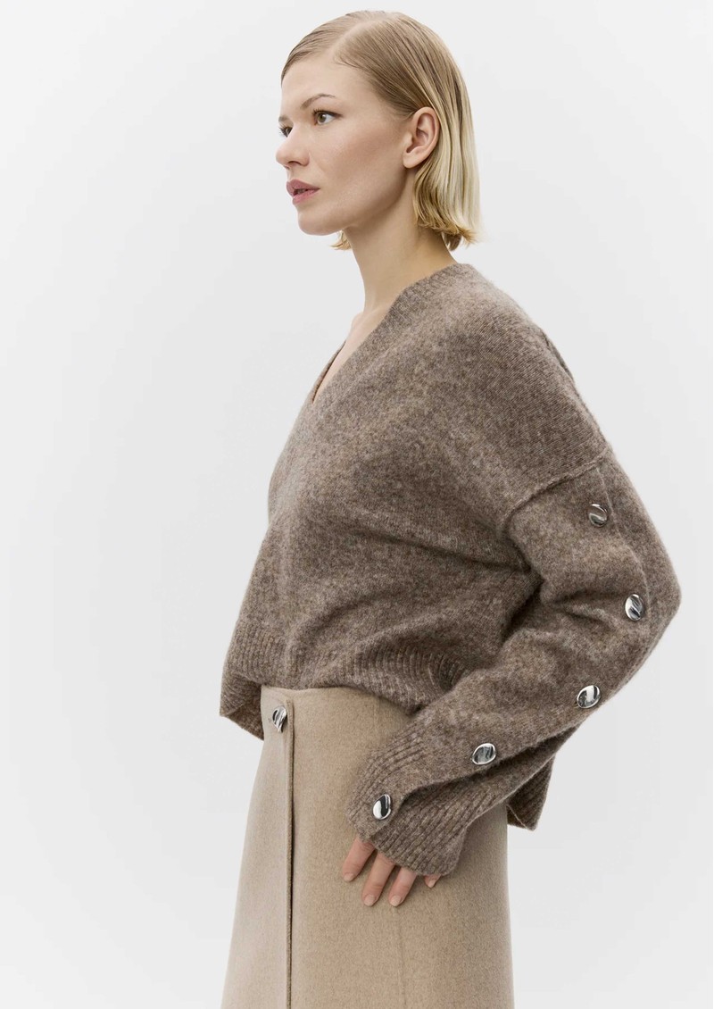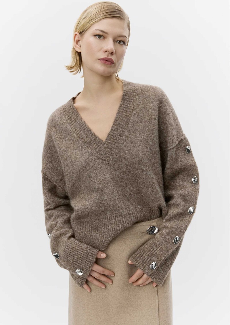 The Day Birger Et Mikkelsen Solange V-Neck Jumper in wren melange is an oversized, cosy knit with dropped shoulder seams and ribbed edges. Featuring playful bauble buttons down the sleeves, it combines relaxed comfort with stylish detailing.