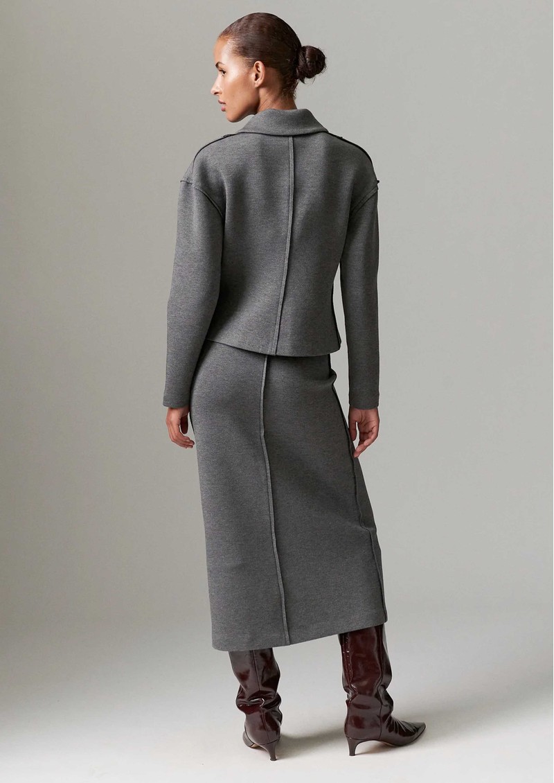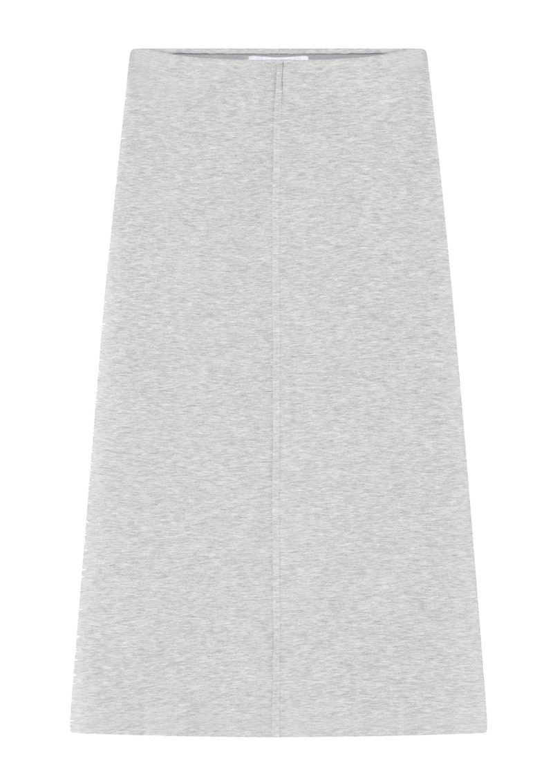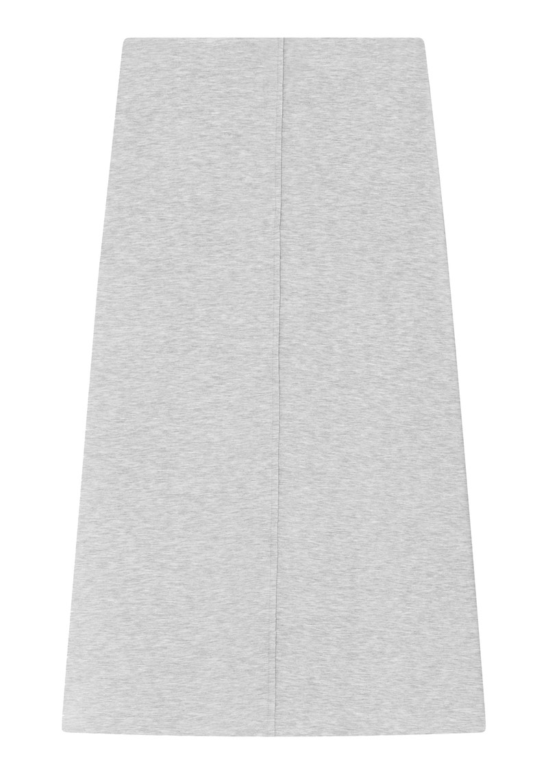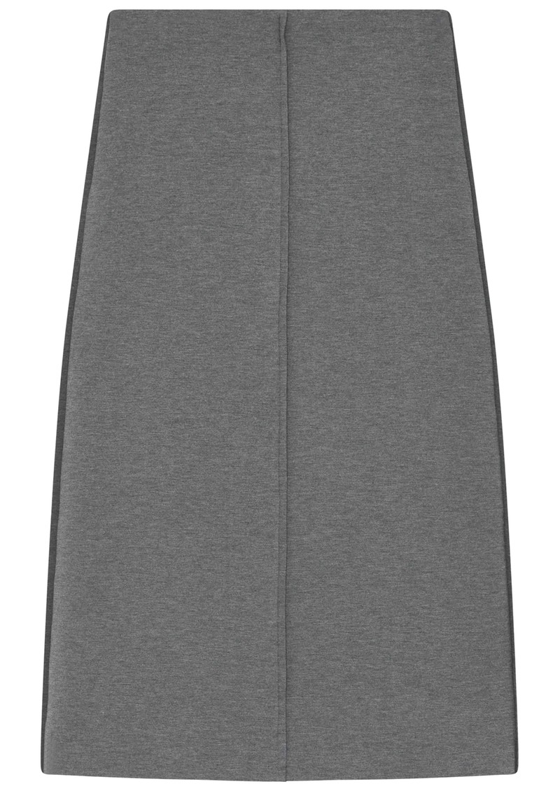 The Day Birger et Mikkelsen Suzie scuba skirt in Grey Melange is a midi-length, slim-fit skirt with a slight A-line shape, crafted from stretchy scuba fabric with an elasticated waistband and raised central seams for a modern, tailored look.
