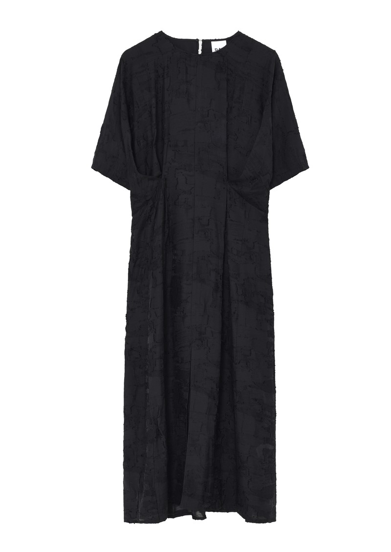 Introducing the Zua Maxi Dress by Day Birger Et Mikkelsen is crafted in a lightweight rayon/nylon blend in a chic black hue. This dress also features a rounded neckline, short wide sleeves with pleats adding a touch of structure. This dress also features a textured burnout detailing throughout and modest lower leg slit. Other key features include: