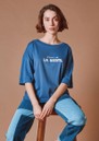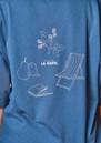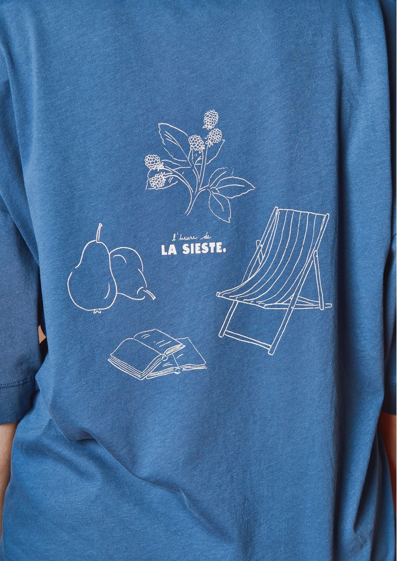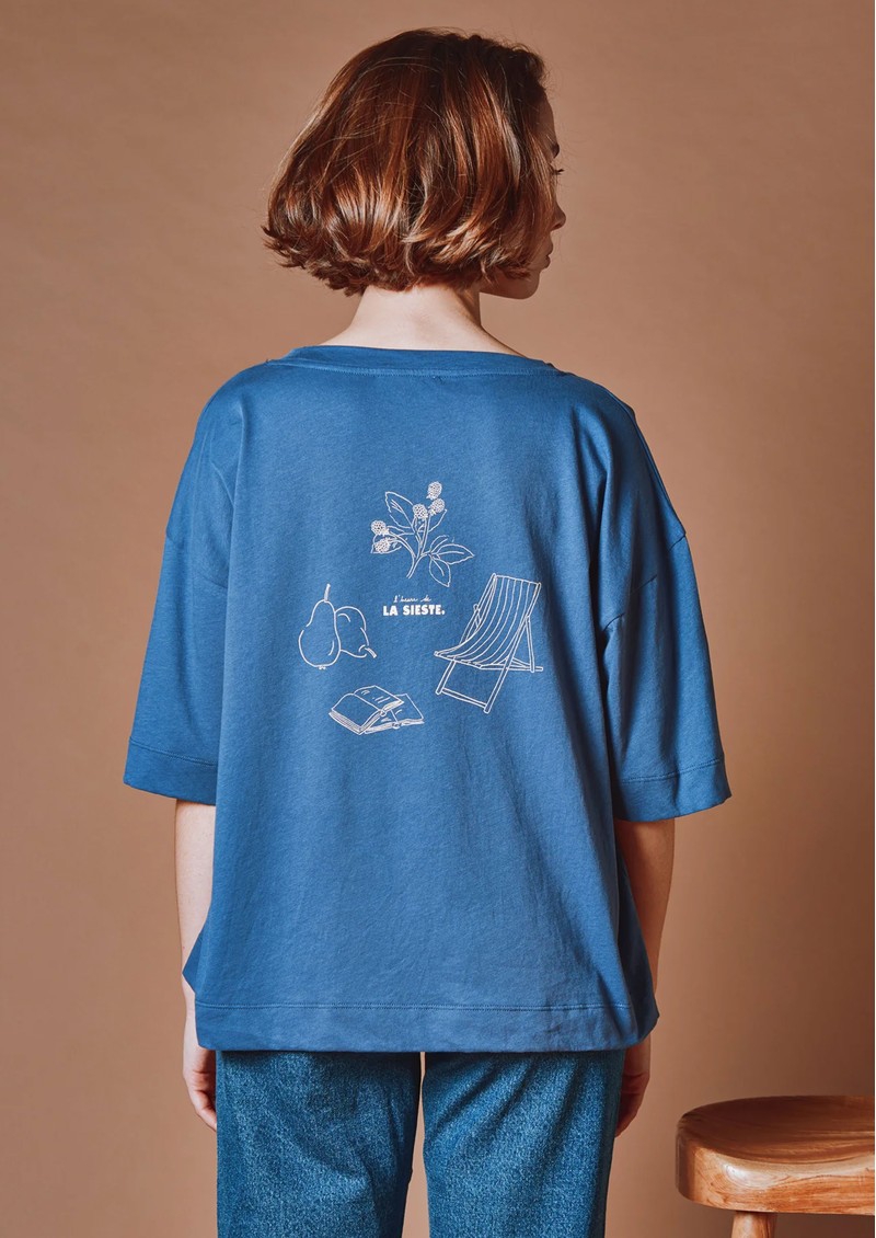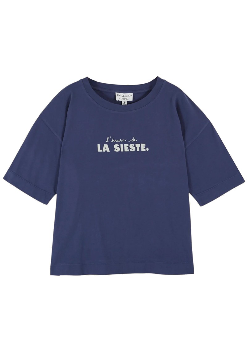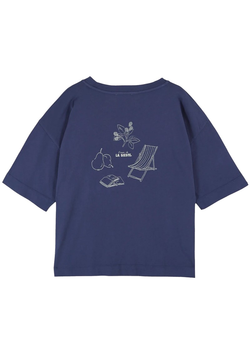 The Emile Et Ida Imprime T-shirt in Marine is a short-sleeved navy blue organic cotton jersey top, featuring “L'heure de la sieste” printed on the front and garden-inspired illustrations on the back. It offers a very soft, oversized fit with a round neckline, ribbed trim, and hemmed, topstitched finishes on the sleeves and hem.