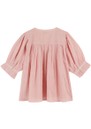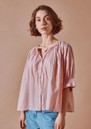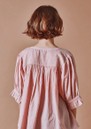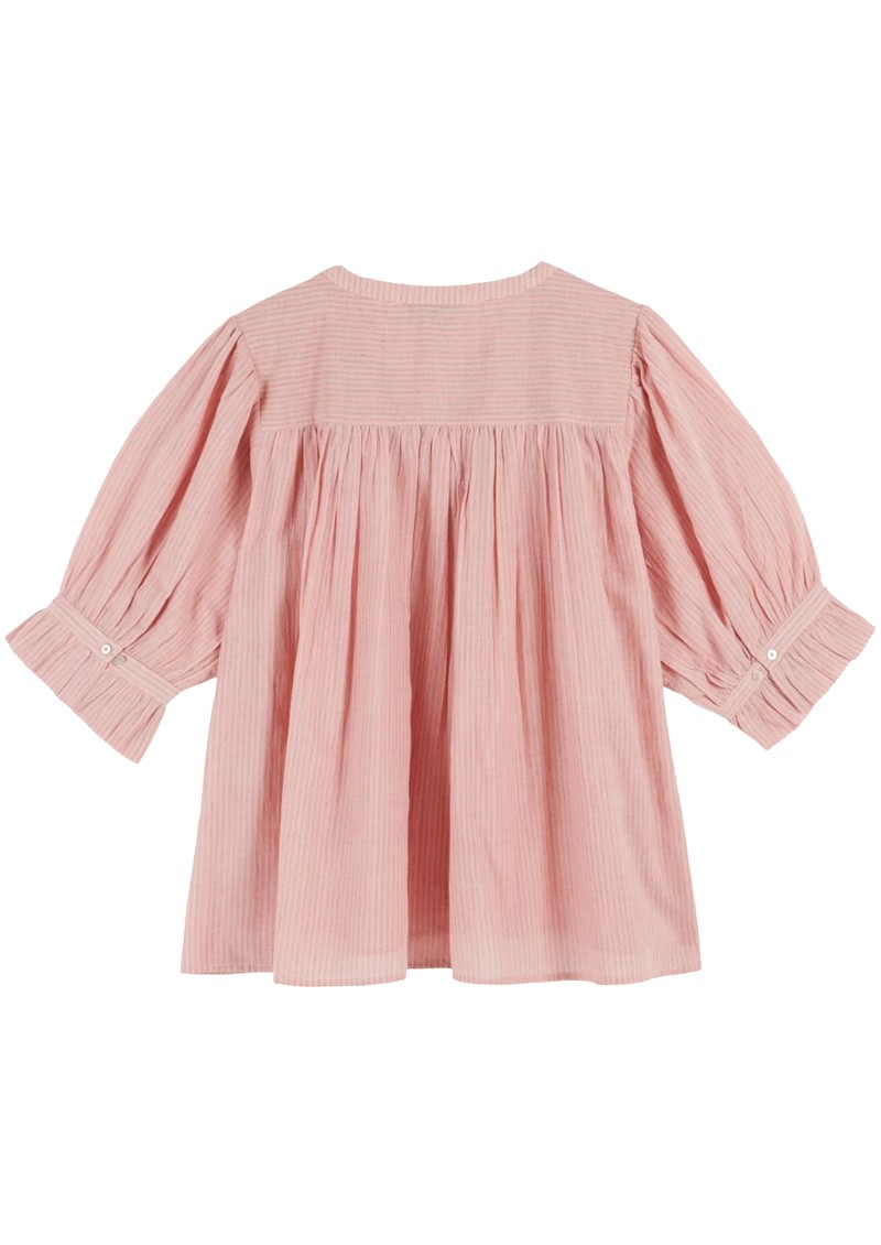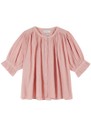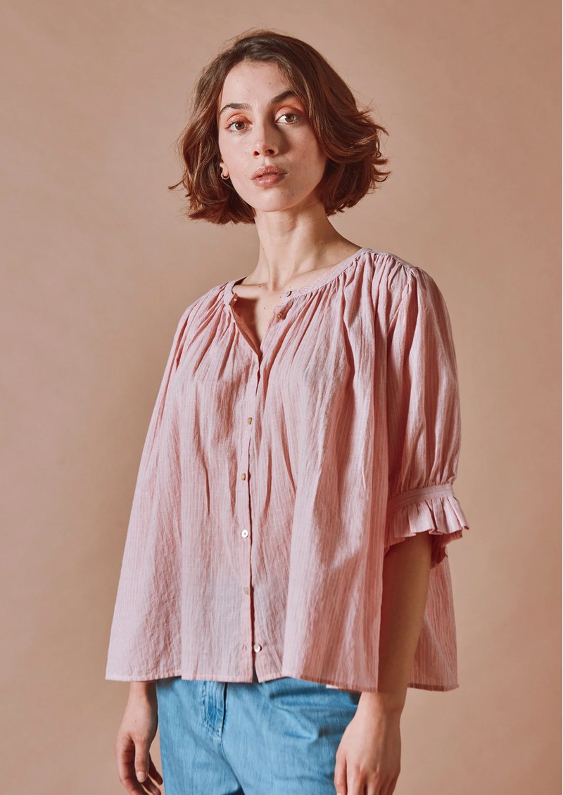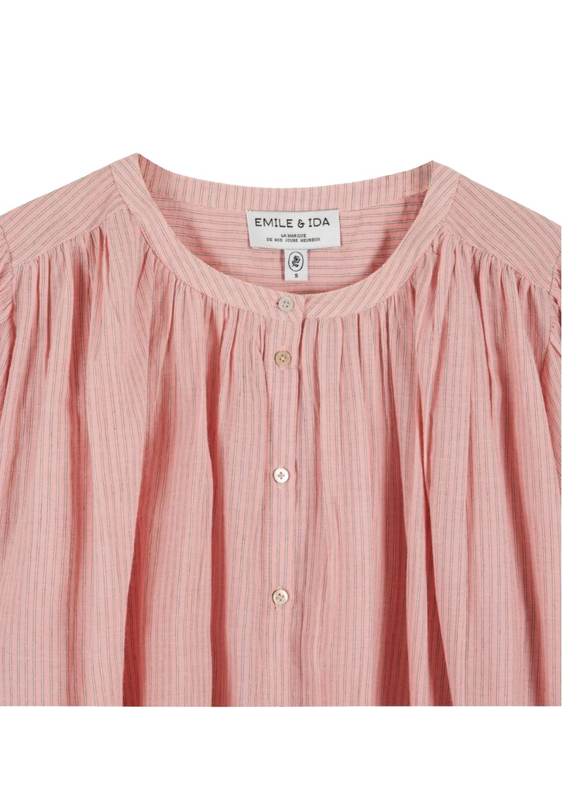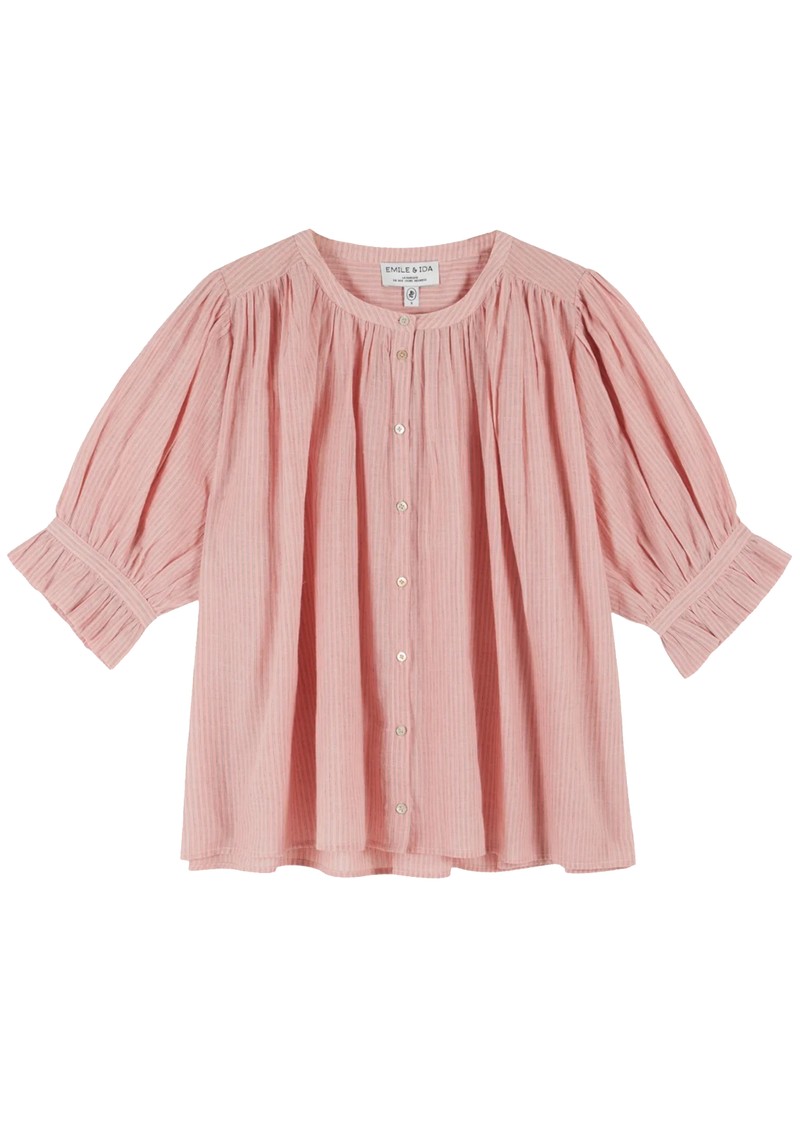 This Emile Et Ida pink cotton khadi blouse is delicately embellished with fine white lines and crafted entirely by hand by Indian artisans, giving each piece a unique texture and character. It features a loose fit with gathered volume, a round neckline, 3/4 ruffle sleeves with mother-of-pearl buttons, and a full-length button placket.