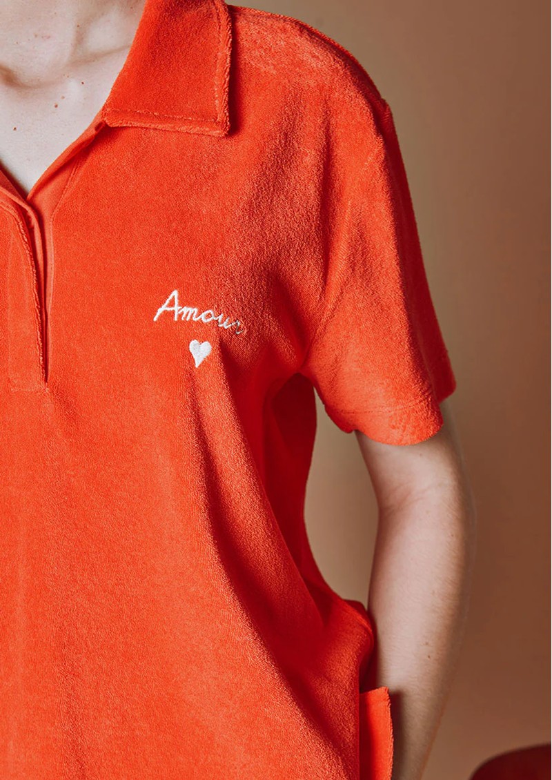 The Emile Et Ida Polo Terry top in Coquelicot is crafted from extra-soft terry velour in a vibrant red hue offering a comfortable, stretchy feel. It features a pointed collar, crew neck, a concealed button placket under a cotton jersey band, and “Amour” embroidery on the chest.