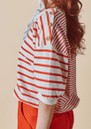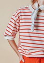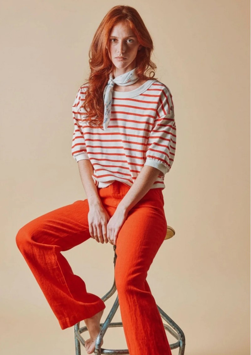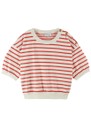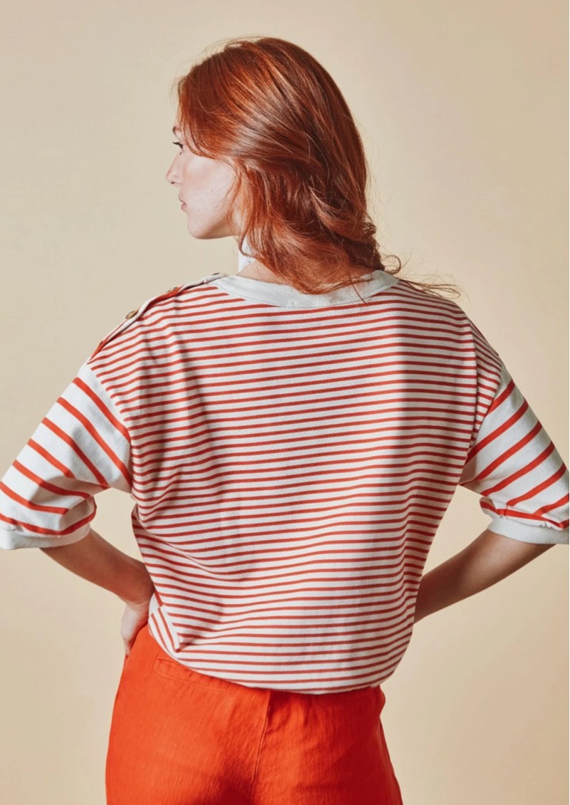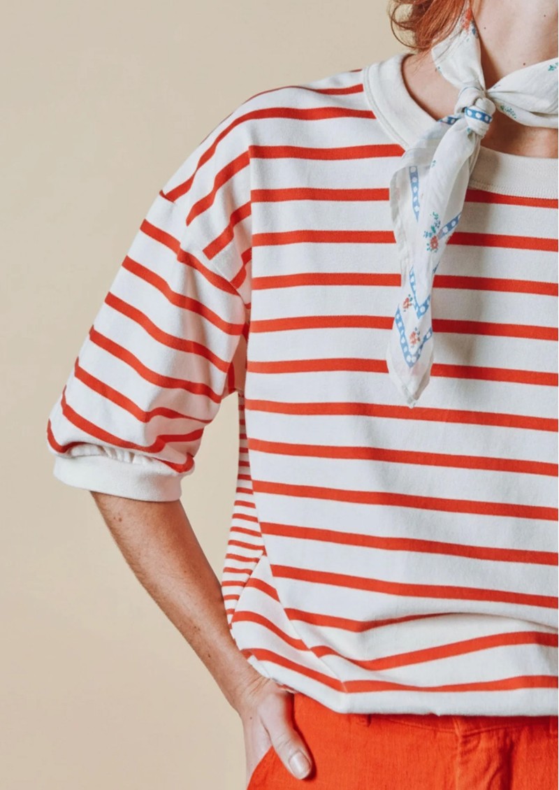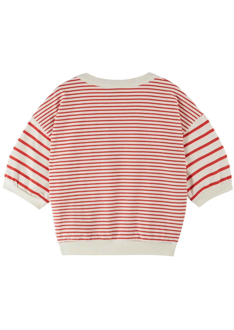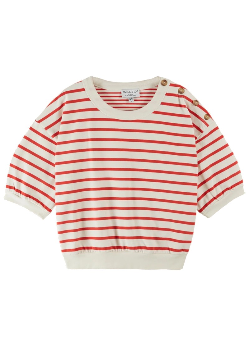 The Emile Et Ida Mariniere sweatshirt in marin rouge is a short-sleeved organic cotton fleece piece featuring classic red and ecru stripes. It offers an oversized fit with extremely soft fabric, a button opening on the raglan sleeve, a round neckline, balloon sleeves, and tone-on-tone ribbed trim.
