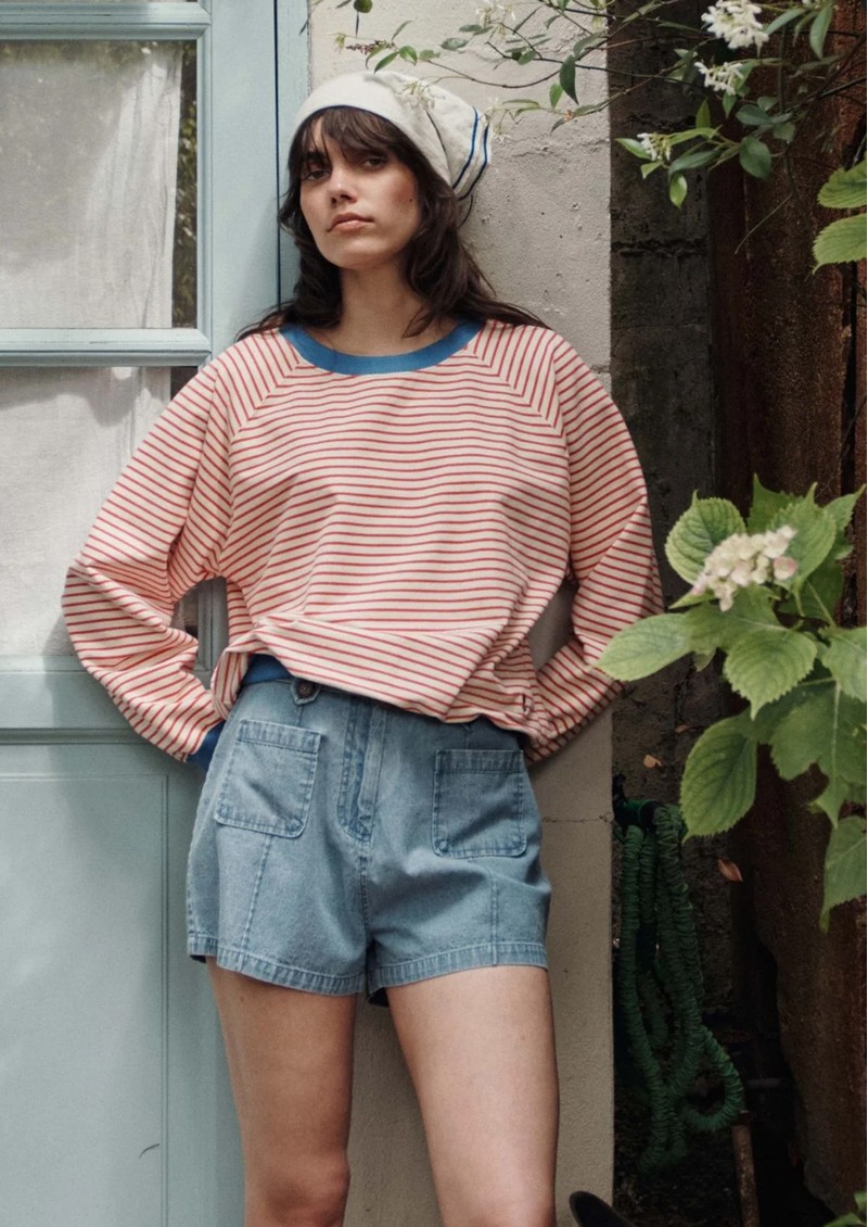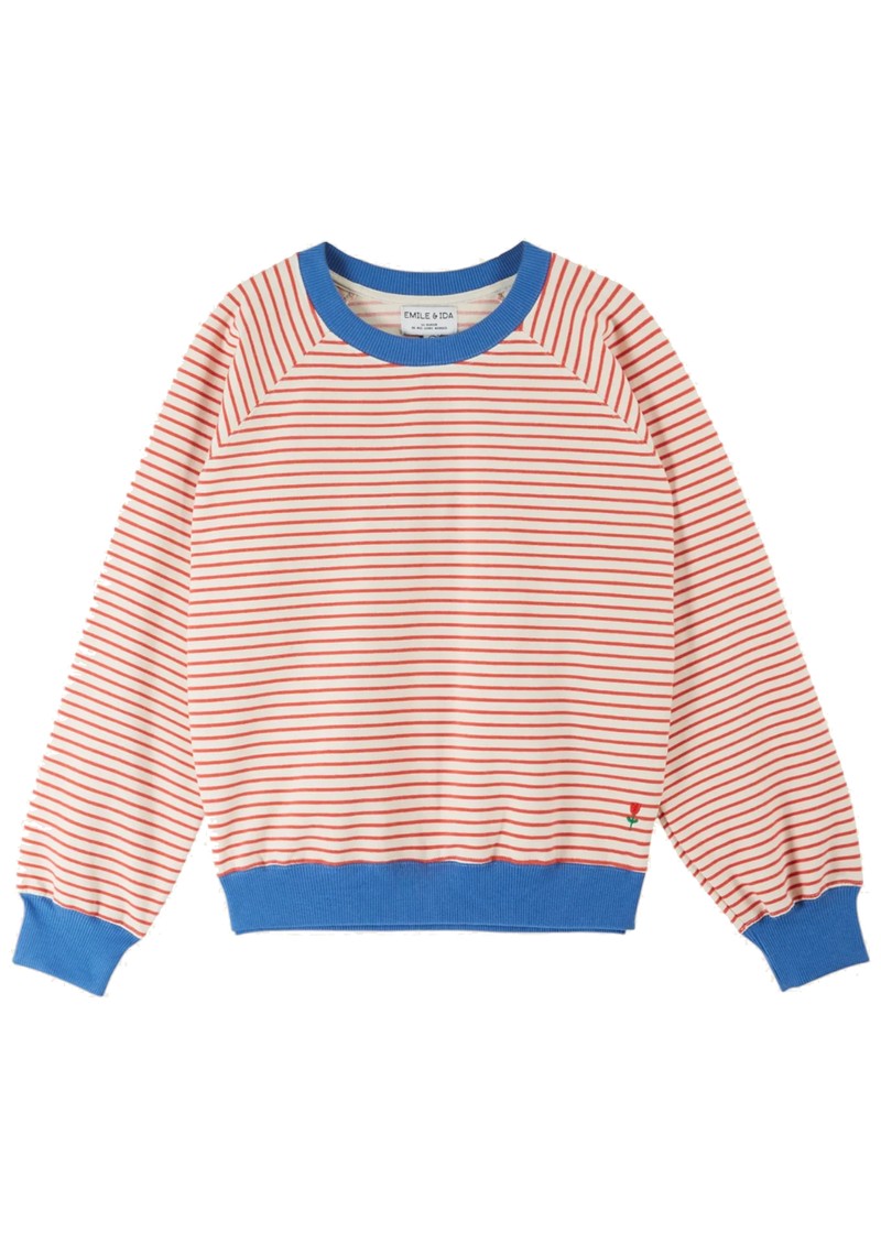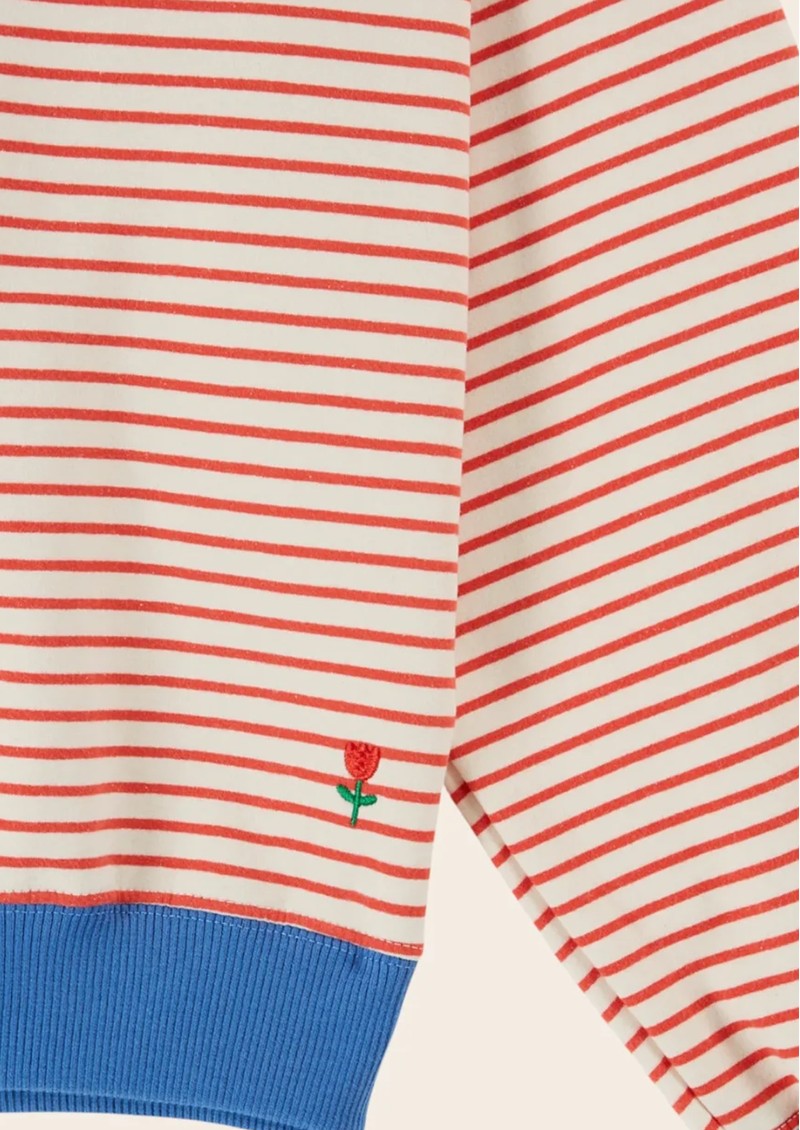 The Emile Et Ida Sweat Rayure is an organic cotton fleece sweatshirt featuring red and ecru stripes, with a playful red tulip embroidered at the hem. It has an oversized, slightly cropped fit, very soft fabric, a round neckline, raglan sleeves, and blue ribbed trim.