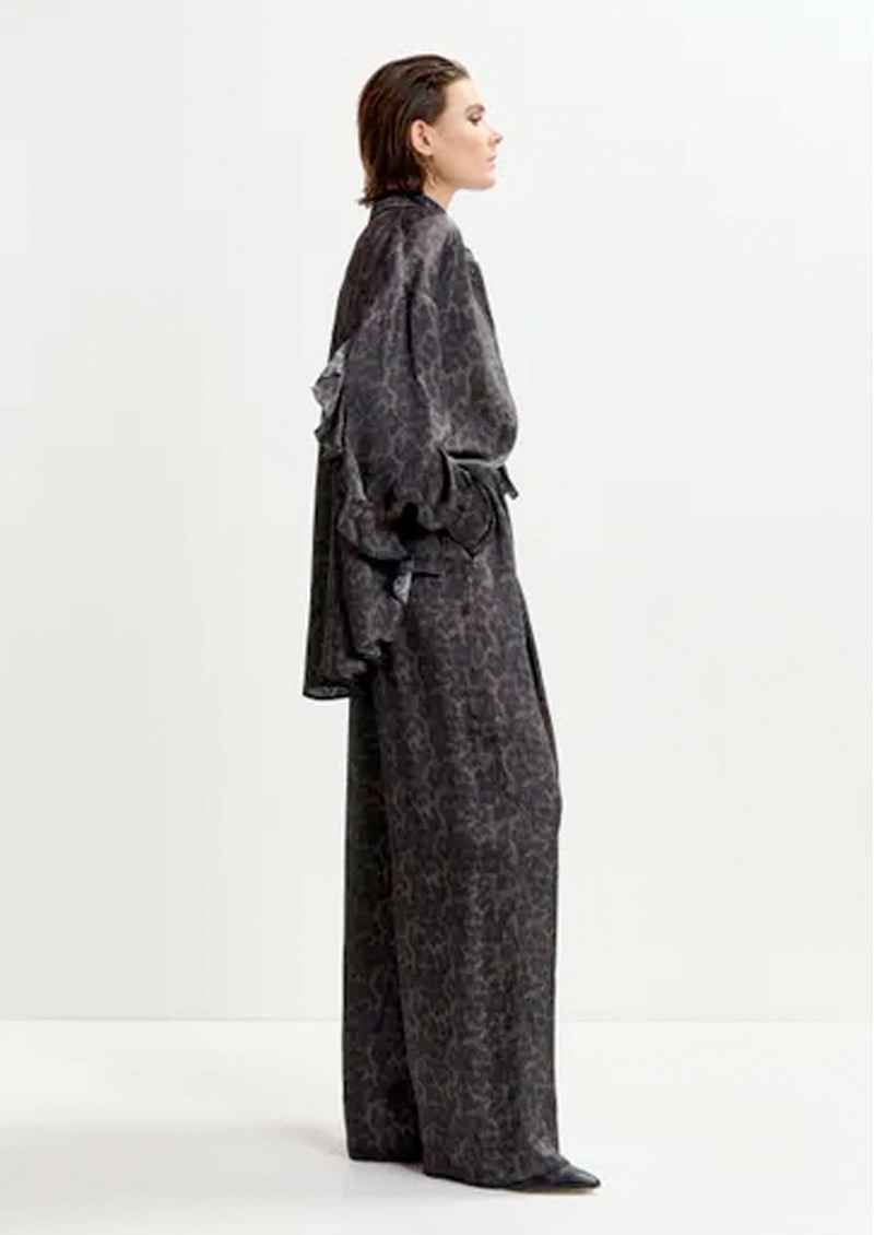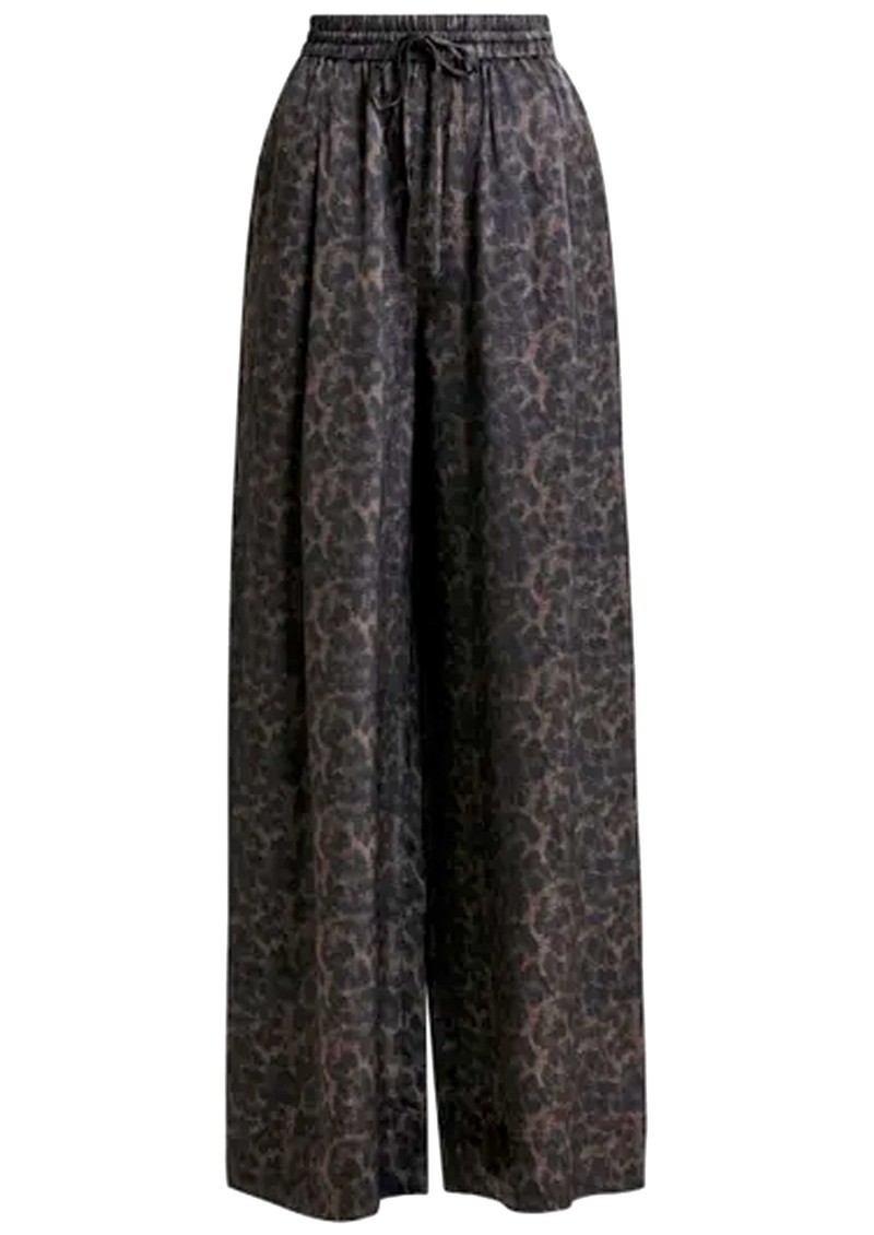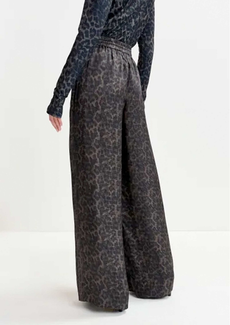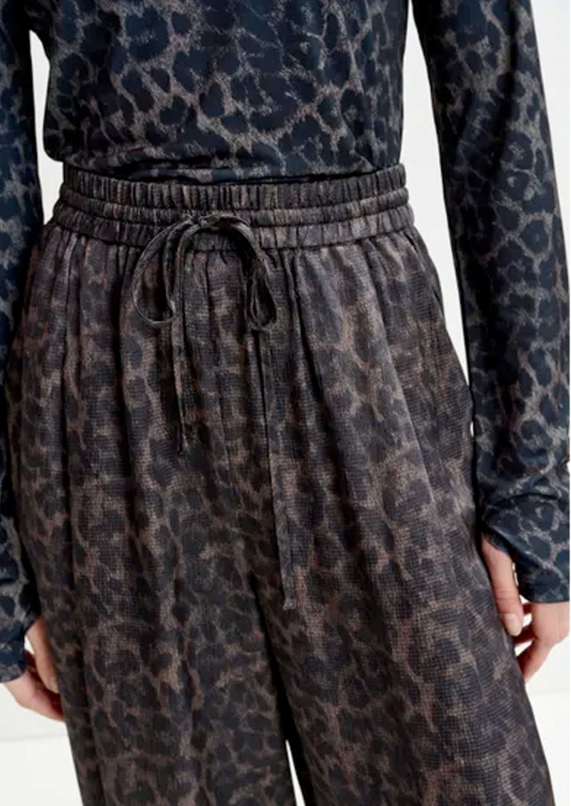 The Essentiel Antwerp Irving Trousers are crafted from lightweight 100% viscose in a black and brown leopard print, designed for a relaxed, wide-leg fit. Featuring a high-rise waist with an elasticated drawstring and slanted pockets, they combine comfort with effortless style.