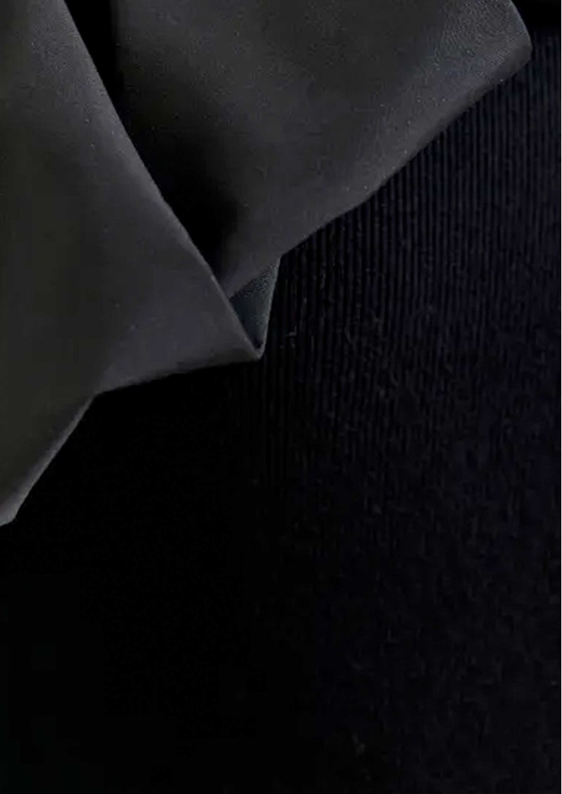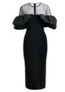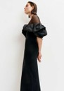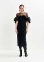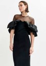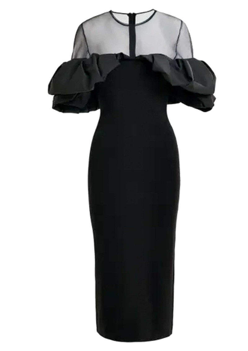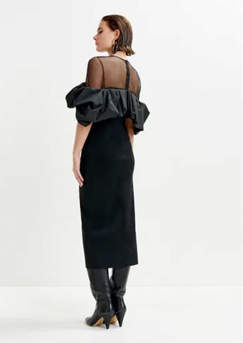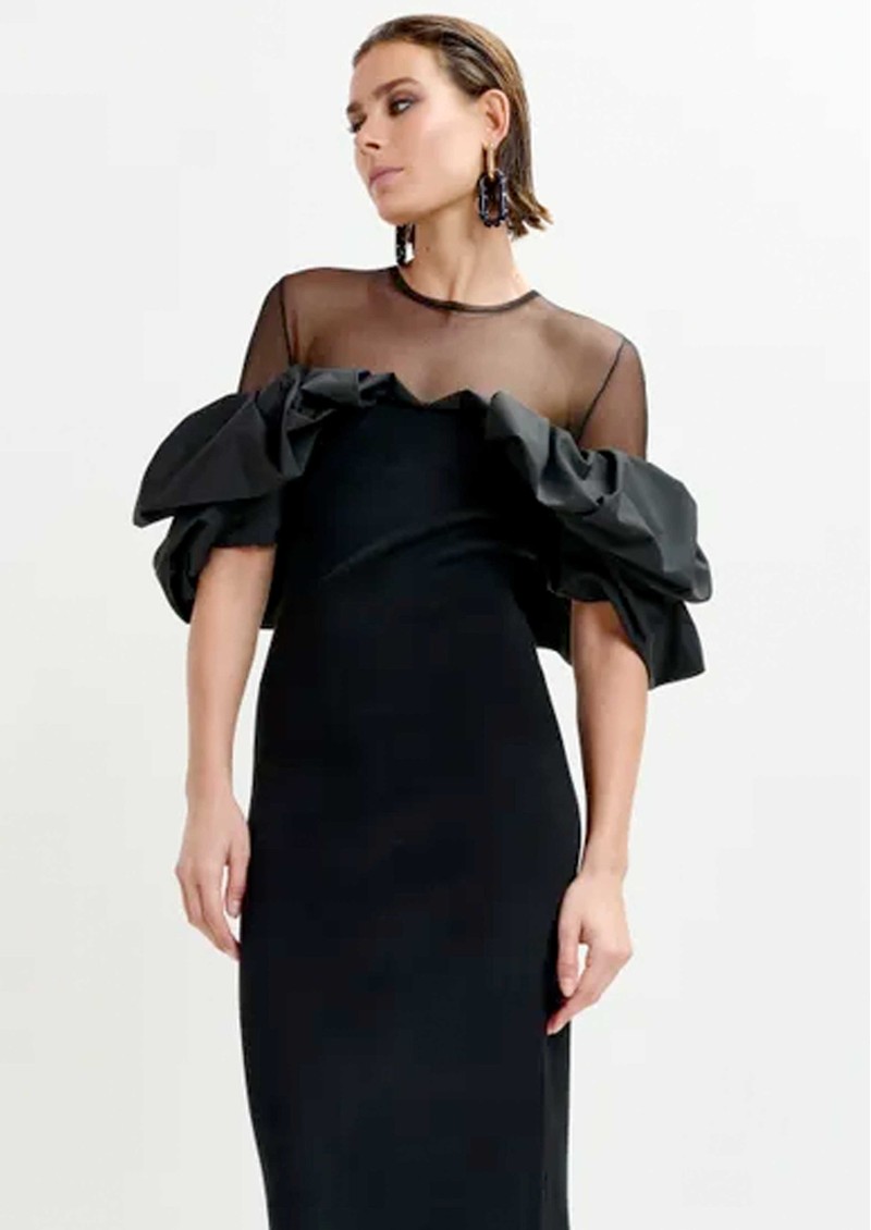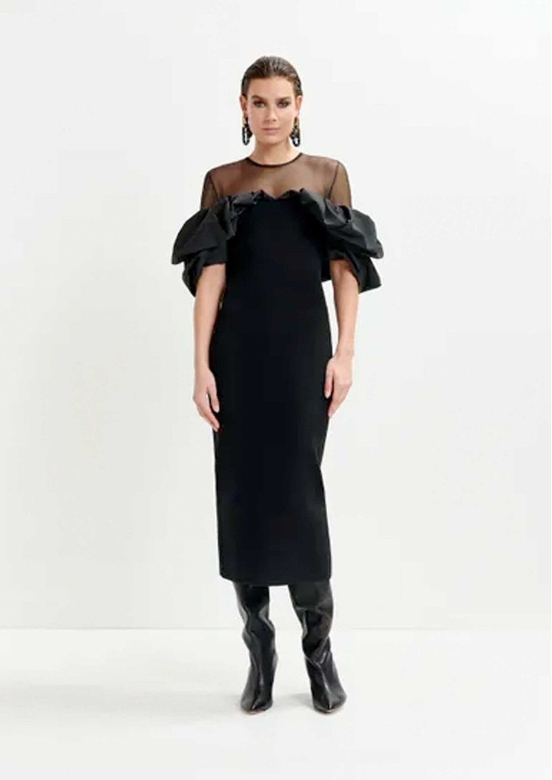 The Essentiel Antwerp Isatis Dress in Black is a striking midi dress featuring a close-fitting ribbed silhouette, voluminous sculptural ruffles across the shoulders, and a sheer tulle yoke and sleeves for a balanced, airy finish. Falling to a straight midi hem, it’s a dramatic and elegant choice for evening occasions.