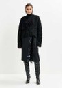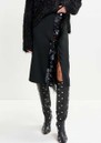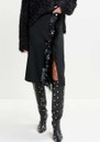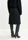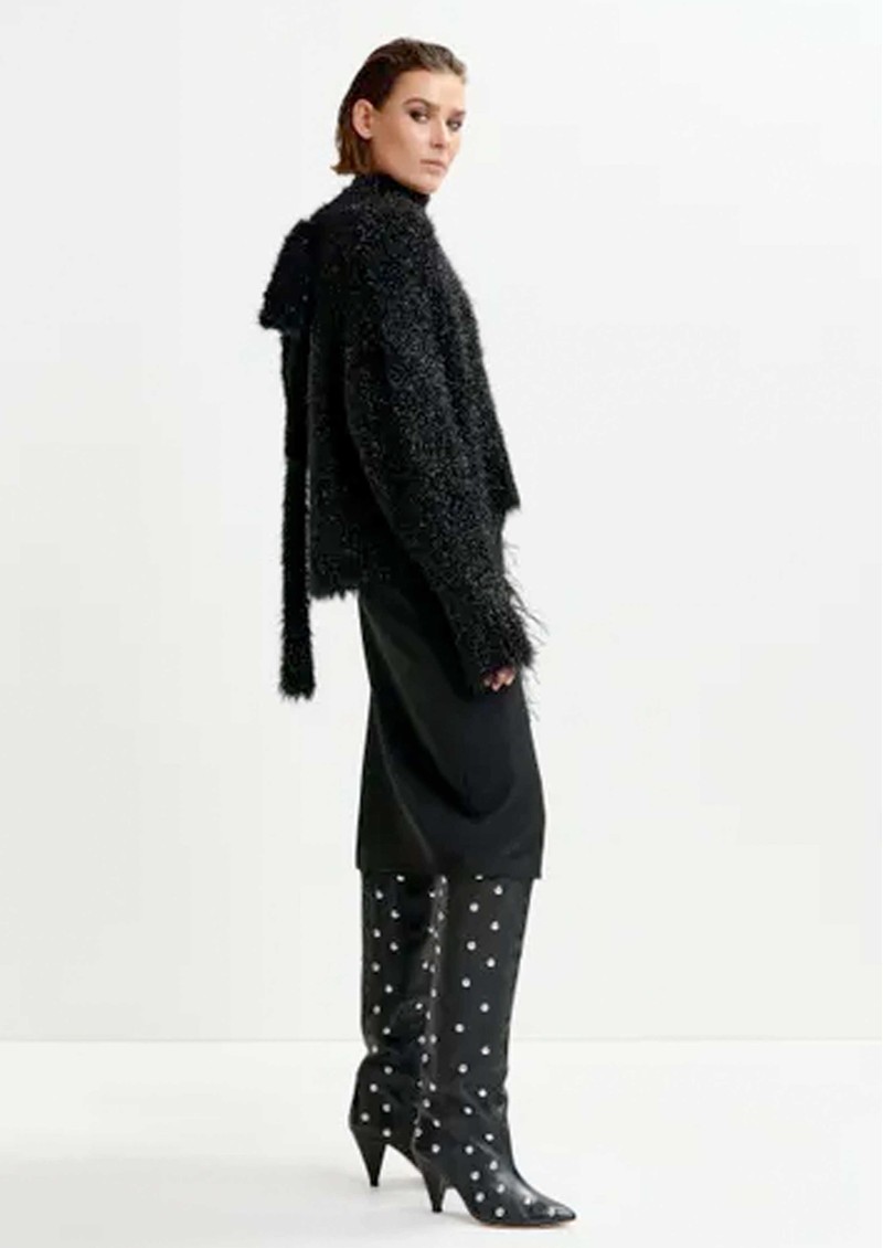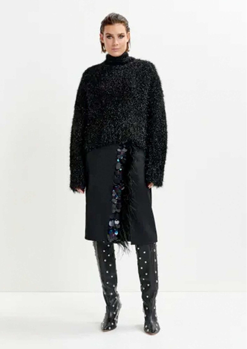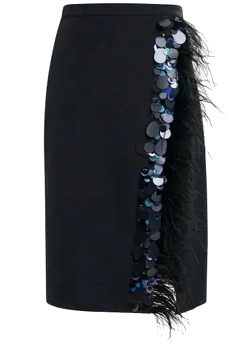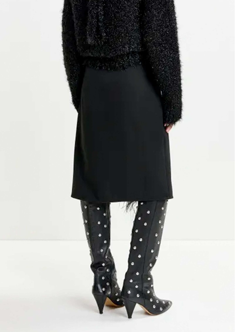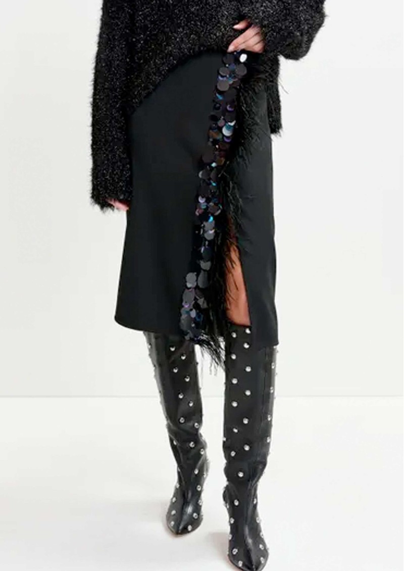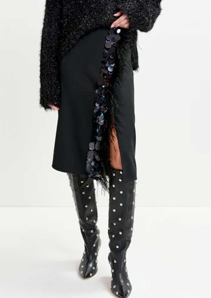 The Essentiel Antwerp Ivil Skirt in Black is a feather-trimmed, embellished midi skirt featuring a straight silhouette, a self-fabric waistband, and a discreet concealed side zip with hook-and-eye fastening. Oversized sequins and rhinestone details cascade down the front, framed by delicate feathers, while a subtle back slit and full lining ensure comfort and ease of movement.