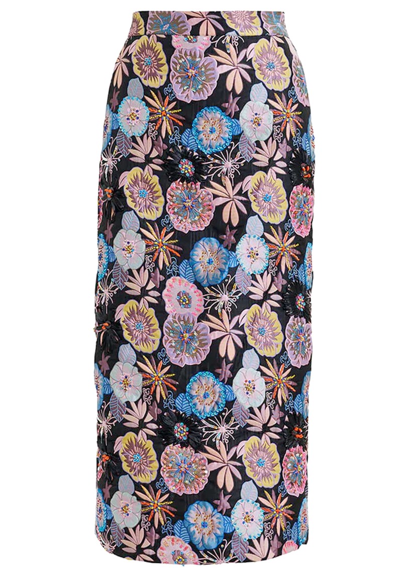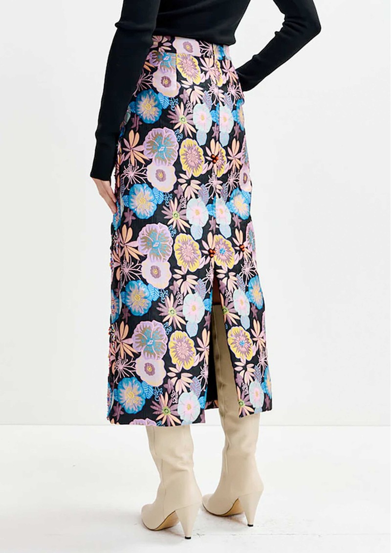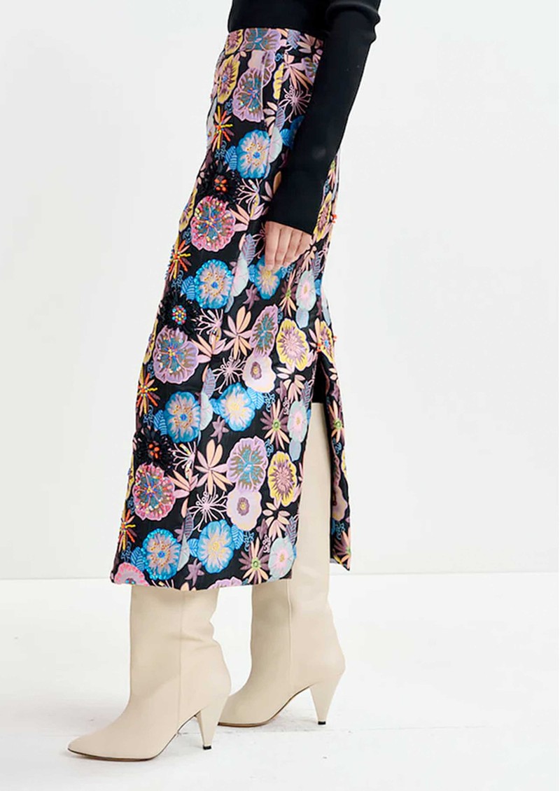 The Essentiel Antwerp Ivymyse Skirt is crafted from structured floral jacquard with sequin and bead embellishments that add texture and sophistication. Designed with a subtle A-line silhouette, it features a concealed back zip, discreet back slit, and full lining for a polished, comfortable fit.