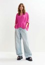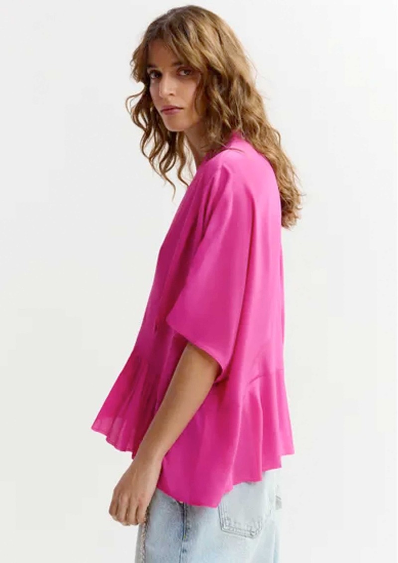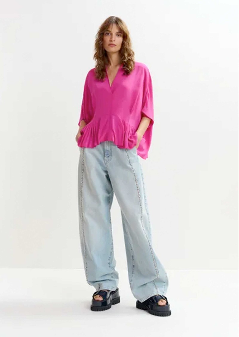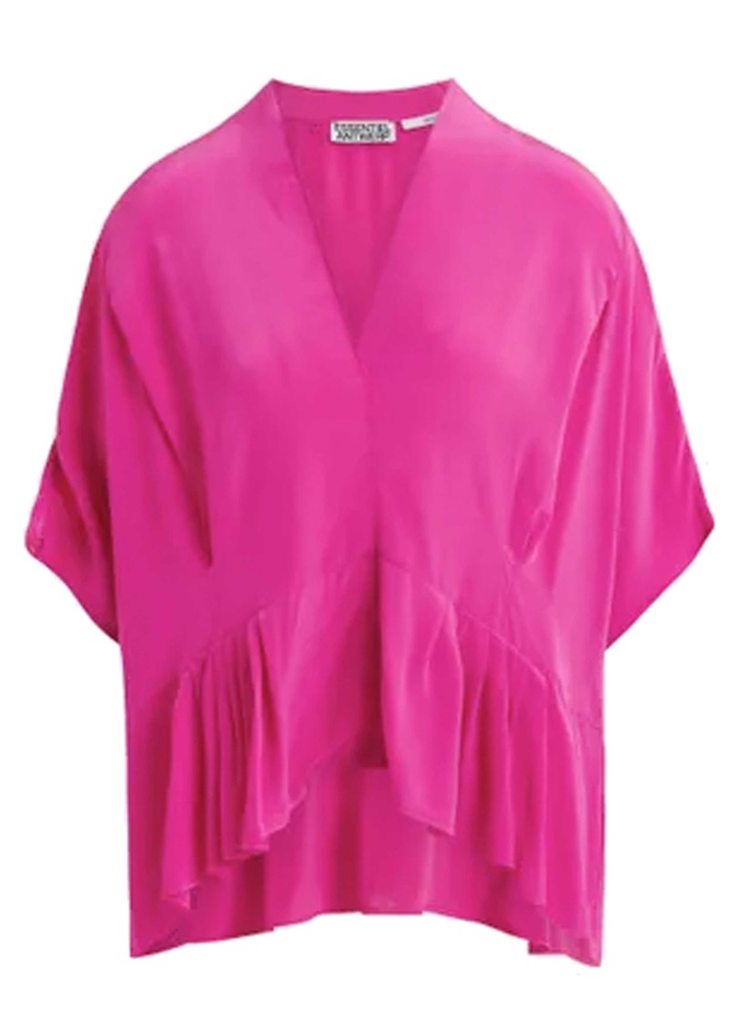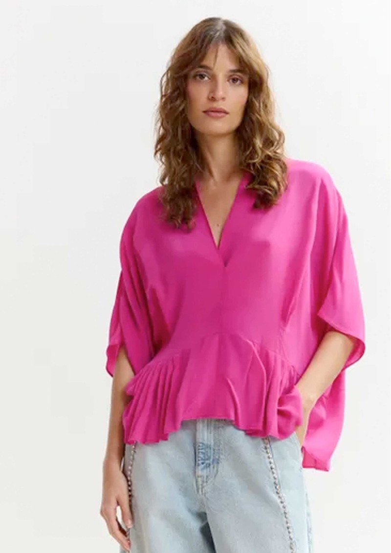 Add a soft, feminine touch with the Essentiel Antwerp Jacaranda Top in Mauve Love - a pink oversized top featuring a V-neckline, batwing sleeves, and a fluttery peplum hemline that creates a graceful, feminine edge.