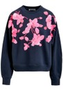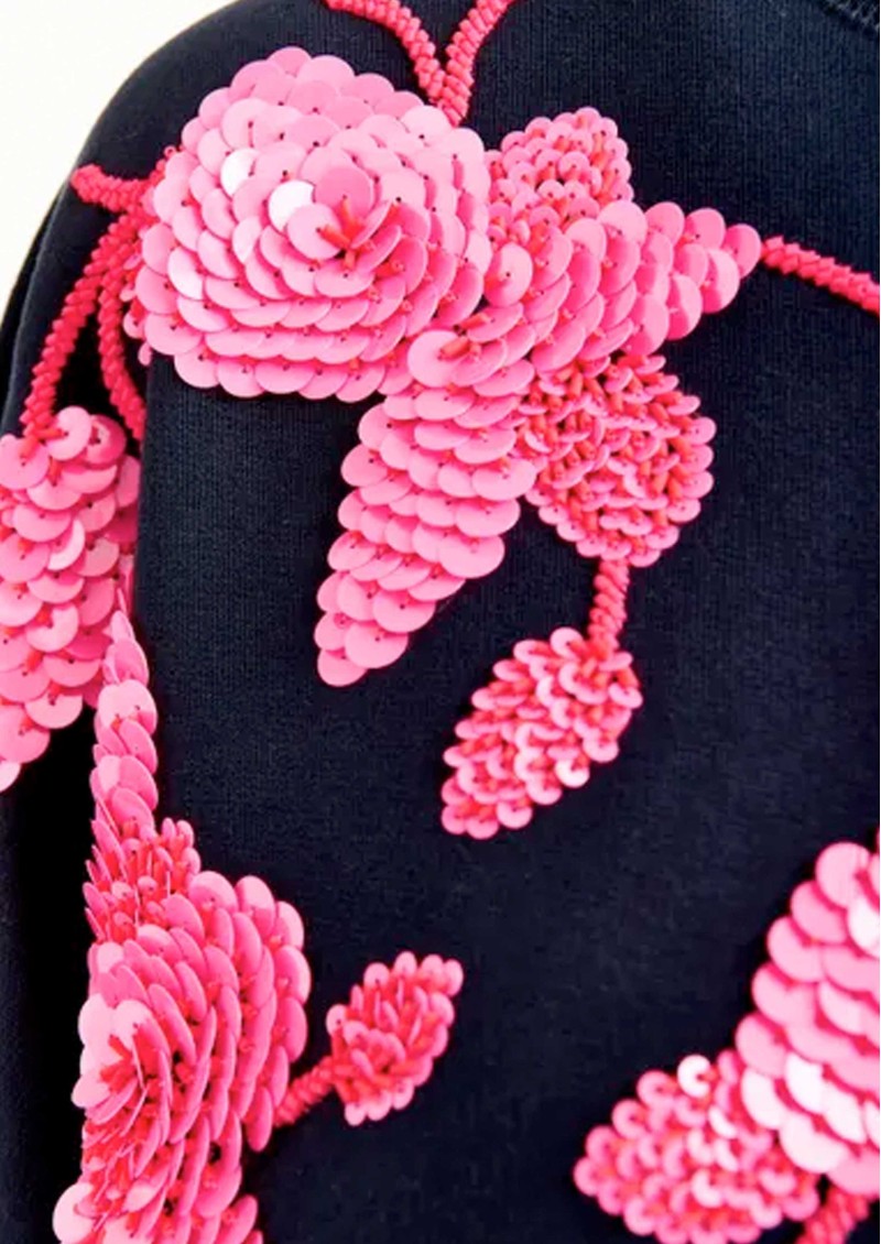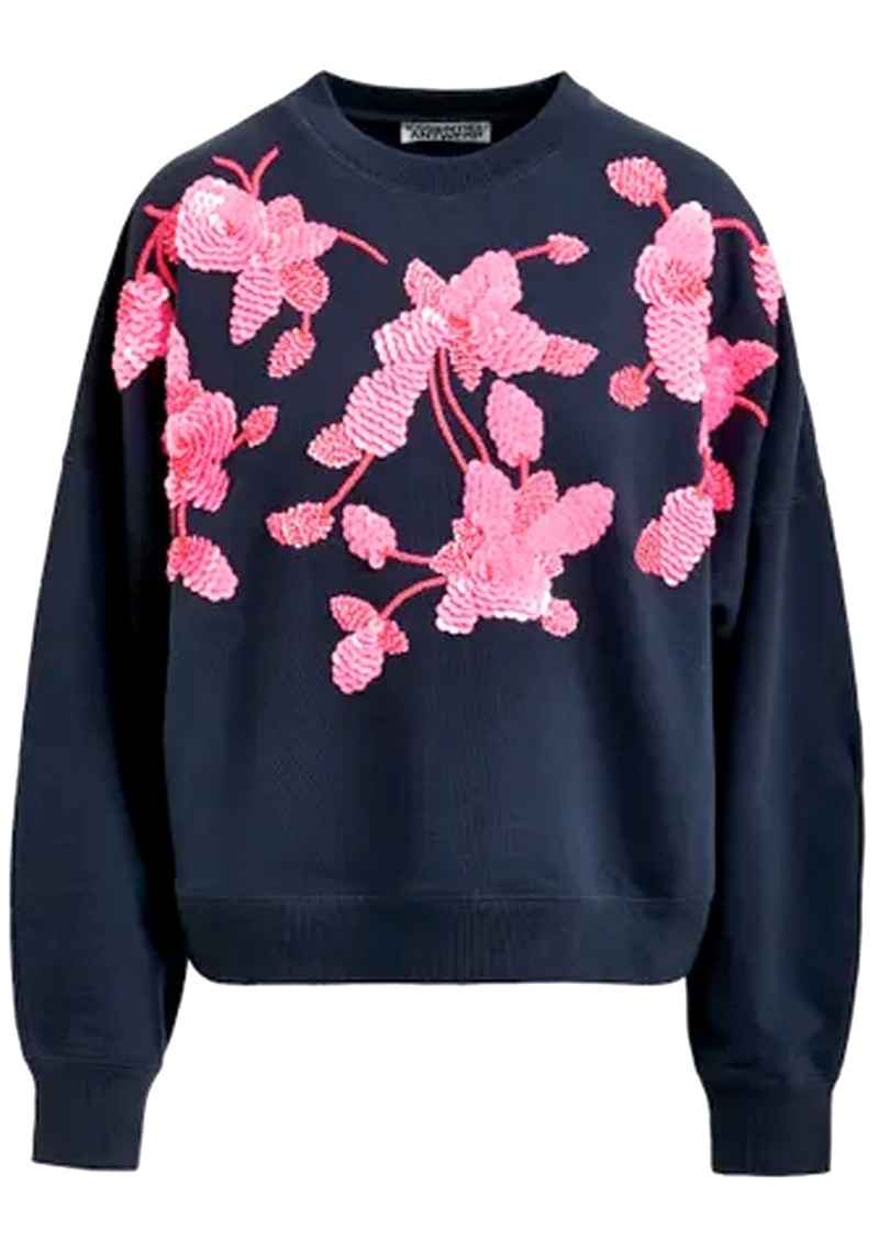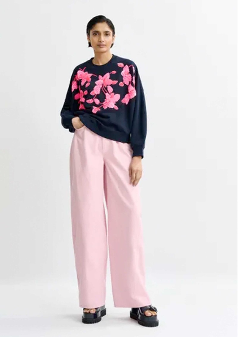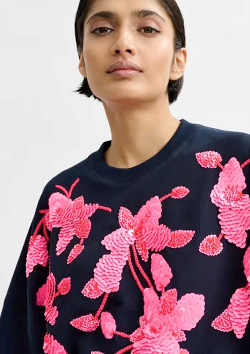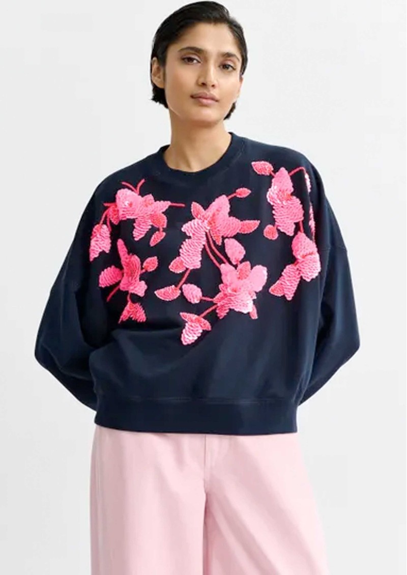 The Essentiel Antwerp Jaga Sequin Sweatshirt in Navy is a relaxed, cotton sweatshirt featuring playful pink floral sequin and bead embroidery. With a crew neckline, dropped shoulders, full-length sleeves, and ribbed edging, it combines casual comfort with a touch of sparkling detail.