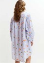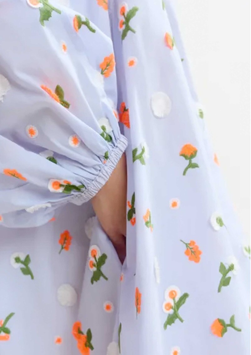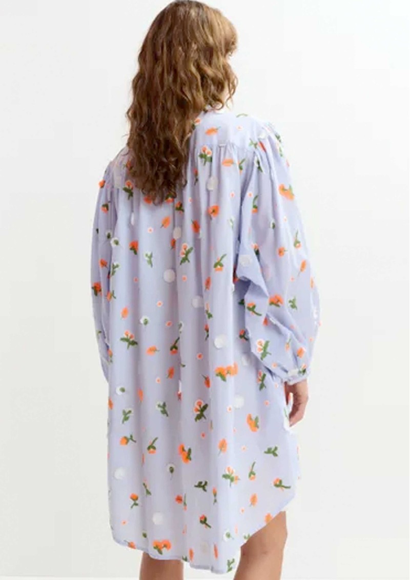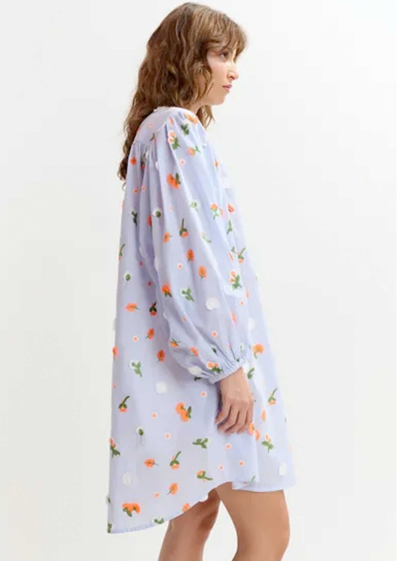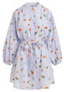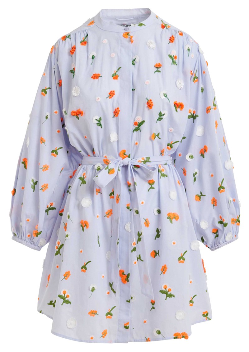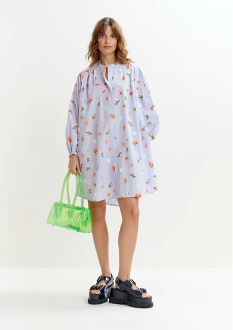 Elevate your casual wardrobe with the Essentiel Antwerp Jalen Shirt Dress - a light blue knee-length dress featuring a mandarin collar, green and orange embellishments, a loose, blousey silhouette, a self-tie fabric waist belt that can be styled on or off, an all-over contrasting floral print, and practical side slit pockets.