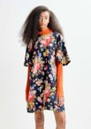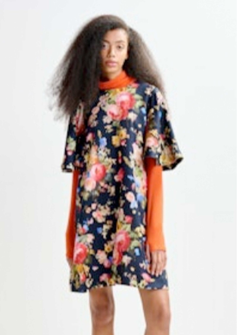 The Essentiel Antwerp Jamie is an A-line mini dress featuring a round neckline, short wide sleeves, and a bold all-over floral print for a fun, statement-making look.
